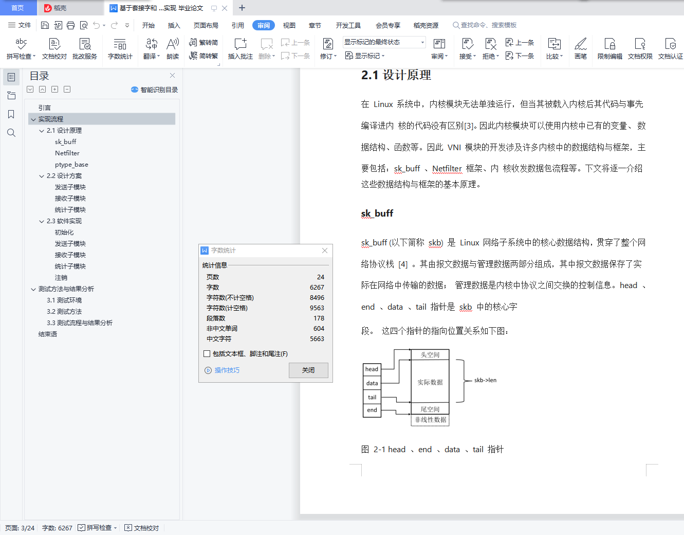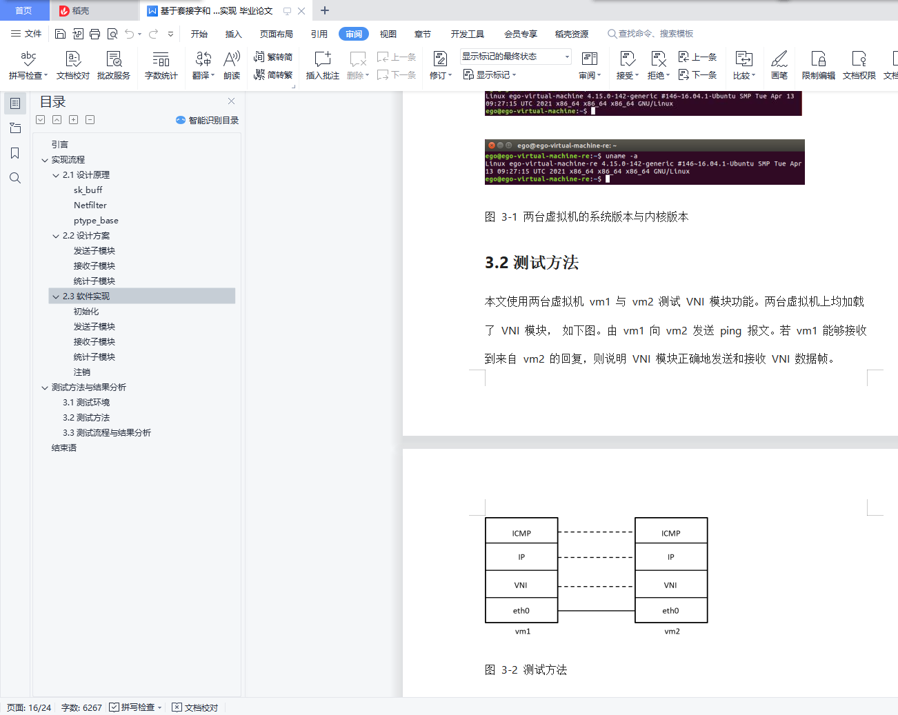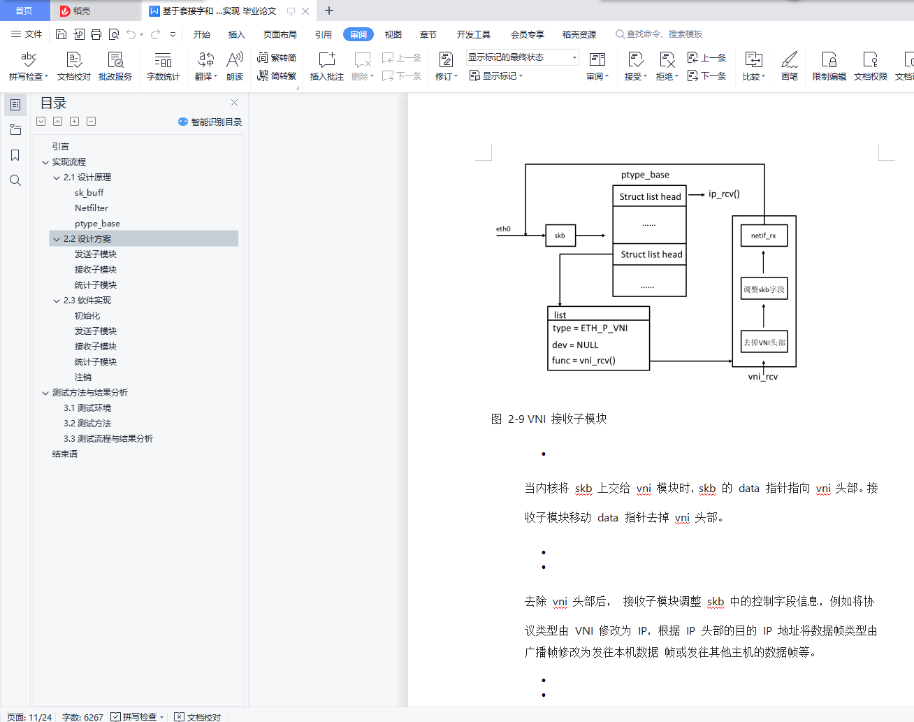 目录引言 1实现流程 22.1设计原理 2sk_buff 2Netfilter 6ptype_base 72.2设计方案 8发送子模块 8接收子模块 10统计子模块 112.3软件实现 11初始化 12发送子模块 13接收子模块 14统计子模块 14注销 15测试方法与结果分析 153.1测试环境 153.2测试方法 163.3测试流程与结果分析 17结束语 24引言如今,TCP/IP 协议栈已经普遍运行在了大多数的计算机设备之上。然而由于科研、生产 的特殊需求,在 TCP/IP 协议栈的基础之上添加定制特定功能的协议栈的需求也日渐流行。在 Linux 系统中,TCP/IP 协议栈位于内核空间中[1]。因此若要在协议栈中添加新协议必须 对内核进行修改。然而, 由于 Linux 内核是一种宏内核, 不同协议功能之间相互耦合,内核 的可扩展性较差。为了克服上述缺点,Linux 引入了内核模块机制,其全称为动态可加载内 核模块(Loadable Kernel Module,LKM)[2]。通过动态加载或卸载外部模块, 开发者可以轻松地 在内核中添加或删除特定功能。 因此编写外部协议功能模块是在 Linux 系统上开发新协议的 有效手段之一。本文的主要工作为实现了一个虚拟网络设备接口(Virtual Network Device Interface,VNI)模 块。其主要功能为在 IP 实体与 MAC 实体之间添加了一个 VNI 实体。发送方在 IP 包前封装一 个 VNI 头部, 并用 MAC 帧 (802.3 帧) 承载发送, 帧格式如图 1-1,其中 VNI 头部的 seq 字 段从零开始递增。接收方去掉 VNI 头部上交给 IP 模块。