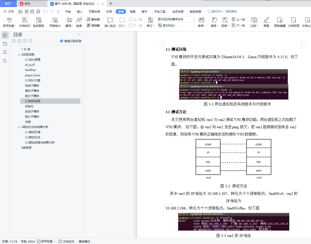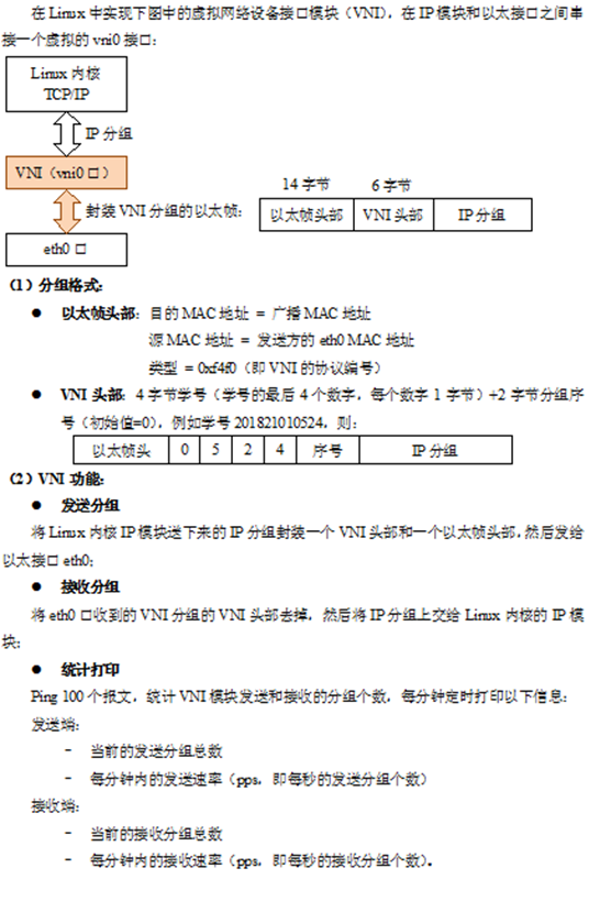 摘 要:本文实现了一个可动态加载至 Linux 内核的网络设备接口模块。该模块利用 Netfilter 框架注册 VNI 发送函数,将 IP 报文封装在 VNI 数据帧中并调用以太网口发送。相应地,该模块在内核中注册 VNI 接收函数,去除 VNI 头部,将数据包上交给 IP 模块。关键词:Linux 内核模块编程;sk_buff;Netfilter;网络设备接口目录1 引 言 12 实现流程 22.1 设计原理 2sk_buff 2Netfilter 4ptype_base 52.2 设计方案 6发送子模块 6接收子模块 7统计子模块 72.3 软件实现 7初始化 8发送子模块 8统计子模块 8注销 83 测试方法与结果分析 83.1 测试环境 93.2 测试方法 93.3 测试流程与结果分析 104 结束语 14