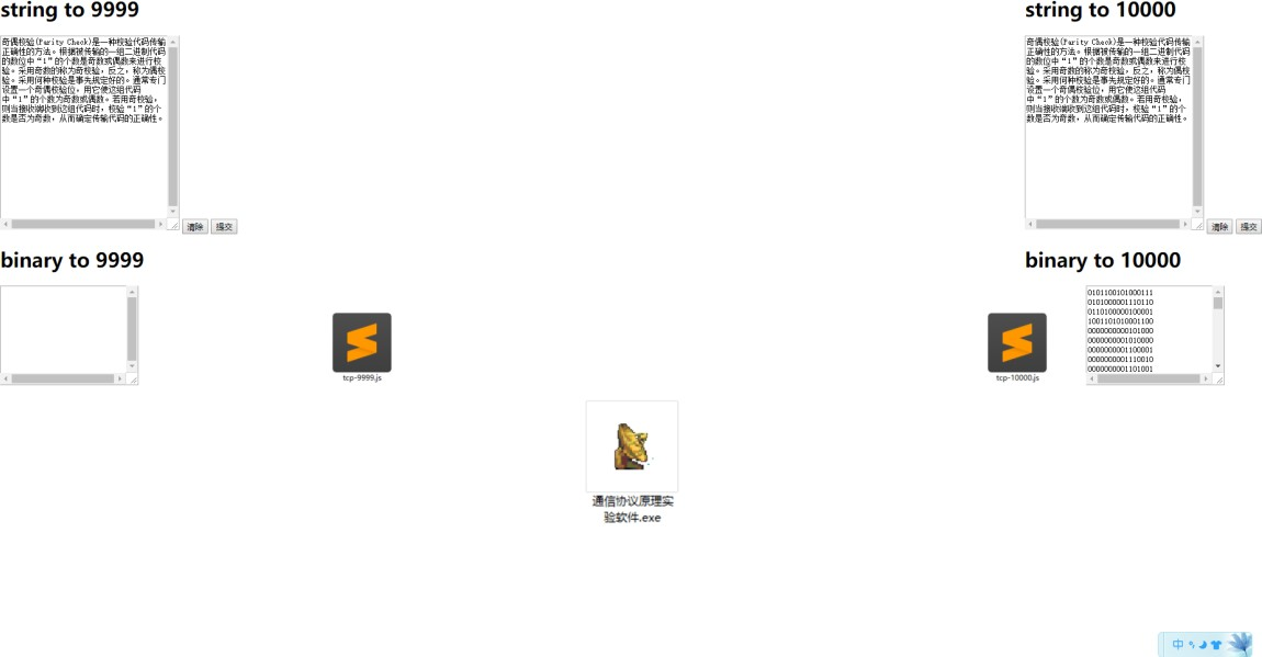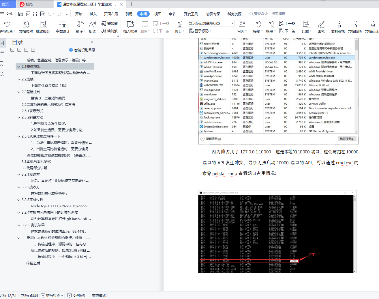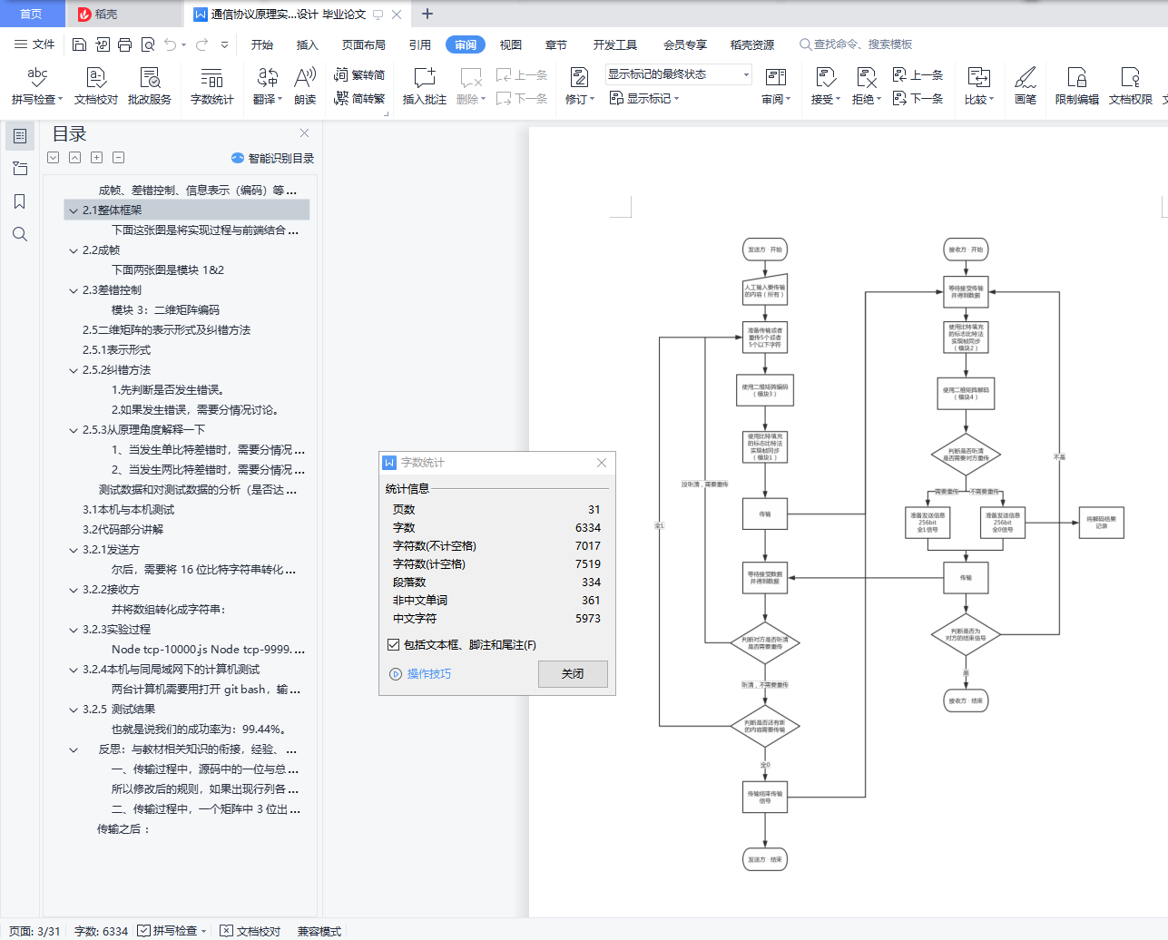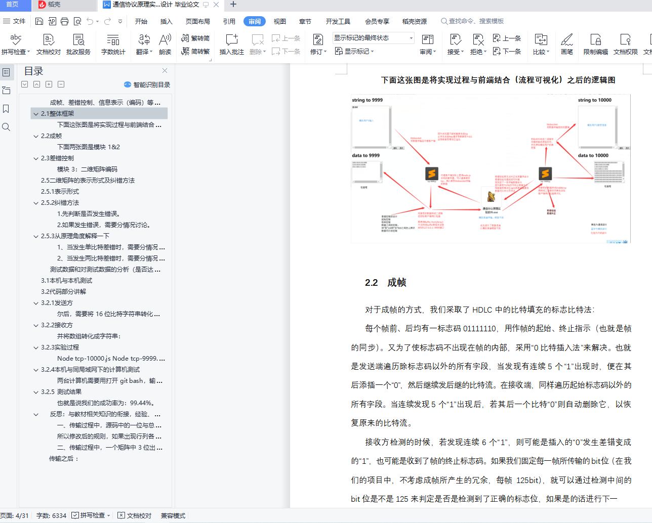 一、分工情况 2二、 成帧、差错控制、信息表示(编码)等技术的完整解决方案 22.1整体框架 22.2成帧 42.3差错控制 62.5二维矩阵的表示形式及纠错方法 82.5.1表示形式 82.5.2纠错方法 92.5.3从原理角度解释一下 10三、 信息表示(编码) 11四、 测试数据和对测试数据的分析(是否达到功能要求) 113.1本机与本机测试 113.2代码部分讲解 143.2.1发送方 143.2.2接收方 173.2.3实验过程 183.2.4本机与同局域网下的计算机测试 213.2.5测试结果 27五、 反思:与教材相关知识的衔接,经验、教训、收获、体会等 28小组分工情况在项目实现的前期,我们小组采取了纵向的分工方式,XXX和XXX负责成帧、差错控制、信息表示(编码)等技术的完整解决方案,XXX负责用nodejs 的代码实现,XXX在编程的过程中也对编码的方式进行了优化。后期,我们一起完成了对测试数据的分析,寻找当前方案所出现的精度问题,并提出了更优化的解决方案。成帧、差错控制、信息表示(编码)等技术的完整解决方案2.1整体框架首先,我们用流程图的方式将整体的实现过程表示出来,其中有四个模块,模块 1&2 分别是发送方和接收方的成帧过程的实现。模块 3&4 分别是发送方和接收方的差错控制的实现过程。这个流程图其实只能显示单工的过程,但是我们在最后的实现过程发现, 只要是接收方和发送方对于同一字段的定义不产生冲突(也就是不出现:发送方发送全 1bit 流表示发送结束,接收方发送全 1bit 流表示需要重传),就完全可以实现双工通信,也就是接收方和发送方跑的是同一段程序。
