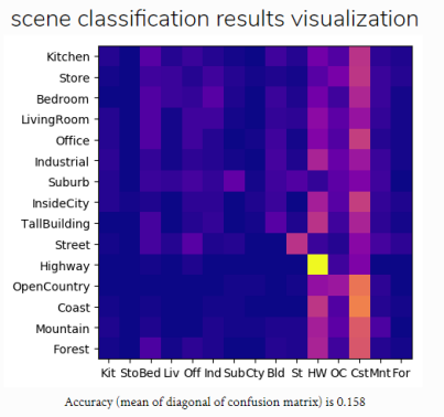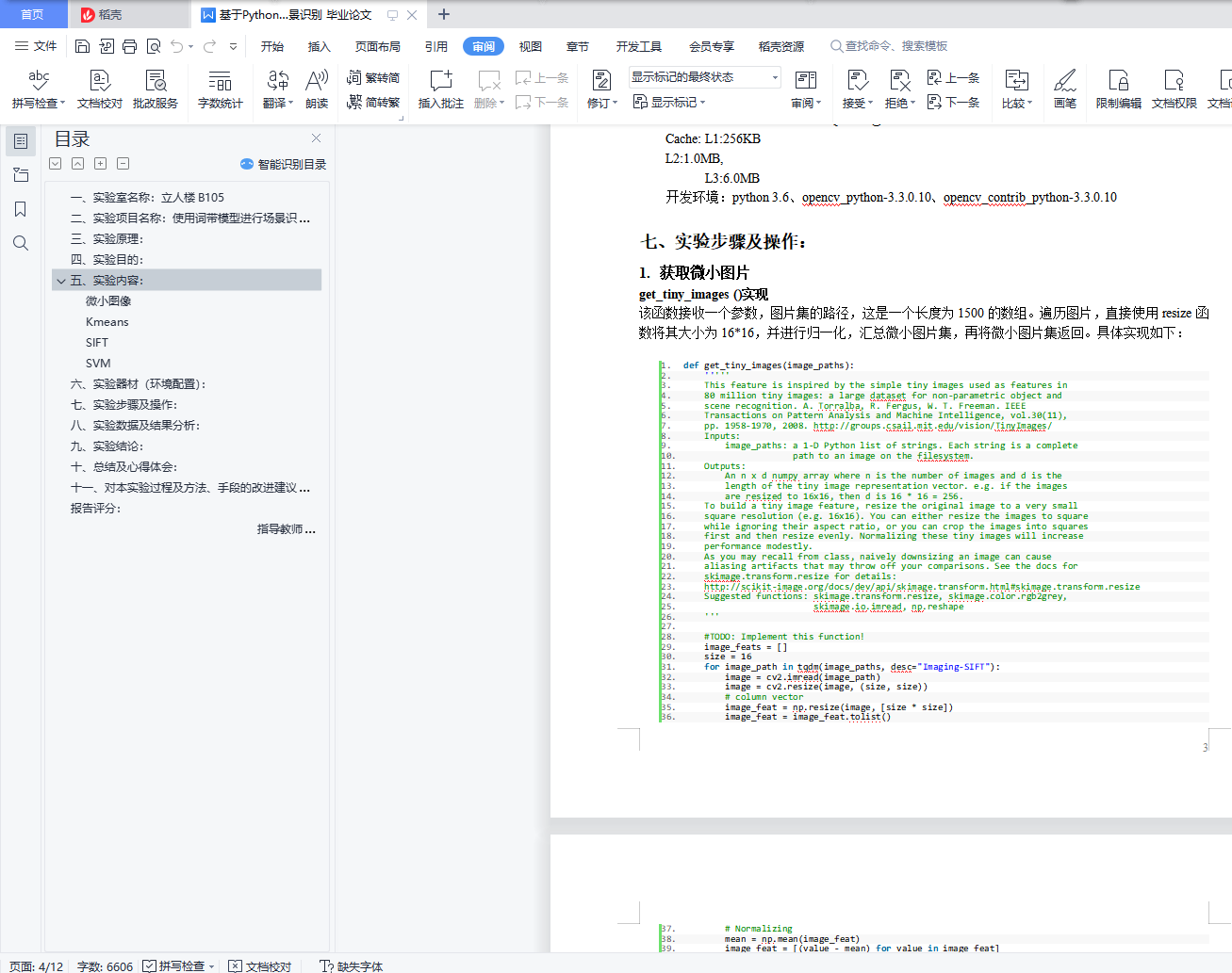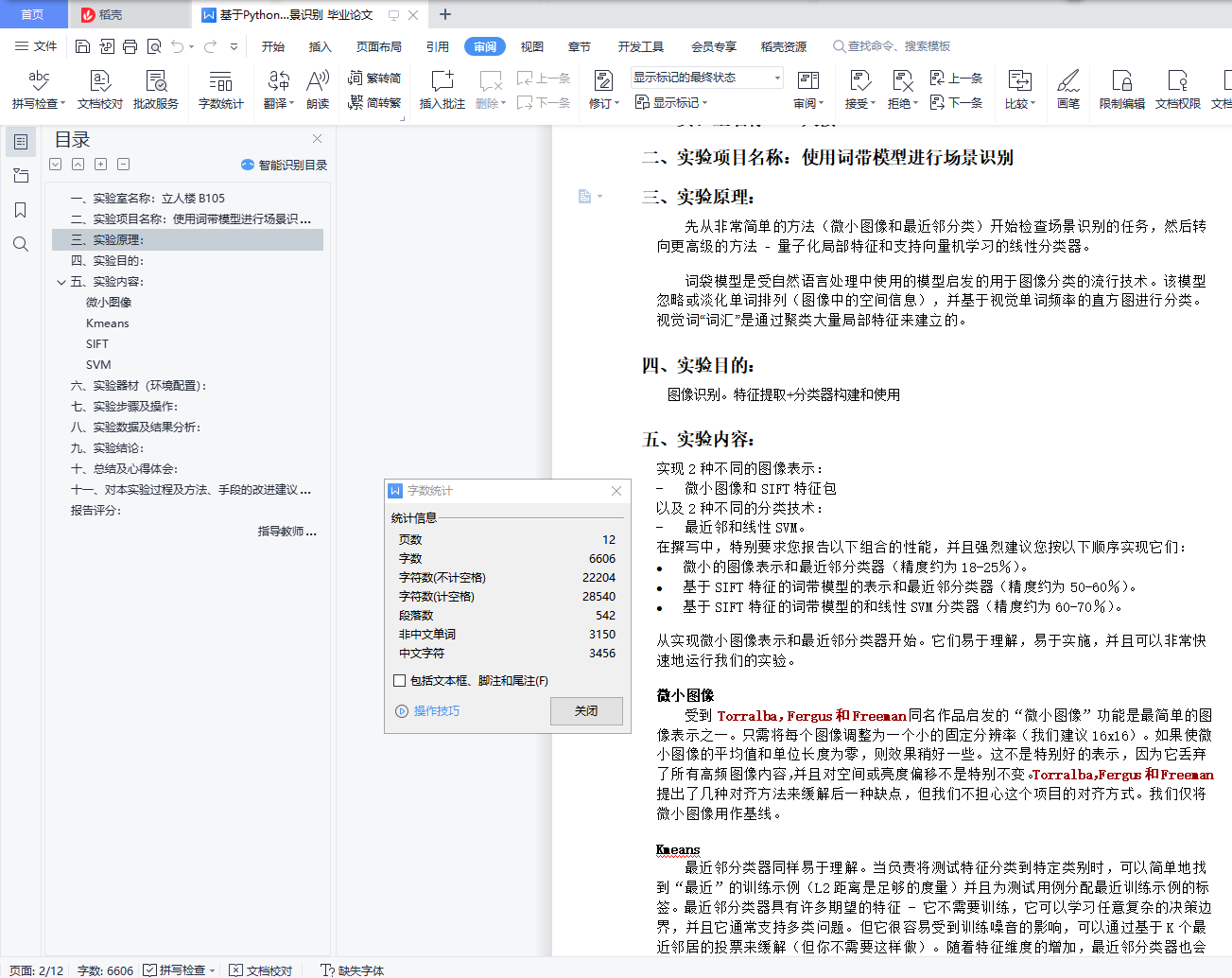 目录一、实验室名称:立人楼B105 0二、实验项目名称:使用词带模型进行场景识别 0三、实验原理: 0四、实验目的: 0五、实验内容: 1微小图像 1Kmeans 1SIFT 1SVM 2六、实验器材(环境配置): 2七、实验步骤及操作: 3八、实验数据及结果分析: 9九、实验结论: 11十、总结及心得体会: 11十一、对本实验过程及方法、手段的改进建议: 11报告评分: 11指导教师签字: 11一、实验室名称:立人楼B105二、实验项目名称:使用词带模型进行场景识别三、实验原理:先从非常简单的方法(微小图像和最近邻分类)开始检查场景识别的任务,然后转向更高级的方法 - 量子化局部特征和支持向量机学习的线性分类器。词袋模型是受自然语言处理中使用的模型启发的用于图像分类的流行技术。该模型忽略或淡化单词排列(图像中的空间信息),并基于视觉单词频率的直方图进行分类。视觉词“词汇”是通过聚类大量局部特征来建立的。四、实验目的:图像识别。特征提取+分类器构建和使用五、实验内容:实现2种不同的图像表示:- 微小图像和SIFT特征包以及2种不同的分类技术:- 最近邻和线性SVM。在撰写中,特别要求您报告以下组合的性能,并且强烈建议您按以下顺序实现它们:微小的图像表示和最近邻分类器(精度约为18-25%)。基于SIFT特征的词带模型的表示和最近邻分类器(精度约为50-60%)。基于SIFT特征的词带模型的和线性SVM分类器(精度约为60-70%)。从实现微小图像表示和最近邻分类器开始。它们易于理解,易于实施,并且可以非常快速地运行我们的实验。