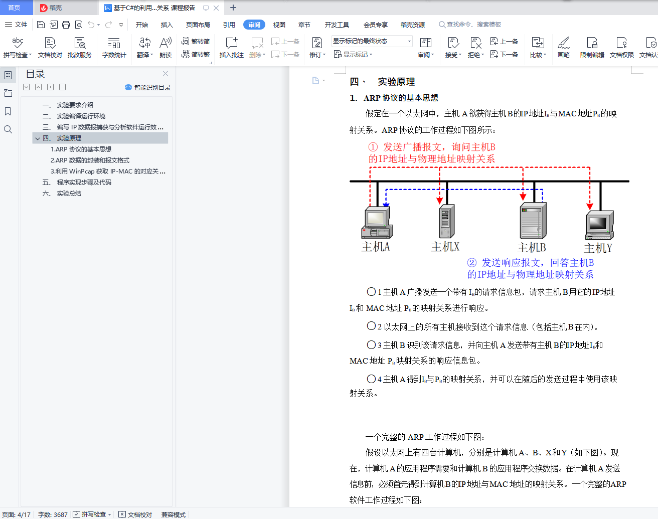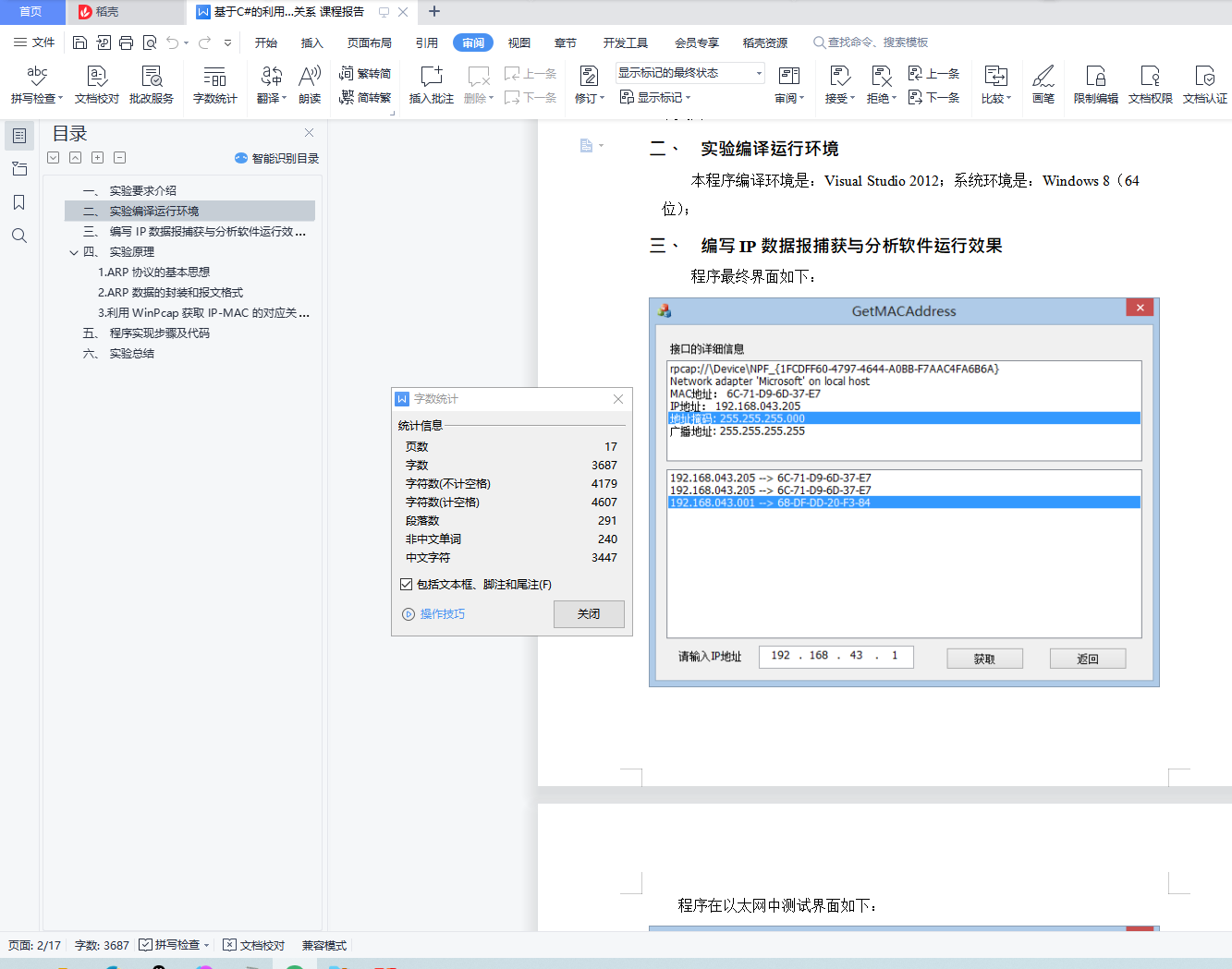 目录一、 实验要求介绍 1二、 实验编译运行环境 1三、 编写 IP 数据报捕获与分析软件运行效果 1四、 实验原理 41. ARP 协议的基本思想 42. ARP 数据的封装和报文格式 63. 利用 WinPcap 获取 IP-MAC 的对应关系 7五、 程序实现步骤及代码 10六、 实验总结 18一、 实验要求介绍在以太网中,获取 MAC 地址常常是其他工作的前提。本实验要求利用WinPcap 提供的功能获取以太网中主机的 MAC 地址。通过本实验不但可以学习 ARP 的工作过程,而且可以深入了解 IP 地址和 MAC 地址的有关概念。本实验的目的是获取以太网中主机的 MAC 地址,因此以太网在该实验中是必不可少的。本实验使用的以太网既可以是共享式以太网,也可以是交换式以太网。二、 实验编译运行环境本程序编译环境是:Visual Studio 2012;系统环境是:Windows 8(64 位);