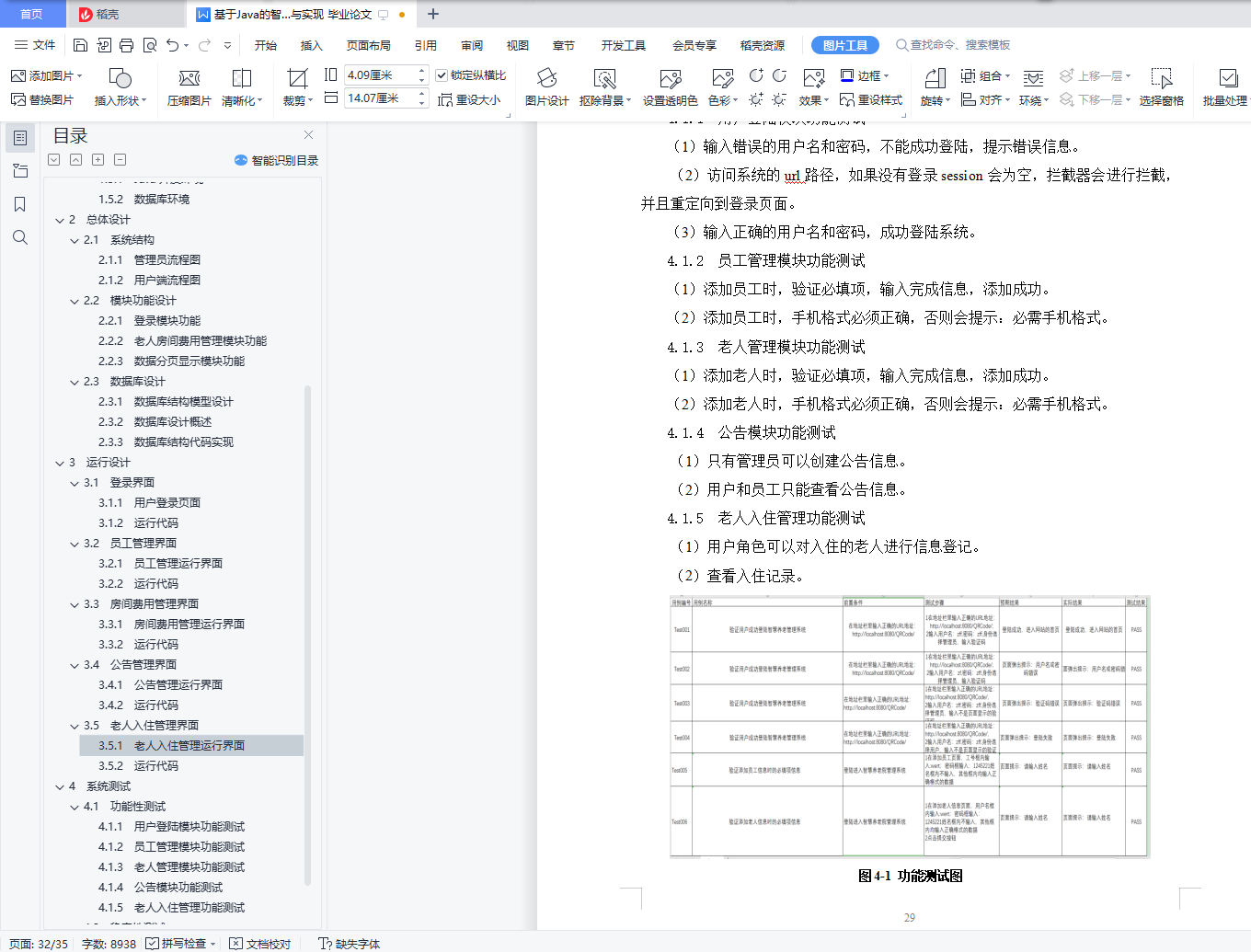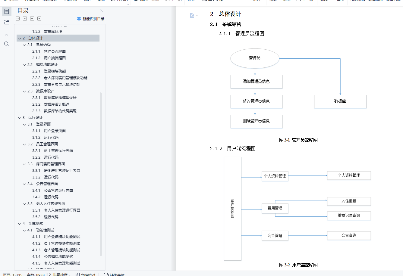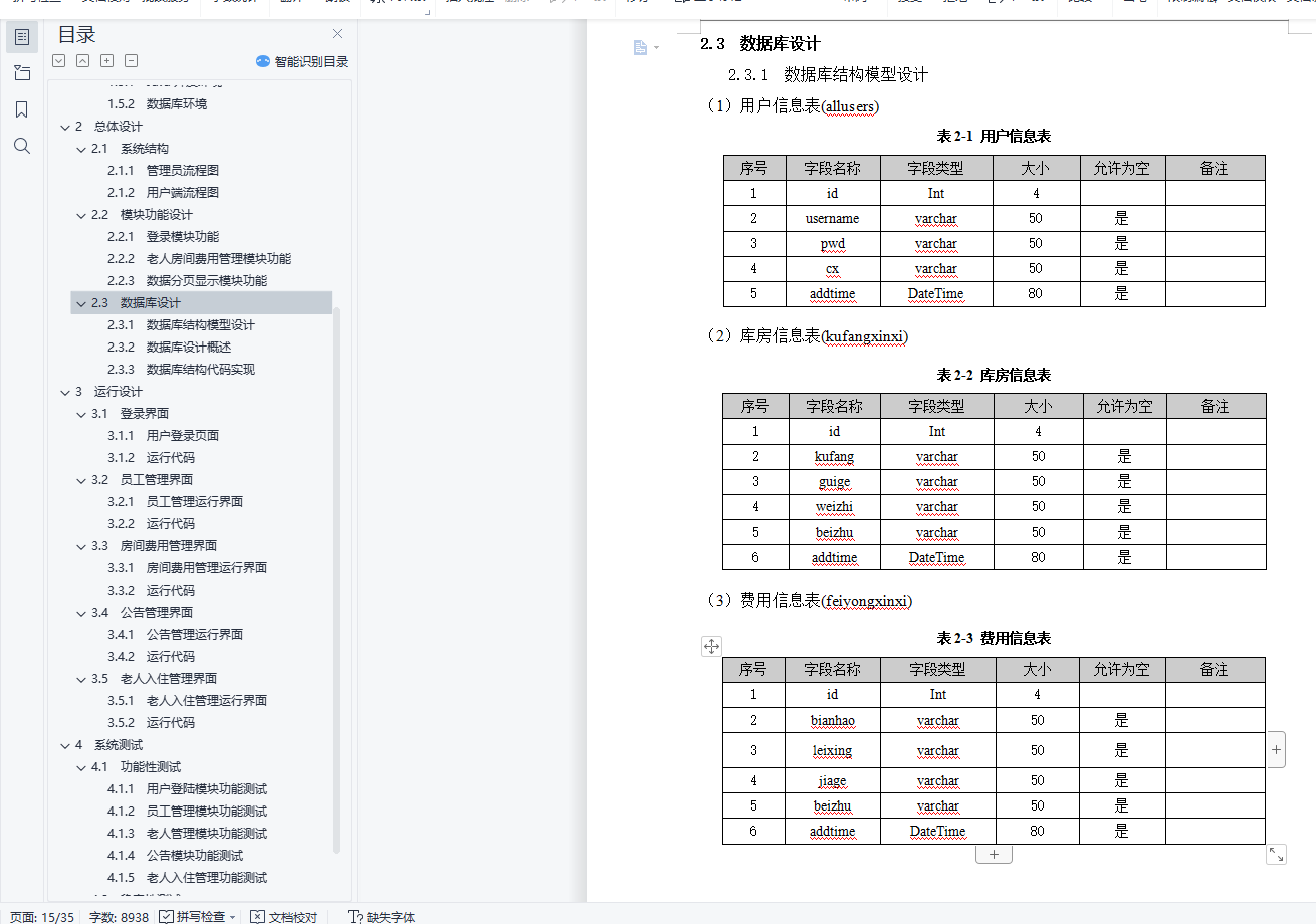 摘 要随着我国老龄化程度的加剧,机构养老服务的需求会越来越多。在政府的大力支持下,养老机构的建设规模也会越来越大,功能也会越来越全,对养老机构的管理也会提出更高的要求。使用传统人工的方式管理养老院,这种管理方式存在着许多缺点,如:效率低、保密性差,另外时间一长,将产生大量的文件和数据,这对于查找、更新和维护都带来了不少的困难。本智慧养老管理系统是针对目前养老院信息管理的实际需求,从实际工作出发,对过去的养老院信息管理系统存在的问题进行分析,结合计算机系统的结构、概念、模型、原理、方法,在计算机各种优势的情况下,采用目前最流行的B/S结构和Java中流行的MVC三层设计模式和MyEclipse编辑器、SQL Server数据库设计并实现的。本系统是根据智慧养老管理等相关的业务流程和需求设计并实现,采用计算机进行信息化数据管理和展示,提高了管理的方便性、安全性等,也适应了当今社会信息化高速发展的特征。关键词: 智慧养老管理系统; Java编程技术; SQL Server数据库目 录1 系统概述 11.1 设计目的 11.2 设计思路 11.3 系统需求分析 11.3.1 模块分析 11.3.2 技术选型 21.4 开发环境 21.4.1 Html简介 21.4.2 SQL Server简介 21.4.3 Spring简介 31.4.4 SpringBoot简介 41.4.6 Javascript简介 41.4.5 JSP简介 41.5 运行环境 51.5.1 Java开发环境 51.5.2 数据库环境 72 总体设计 102.1 系统结构 102.1.1 系统总体流程图 102.1.2 管理员端流程图 102.2 模块功能设计 112.2.1 登录模块功能 112.2.3 老人房间费用管理模块功能 112.2.4 数据分页显示模块功能 112.3 数据库设计 122.3.1 数据库结构模型设计 122.3.2 数据库设计概述 142.3.3 数据库结构代码实现 143 运行设计 183.1 登录界面 183.1.1 用户登录页面 183.1.2 运行代码 183.2 员工管理界面 213.2.1 员工管理运行界面 213.2.2 运行代码 213.3 房间费用管理界面 233.3.1 房间费用管理运行界面 233.3.2 运行代码 233.4 公告管理界面 253.4.1 公告管理运行界面 253.4.2 运行代码 253.5 老人入住管理界面 263.5.1 老人入住管理运行界面 263.5.2 运行代码 264 系统测试 294.1 功能性测试 294.1.1 用户登陆模块功能测试 294.1.2 员工管理模块功能测试 294.1.3 老人管理模块功能测试 294.1.4 公告模块功能测试 294.1.5 老人入住管理功能测试 294.2 稳定性测试 304.3 安全性测试 30参考文献 32