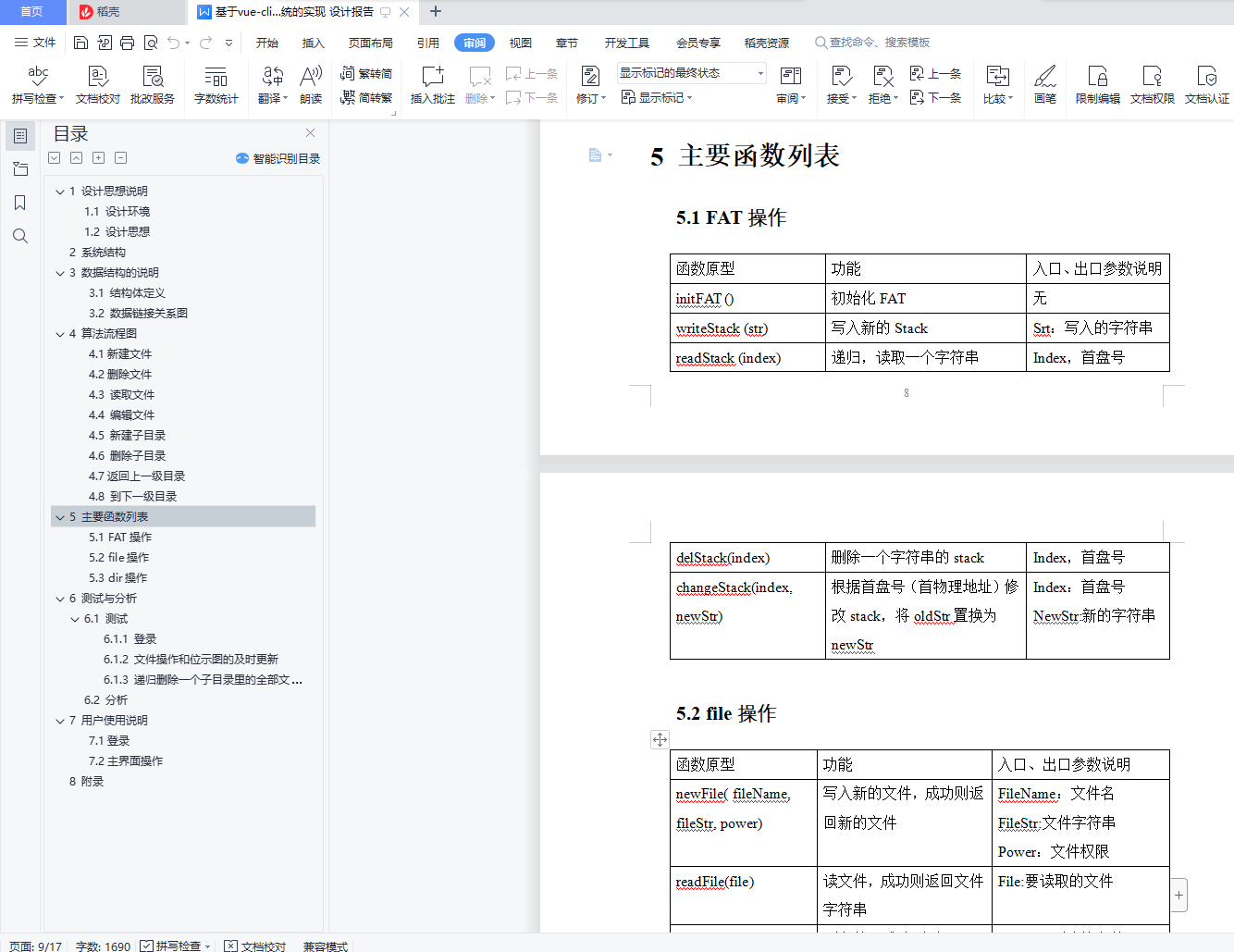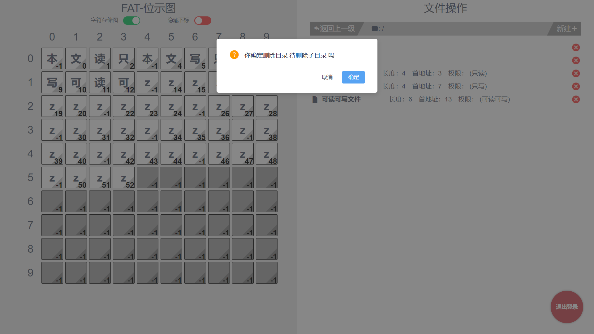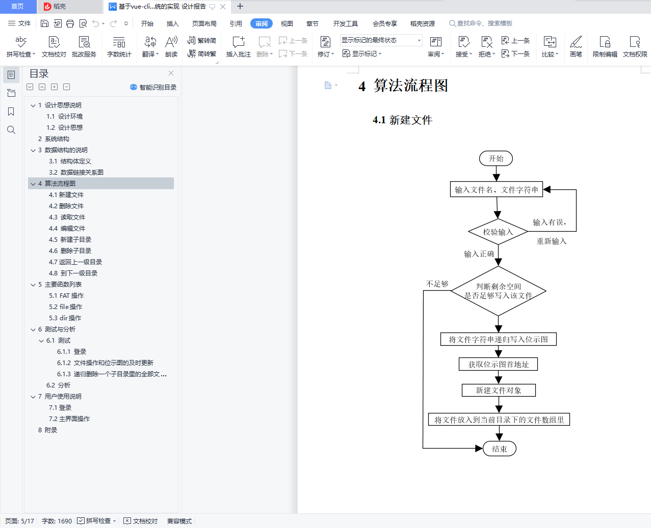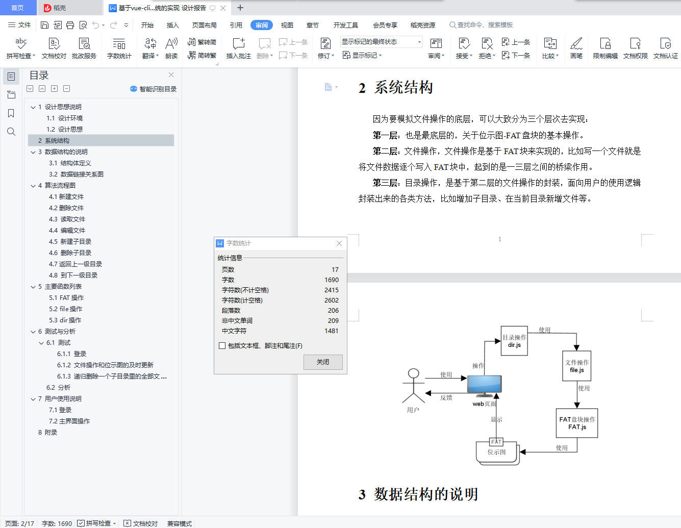 目录1 设计思想说明 11.1 设计环境 11.2 设计思想 12 系统结构 13 数据结构的说明 23.1 结构体定义 23.2 数据链接关系图 34 算法流程图 44.1新建文件 44.2删除文件 54.3 读取文件 54.4 编辑文件 64.5 新建子目录 64.6 删除子目录 74.7返回上一级目录 84.8 到下一级目录 85 主要函数列表 85.1 FAT操作 85.2 file操作 95.3 dir操作 96 测试与分析 106.1 测试 106.1.1 登录 106.1.2 文件操作和位示图的及时更新 106.1.3 递归删除一个子目录里的全部文件 126.2 分析 137 用户使用说明 137.1登录 137.2主界面操作 148 附录 151 设计思想说明1.1 设计环境开发语言:html、css、Js开发框架:Vue拓展工具:webpack、iView组件库简介:本项目是基于Vue全家桶开发的纯前端Web项目,将文件操作的底层模拟全部通过页面显示出来。1.2 设计思想文件存储空间管理:位示图盘块分配方式:显示连接主体构思:因为是模拟底层,所以可以将页面分为两半,一半是底层的位示图实时呈现,另一部分是文件的各式操作。然后,用户主要通过文件操作去感受位示图的实时改变来理解文件操作的底层原理。而用户到底层中间,需要经历以下这些流程:web页面 文件操作 FAT盘块操作 位示图实时更新 web页面