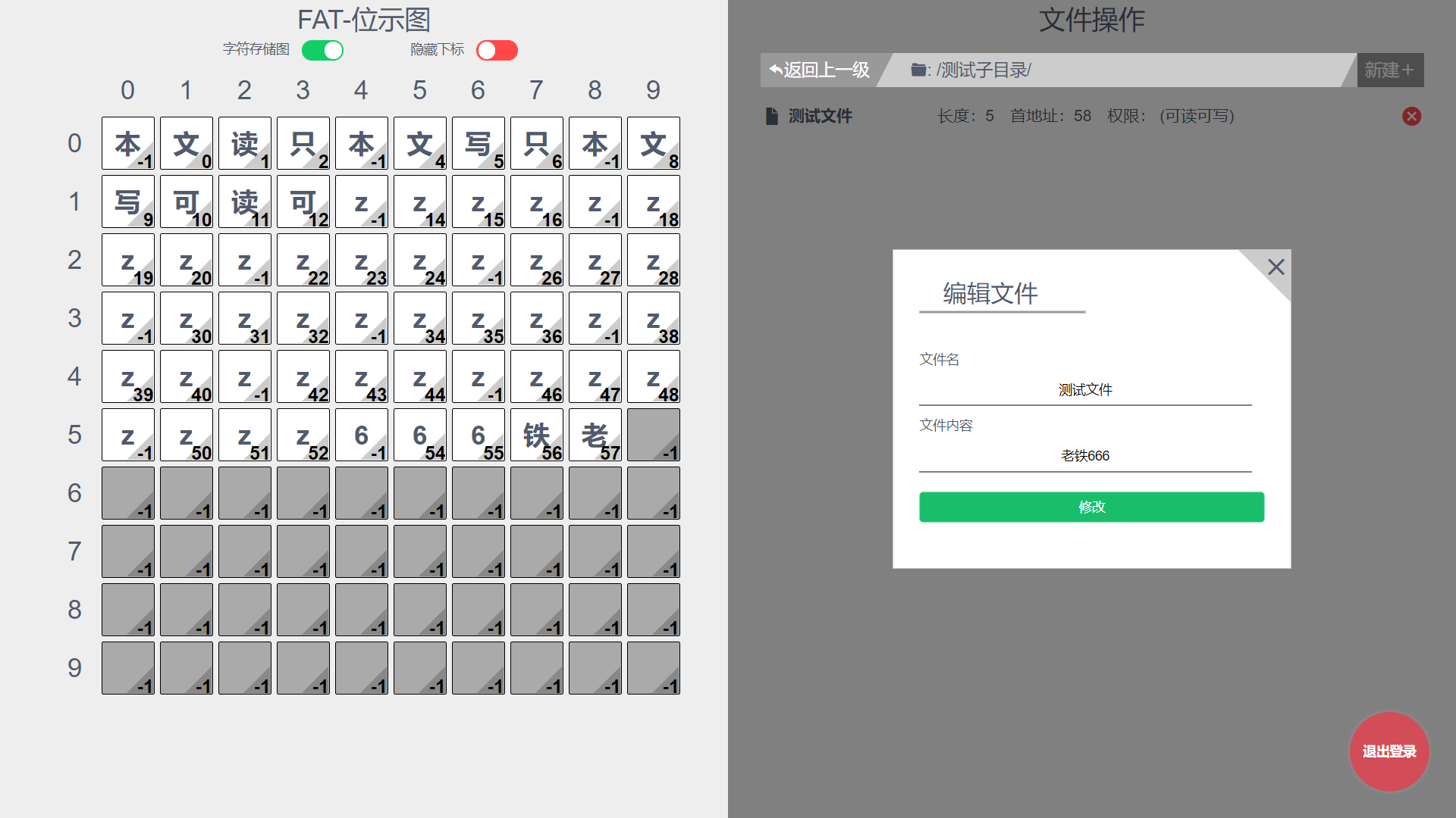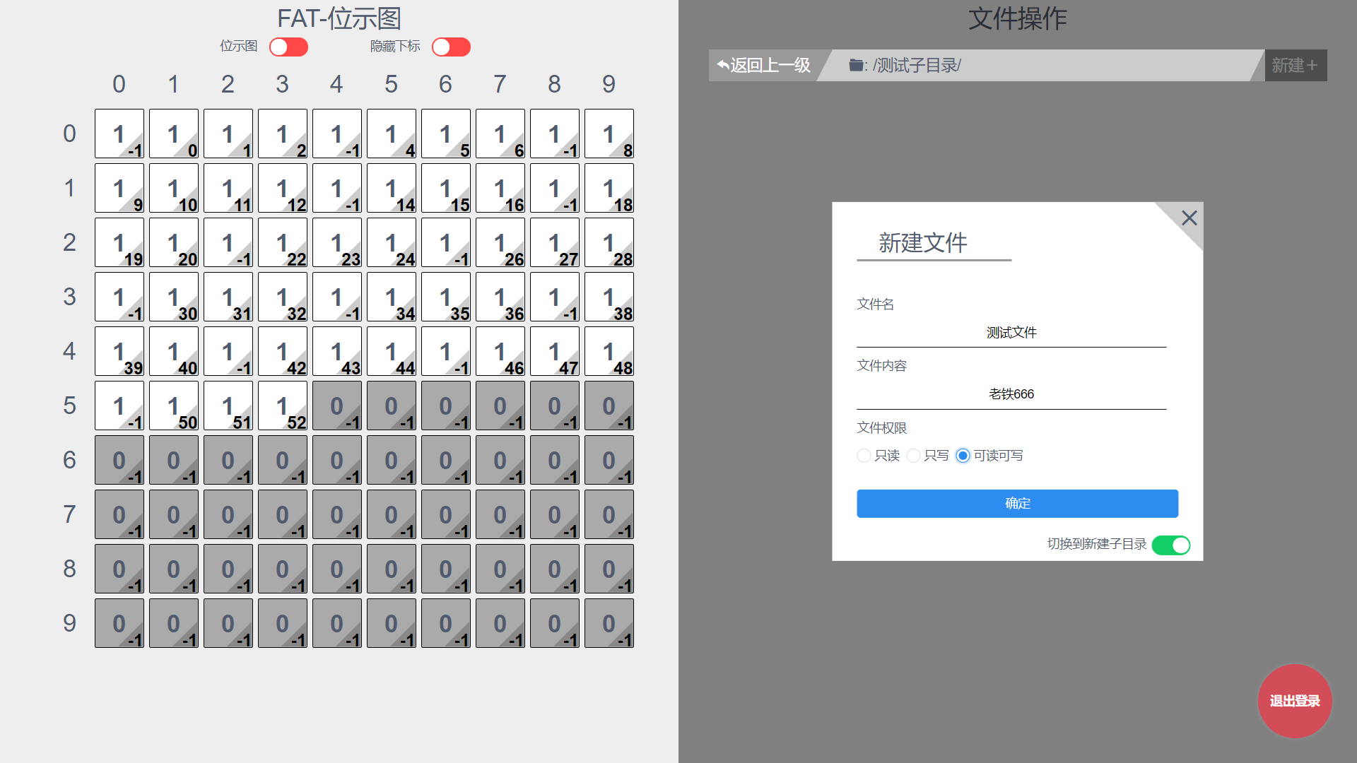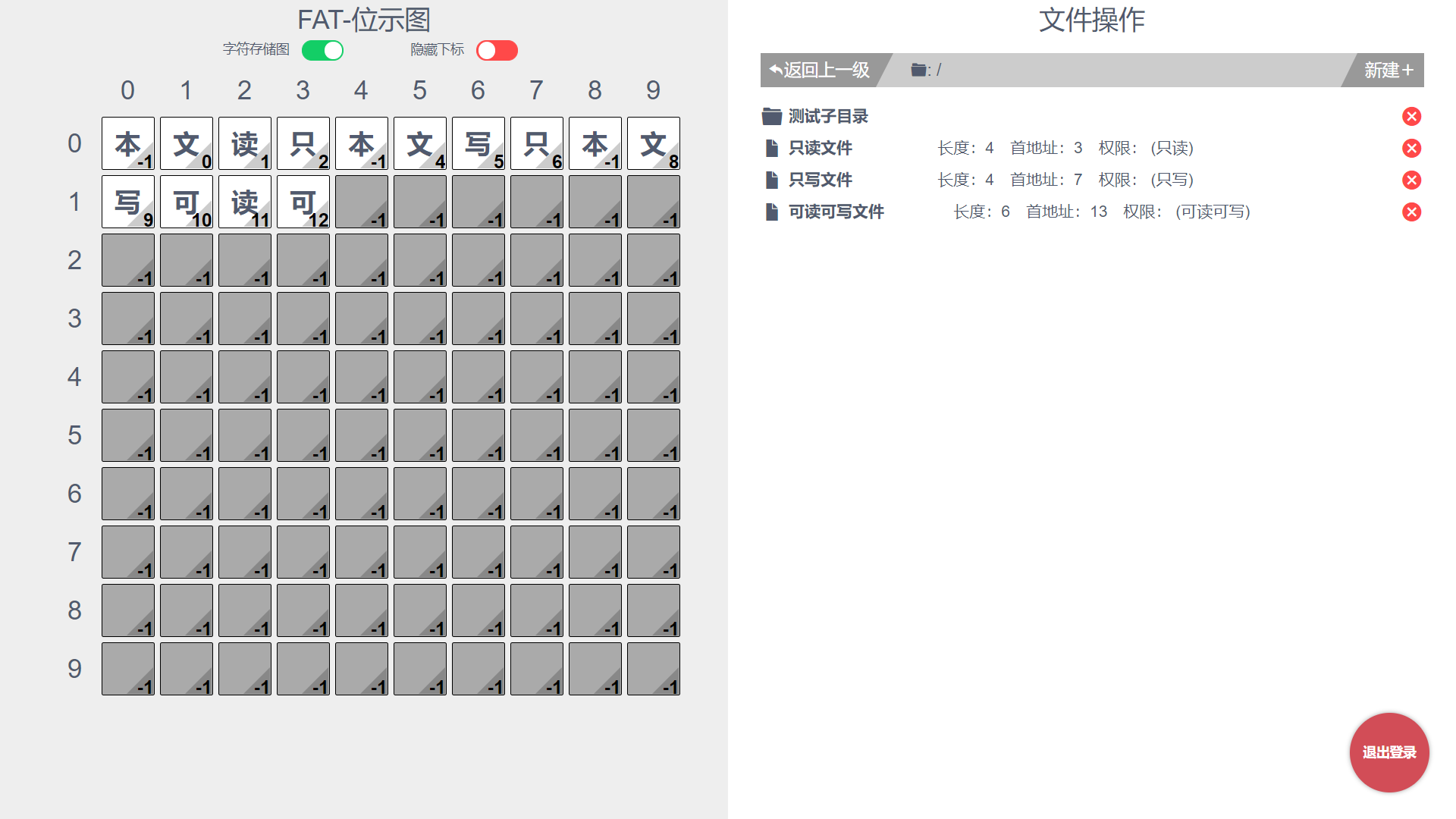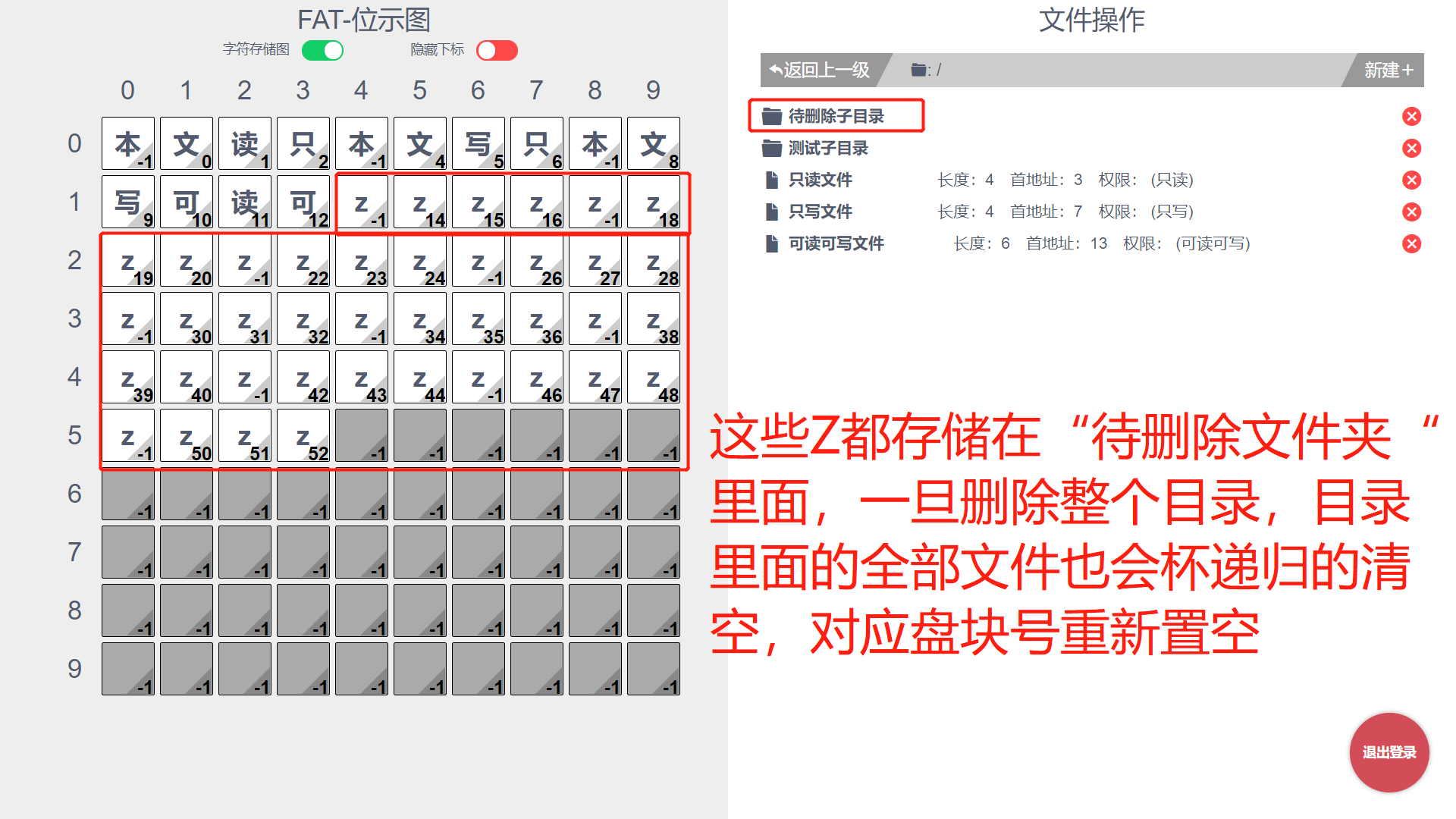 目录1 设计思想说明 11.1 设计环境 11.2 设计思想 12 系统结构 13 数据结构的说明 23.1 结构体定义 23.2 数据链接关系图 34 算法流程图 44.1新建文件 44.2删除文件 54.3 读取文件 54.4 编辑文件 64.5 新建子目录 64.6 删除子目录 74.7返回上一级目录 84.8 到下一级目录 85 主要函数列表 85.1 FAT操作 85.2 file操作 95.3 dir操作 96 测试与分析 106.1 测试 106.1.1 登录 106.1.2 文件操作和位示图的及时更新 106.1.3 递归删除一个子目录里的全部文件 126.2 分析 137 用户使用说明 137.1登录 137.2主界面操作 148 附录 151 设计思想说明1.1 设计环境开发语言:html、css、Js开发框架:Vue拓展工具:webpack、iView组件库简介:本项目是基于Vue全家桶开发的纯前端Web项目,将文件操作的底层模拟全部通过页面显示出来。1.2 设计思想文件存储空间管理:位示图盘块分配方式:显示连接主体构思:因为是模拟底层,所以可以将页面分为两半,一半是底层的位示图实时呈现,另一部分是文件的各式操作。然后,用户主要通过文件操作去感受位示图的实时改变来理解文件操作的底层原理。而用户到底层中间,需要经历以下这些流程:web页面 文件操作 FAT盘块操作 位示图实时更新 web页面
