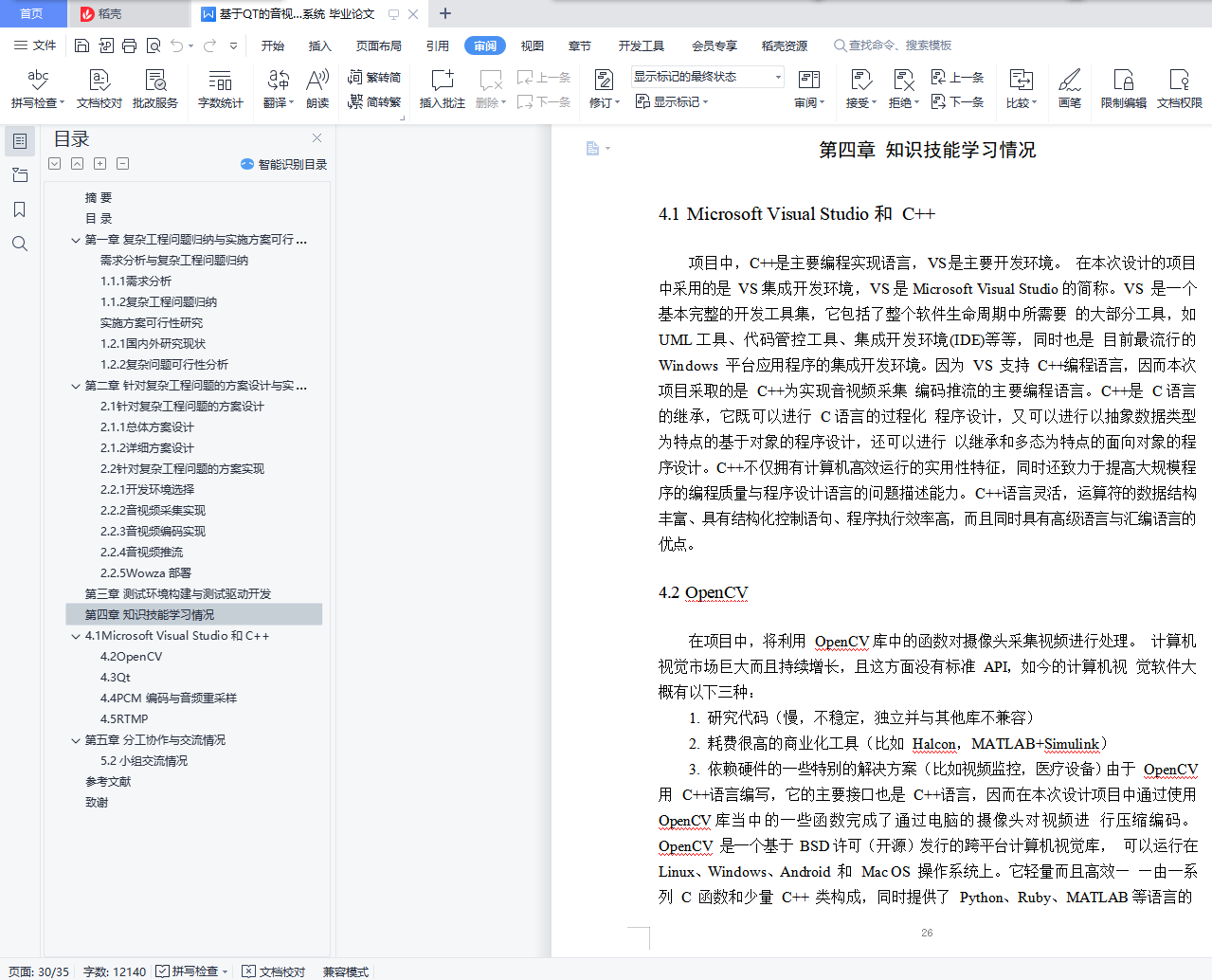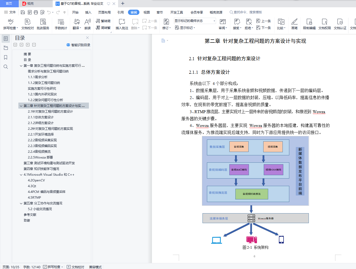 摘 要本次综合毕业设计主要任务是采用 Qt5.8、opencv 和 FFmpeg 实现音视频采集和音视频推流,FFmepg 开源库把所采集的原始视频数据进行编码成 H.264 压缩格式,采用 ACC 编码方式把所采集的原始音频数据编码,再把编码之后的音视频压缩数据使用 RTMP 协议进行网络传输。使用 Wowza 流媒体服务器实现推流终端的搭建。同时通过构建的的前端网页对实时传输的音视频流进行播放。关键词:FFmpeg,RTMP,ACC,直播推流目 录第一章 复杂工程问题归纳与实施方案可行性研究 1需求分析与复杂工程问题归纳 11.1.1需求分析 11.1.2复杂工程问题归纳 2实施方案可行性研究 31.2.1国内外研究现状 31.2.2复杂问题可行性分析 4第二章 针对复杂工程问题的方案设计与实现 62.1针对复杂工程问题的方案设计 62.1.1总体方案设计 62.1.2详细方案设计 72.1.2.1音视频数据采集 72.1.2.2音视频编码 82.1.2.3音视频同步推流 102.1.2.4Wowza 服务器搭建 112.2针对复杂工程问题的方案实现 122.2.1开发环境选择 122.2.2音视频采集实现 142.2.3音视频编码实现 172.2.4音视频推流 182.2.5Wowza 部署 21第三章 测试环境构建与测试驱动开发 23第四章 知识技能学习情况 264.1MICROSOFT VISUAL STUDIO 和 C++ 264.2OPENCV 264.3 QT 274.4PCM 编码与音频重采样 274.5RTMP 28第五章 分工协作与交流情况 295.2 小组交流情况 29参考文献 30致谢 31