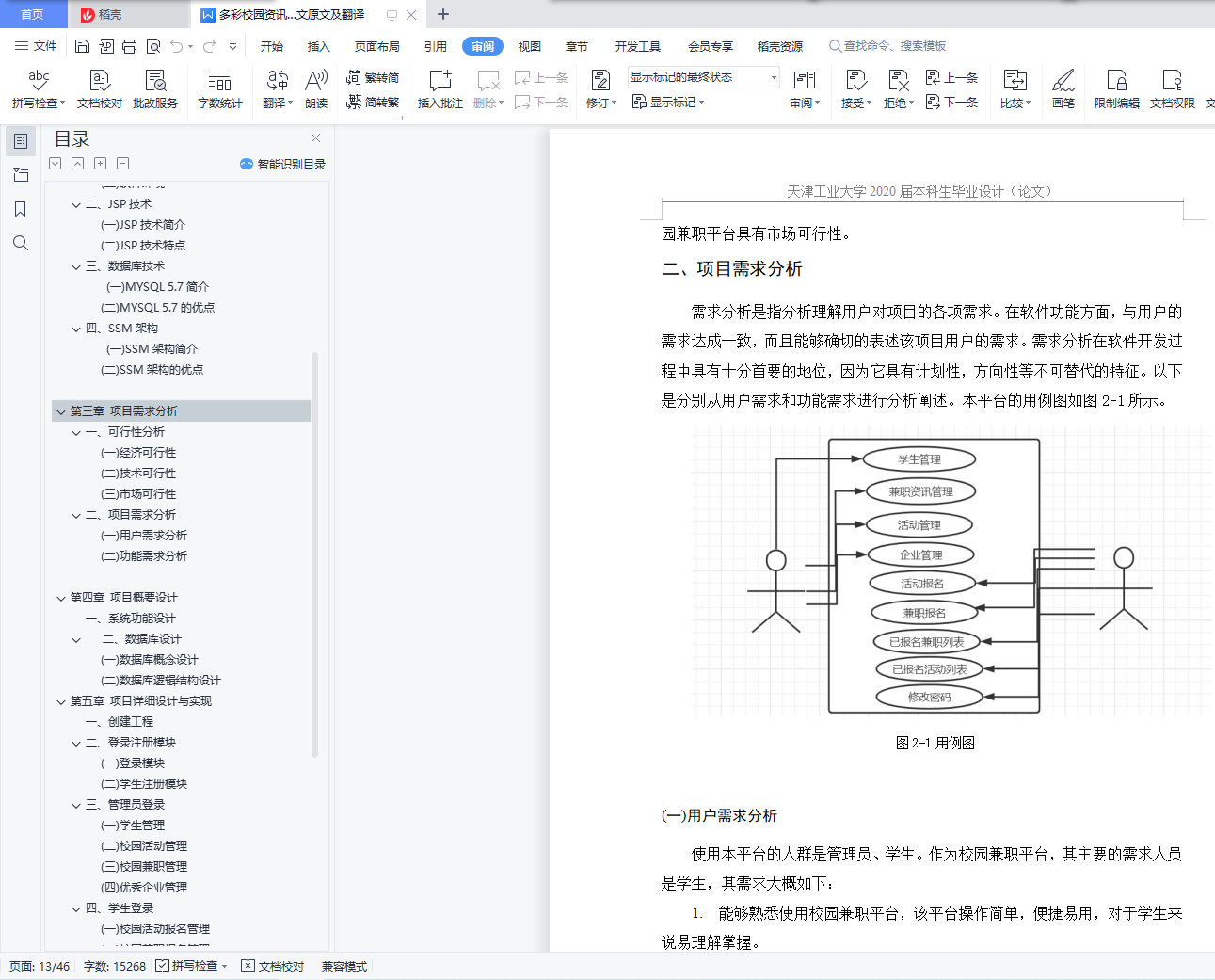摘 要近年来,互联网发展迅速,高校学生利用课余时间在网上寻找兼职的现象越来越普遍。课余兼职也成为高校学生锻炼自己能力的途径之一。但是网上兼职平台安全性和真实性没有保障,资源杂乱,并且存在网络诈骗坑害学生现象。如果高校自己创建一个关于校园兼职的平台,那么安全性和真实性都能得到保障。并且兼职相关信息和咨询都能更完善,能够很好的解决高校学生找兼职难的局面。因此,我设计了一个将校园活动和校园兼职整合在一起的校园咨讯平台,不仅能够让学生及时获取校园活动信息,还能解决学生找兼职难的问题。本平台有管理员和学生两个角色,实现学生活动报名管理,学生兼职报名管理,优秀企业管理,学生信息管理,活动报名功能,兼职报名功能,已报活动查看,已报兼职查看,修改密码,注册学生信息等功能。本文中的多彩校园咨讯平台采用了Java、JSP、MYSQL5.7和IntelliJ IDEA 2016.3等相关技术工具。JSP性能优越,强大易用,功能多样化,多平台支持,方便用户使用简单的方式来实现复杂的应用。数据库采用MYSQL5.7,使得数据库设计灵活高效。本平台使用SSM架构,使得程序设计更加简洁方便。关键词:多彩校园资讯平台;JSP;MYSQL5.7;SSM架构AbstractIn recent years, with the rapid development of Internet, it is more and more common for college students to find part-time jobs on the Internet. Part-time job after school has also become one of the ways for college students to exercise their abilities. However, the security and authenticity of the online part-time platform is not guaranteed, the resources are messy, and there is the phenomenon of online fraud victimizing students. If the university itself creates a platform about campus part-time jobs, then the security and authenticity can be guaranteed. And part-time related information and consultation can be more perfect, can be a good solution to college students looking for part-time difficult situation. Therefore, I designed a campus activity and campus part-time integration of campus information platform, not only to enable students to get timely information on campus activities, but also to solve the problem of students looking for part-time work.This platform has two roles, the administrator and the student, to achieve student activity registration management, student part-time registration management, excellent enterprise management, student information management, activity registration function, part-time registration function, has been registered activities to see, has been registered part-time to see, changing passwords, registering student information, etc. .The colorful campus information platform in this paper uses Java, JSP, MYSQL5.7 and IntelliJ IDEA2016 and other related technical tools. JSP performance is superior, powerful and easy to use, function diversification, multi-platform support, easy to use users to achieve a simple way to achieve complex applications. MYSQL 5.7 is used in the database, which makes the database design flexible and efficient. This platform uses the SSM structure, which makes the program design more concise and convenient.Keywords:Colorful Campus Information Platform;JSP;MYSQL5.7;SSM architecture目 录第一章 绪论 1一、课题研究背景 1二、 国内外的研究现状 1三、 课题研究的目的与意义 2四、课题系统的主要功能 2第二章 开发环境及技术 3一、开发环境 3(一)硬件环境 3(二)软件环境 3二、JSP技术 3(一) JSP技术简介 3(二)JSP技术特点 3三、数据库技术 4(一)MYSQL 5.7简介 4(二)MYSQL 5.7的优点 5四、SSM架构 5(一)SSM架构简介 5(二)SSM架构的优点 6第三章 项目需求分析 7一、可行性分析 7(一) 经济可行性 7(二)技术可行性 7(三)市场可行性 7二、项目需求分析 8(一)用户需求分析 8(二)功能需求分析 9第四章 项目概要设计 10一、系统功能设计 10二、数据库设计 11(一)数据库概念设计 11(二)数据库逻辑结构设计 13第五章 项目详细设计与实现 16一、创建工程 16二、登录注册模块 16(一)登录模块 16(二)学生注册模块 17三、管理员登录 18(一) 学生管理 18(二) 校园活动管理 18(三) 校园兼职管理 21(四) 优秀企业管理 23四、学生登录 24(一) 校园活动报名管理 25(二) 校园兼职报名管理 25(三) 参与活动列表模块 25(三) 参与兼职列表模块 26(四) 修改密码模块 26第六章 系统测试及分析 27一、软件测试的目的与原则 27(一) 软件测试的目的 27(二) 软件测试的原则 27二、 软件测试的方法 28三、软件测试 28(一)测试过程 28(二)测试结果分析 31第七章 总结 32附 录 34Ⅰ 英文原文 34Ⅱ 中文译文 38致 谢 41