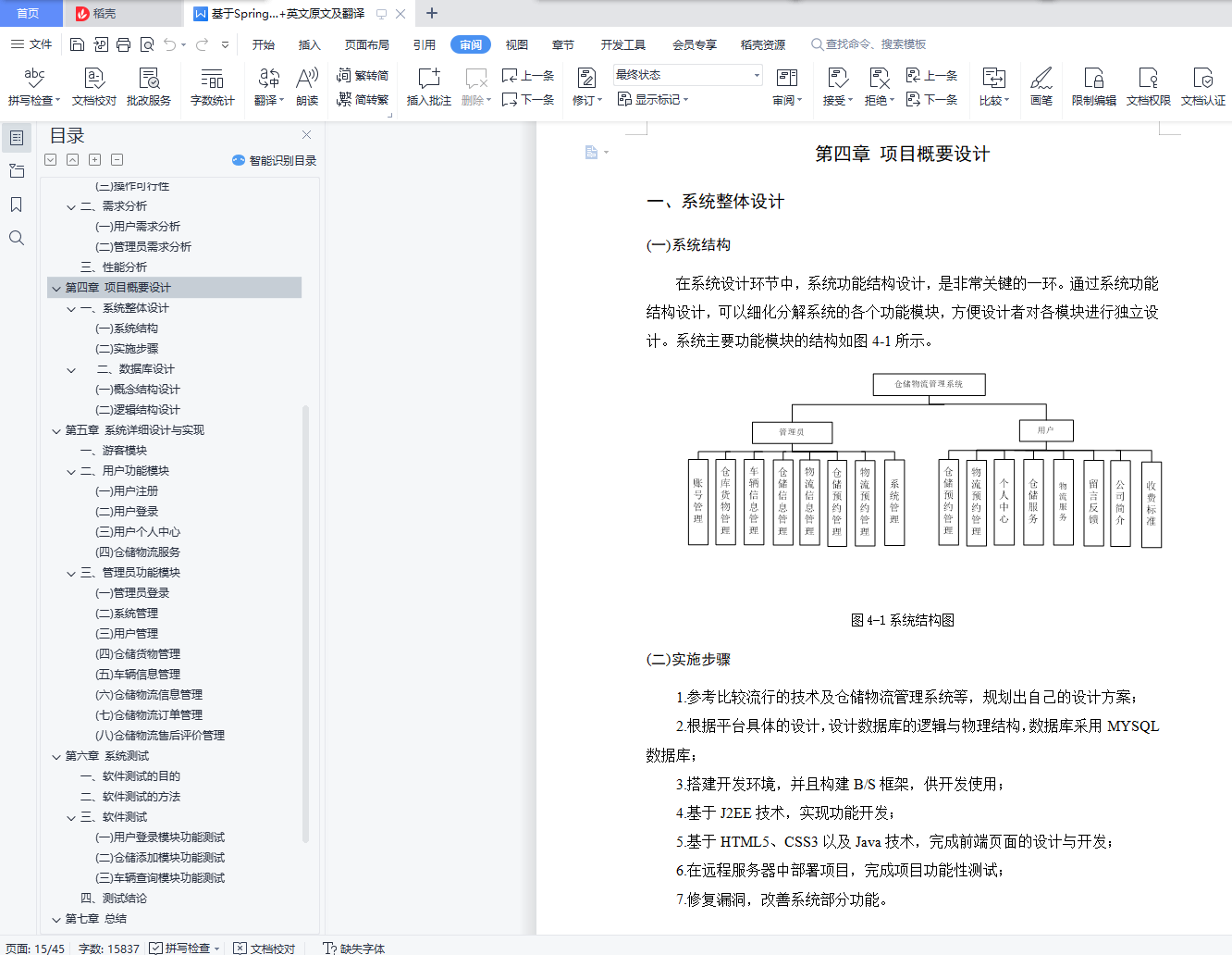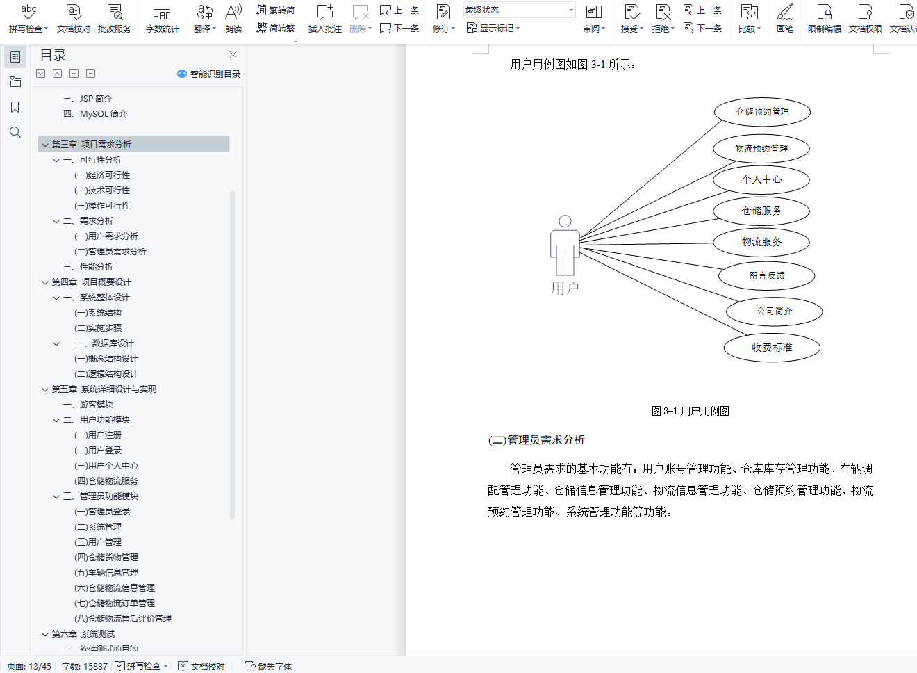 摘 要伴随我国华为5G网络核心技术的飞速发展,各行各业都在使用计算机管理系统来方便我们的日常事务处理,它们在人们生活当中起着关键性的辅助作用。这次所设计的仓储物流管理系统主要设计目标是实现对接用户的在线仓储物流管理功能,它可以模拟实现用户对所需要的仓储物流服务的预约、下单、付款、评价的全流程,以及商家对于相关信息的处理及后续安排。仓储物流管理系统的开发语言主要使用的是JAVA,开发工具使用IntelliJ IDEA,基于B/S架构,数据库使用MYSQL。系统设计了两个角色包括用户角色与管理员角色。该仓储物流管理系统的实现可以很好的解决小型相关企业仓储物流管理的问题,不仅能够为人们节省时间,还可以创造更好的效率,在对系统进行过详细的测试之后,将测试的结果反应到开发流程中,可以有效的将程序逻辑和代码进行改善,并且系统中的程序也能够正常的运转,该系统的操作不需经过培训,易于上手,便于进行后期推广。关键词:Java;B/S结构;仓储物流管理系统;MYSQL数据库AbstractWith the rapid development of China's Huawei 5G network core technology, all walks of life are using computer management systems to facilitate our daily affairs, and they play a key auxiliary role in people's lives. The main design goal of the warehousing and logistics management system designed is to achieve the docking user online warehousing and logistics management function, it can simulate the whole process of the user's warehousing and logistics service appointment, order, payment, evaluation, as well as the processing and follow-up arrangements for the relevant information.The development language of the warehouse logistics management system is mainly JAVA, the development tool is IntelliJ IDEA, based on B/S structure, and the database is MYSQL. Two roles are designed in the system, including user role and administrator role.The implementation of the warehousing logistics management system can well solve the problem of small companies, warehousing logistics management, not only can save time for people, but also can create better efficiency, after detailed test on system, test the results of the response to the development process, can effectively improve the program logic and the code of the And the procedures in the system can also operate normally, the operation of the system is easy to use without training, easy to carry out later promotion.Keywords: Java; B/S structure; Warehousing and logistics management system; The MYSQL database目 录第一章 绪论 1一、课题的来源 1二、 课题的意义和目标 1三、 课国内外研究现状和发展趋势 2四、系统实现的功能 2第二章 开发技术介绍 4一、B/S简介 4二、HTML/CSS简介 4三、JSP简介 4四、MySQL简介 5第三章 项目需求分析 6一、可行性分析 6(一) 经济可行性 6(二)技术可行性 6(三)操作可行性 6二、需求分析 7(一)用户需求分析 7(二)管理员需求分析 8三、性能分析 9第四章 项目概要设计 10一、系统整体设计 10(一)系统结构 10(二)实施步骤 10二、数据库设计 11(一)概念结构设计 11(二)逻辑结构设计 13第五章 系统详细设计与实现 16一、游客模块 16二、用户功能模块 16(一) 用户注册 16(二) 用户登录 17(三) 用户个人中心 17(四) 仓储物流服务 18三、管理员功能模块 20(一) 管理员登录 20(二) 系统管理 21(三) 用户管理 21(四) 仓储货物管理 22(五) 车辆信息管理 22(六) 仓储物流信息管理 23(七) 仓储物流订单管理 23(八) 仓储物流售后评价管理 24第六章 系统测试 25一、软件测试的目的 25二、软件测试的方法 25三、软件测试 25(一)用户登录模块功能测试 25(二)仓储添加模块功能测试 26(三)车辆查询模块功能测试 27四、测试结论 27第七章 总结 29一、总结评价 29二、改进要求及目标 29参考文献 30附 录 31Ⅰ 英文原文 31Ⅱ 中文译文 36致 谢 40