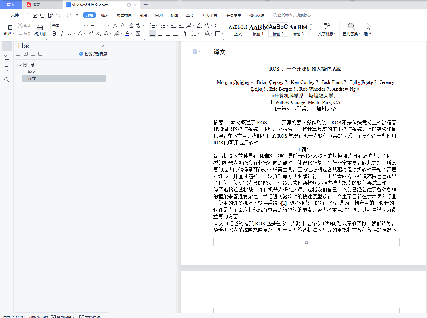 基于turtlebot的智能机器人物体识别及目标追踪系统摘要智能机器人的发展已经渗透到人们日常生活的各方各面,日益在人们日常生活中发挥着重要的作用,并且智能机器人跟踪技术是机器人研究领域的一个重要研究方向。云计算正不断应用到各种场景,传统机器人的计算存储等能力受限于其板载设备,将云计算与机器人结合用于提升机器人能力是机器人未来发展的趋势之一。本毕业设计课题基于turtlebot实现机器人目标追踪,需要将物体识别迁移到云服务器,云服务实时的通过对图像计算做出移动指令,最终实现目标追踪。采用机器人操作系统(ROS)与Client/Server(客户端/服务端)通信相结合来实现本课题。首先客户端用来接受kinenct所采集的图像,将物体识别到服务器;其次服务器端实时的对图像进行计算处理,利用机器人跟踪技术,并将产生的控制命令返回给客户端,最终远程实现对机器人的跟踪控制。关键词:目标跟踪;ROS机器人程序设计;C/S通信框架;远程控制;云机器人Research and Prototype Realization of Object Recognition and Tracking Technology for IntelligentAbstractThe development of intelligent robots has penetrated into the daily aspects of people's daily life, and increasingly plays an important role in people's daily life, and intelligent robot tracking technology is an important research direction in the field of robot research. Cloud computing is being applied to a variety of scenes, the traditional robot computing storage capacity is limited by its onboard equipment, cloud computing and robot combination for the promotion of robot capability is one of the future development trend of the robot.Based on turtlebot to achieve the robot target tracking, the need to migrate object recognition to the cloud server, cloud service real-time through the image calculation to make mobile instructions, and ultimately achieve the target tracking.I use the robot operating system (ROS) and Client / Server (client / server) communication to achieve this problem. First, the client is used to accept the image collected by kinenct, and the object is recognized to the server. Secondly, the server realizes the mobile instruction by using the robot tracking technology and returns the result to the server to do the logical processing and generate the control command, The final remote implementation of the robot tracking control.Key words: target tracking; ROS robot programming; C/S communication framework; remote control; cloud robot目 录基于turtlebot的智能机器人物体识别及目标追踪系统 1摘要 1Research and Prototype Realization of Object Recognition and Tracking Technology for Intelligent 2Abstract 2目 录 31 绪 论 51.1研究背景 51.2智能机器人(turtlebot)与云机器人 71.3机器人操作系统(ROS) 91.3.1 什么是机器人操作系统(ROS) 91.3.2 ROS的核心概念 91.3.3 ROS的核心模块 112 相关环境的搭建 122.1硬件和软件环境的搭建 122.1.1硬件环境的搭建 122.1.2软件环境的搭建 122.2 Ubuntu操作系统和ROS的安装 122.3 Kinect2驱动安装 132.3.1 kinect2驱动包版本 132.3.2 kinect2驱动安装步骤 132.4 测试环境是否搭建成功 173 基于ROS的控制移动 173.1 基于ROS的坐标系 173.2 运动控制水平 183.3运动命令Twist 184 基于ROS图像采集 194.1 ROS中图像处理的相关类库 194.1 在ROS中使用Kinect摄像头 194.2 使用rviz显示图像 204.3 ROS中sensor_msgs/Image的消息格式 225 ROS中的Nodelet节点 225.1 Nodelet节点的特点 225.2 nodelet基类 236 项目整体架构设计 236.1 项目整体架构 236.1.1 云应用框架 236.1.2 图象识别云应用 246.1.3 项目各函数的功能介绍 256.2 客户端/服务器模块 266.2.1环境说明 266.2.2客户端TCP协议通信的步骤 266.2.3服务器端TCP协议通信的步骤 276.3 机器人实时跟踪模块 296.4 配置项目的CMakeLists.txt文件 318 项目结果测试 358.1硬件设备连接测试 358.2测试结果 358.3项目运行ROS节点状态图 369 结论与展望 37参考文献 39致 谢 40附 录 41