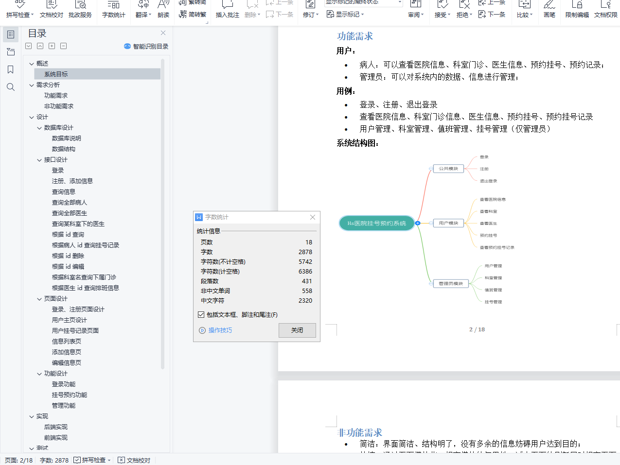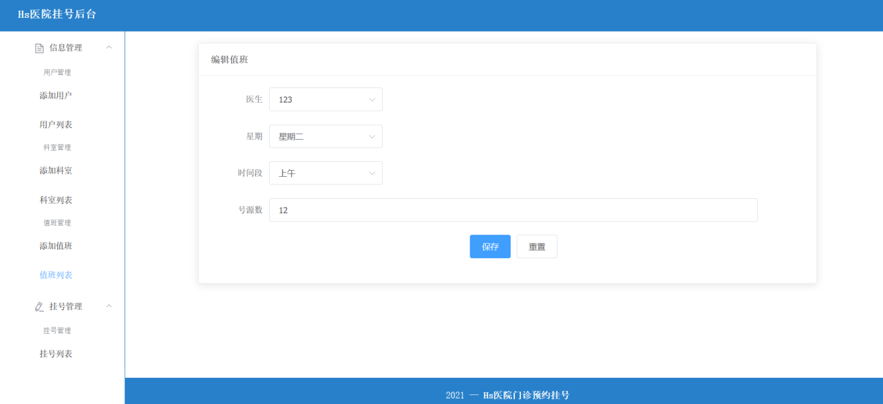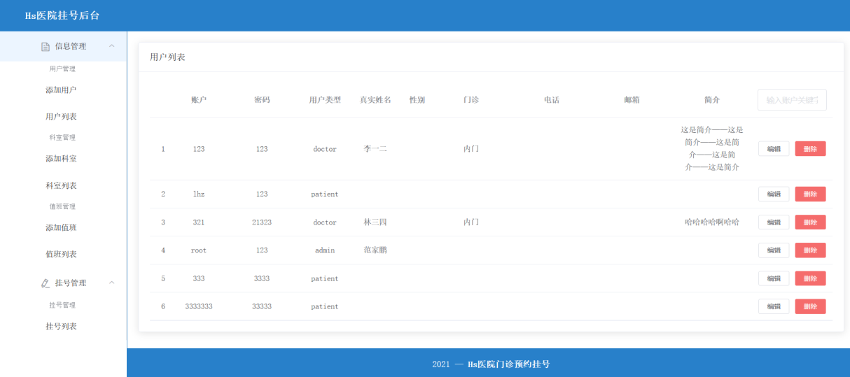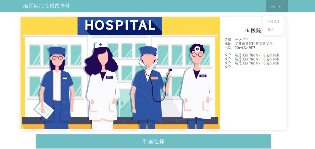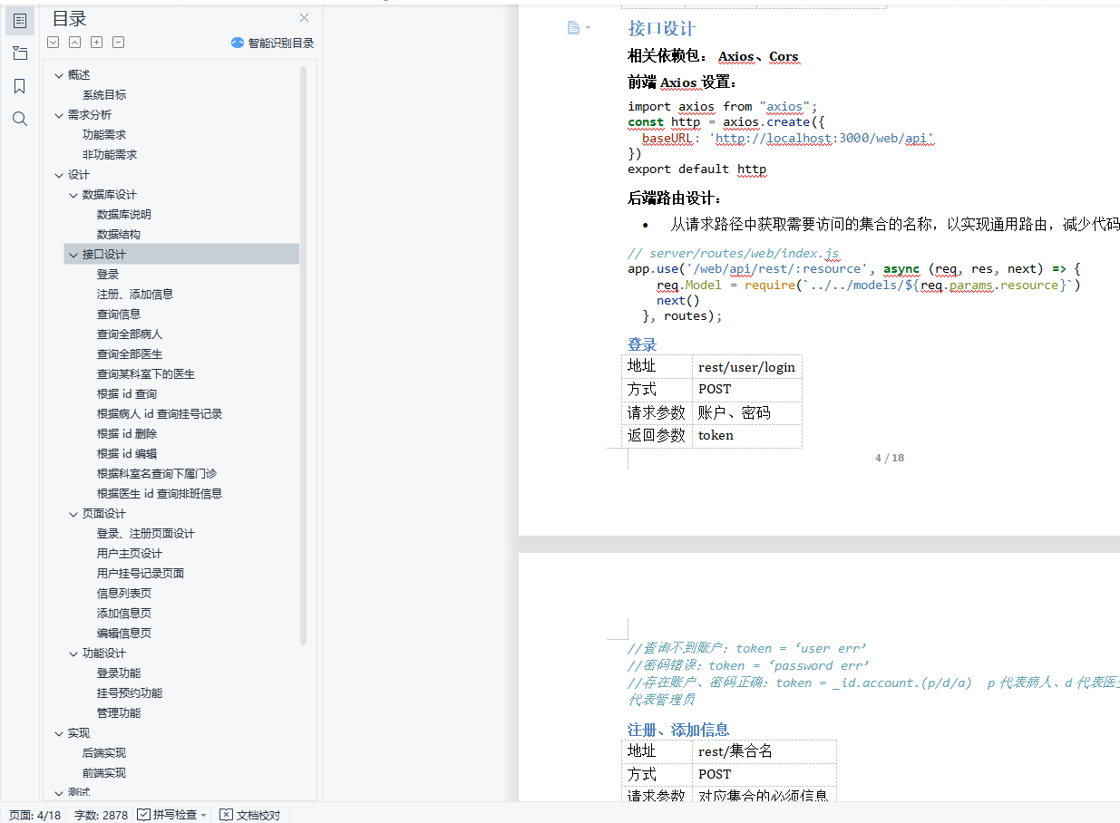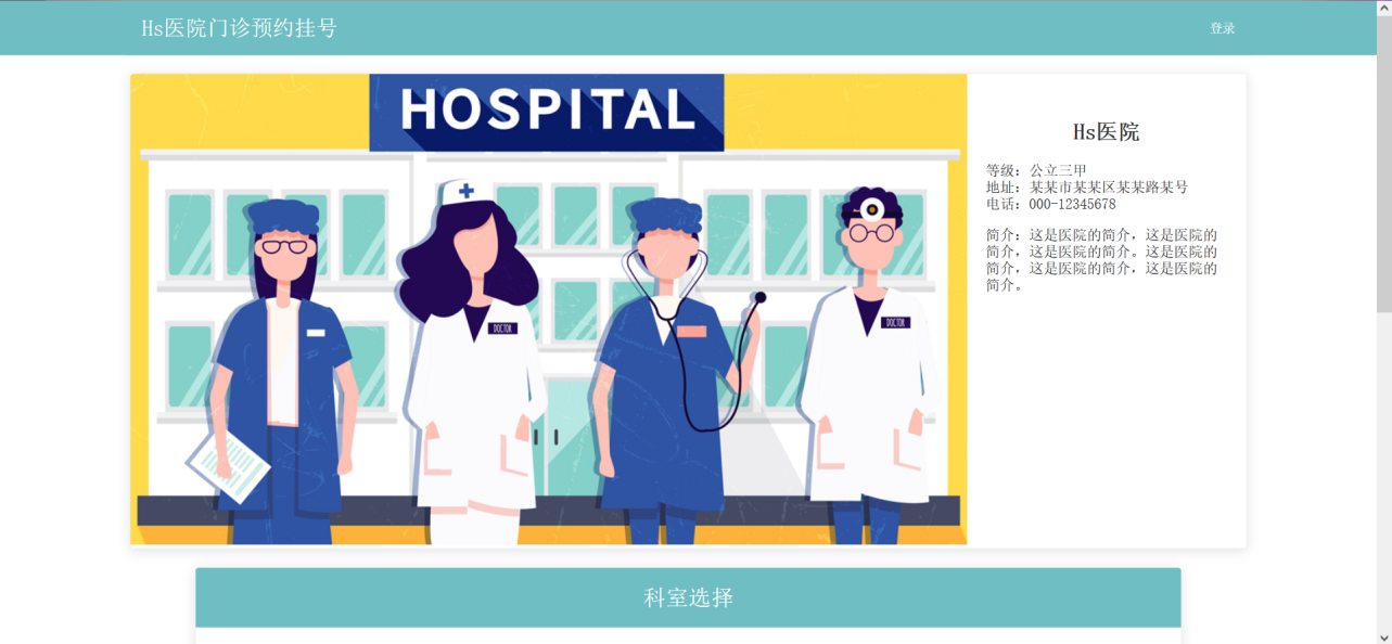 目录概述 3系统目标 3需求分析 3功能需求 3非功能需求 4设计 4数据库设计 4数据库说明 4数据结构 4接口设计 5登录 5注册、添加信息 6查询信息 6查询全部病人 6查询全部医生 6查询某科室下的医生 6根据 id 查询 6根据病人 id 查询挂号记录 7根据 id 删除 7根据 id 编辑 7根据科室名查询下属门诊 7根据医生 id 查询排班信息 7页面设计 8登录、注册页面设计 8用户主页设计 9用户挂号记录页面 10信息列表页 10添加信息页 11编辑信息页 11实现 11后端实现 13前端实现 15测试 17登录测试 17注册测试 17退出登录测试 18挂号测试 18取消挂号记录 18添加信息 18删除信息 18编辑信息 18项目总结 18概述项目名称:Hs医院挂号预约系统 / Hs医院门诊预约挂号系统项目技术:Vue + Element UI + Node + MongoDB系统目标在互联网发达的现代,为病人挂号预约提供便利,不用再在医院的挂号窗口排队等待,而是利用互联网的便利;使用本系统,用户可以足不出户、免去等待的进行挂号预约,医院方面的管理员可以便捷的对医院中的一些数据、信息进行存储、管理、维护,节省信息管理的成本。需求分析功能需求用户:•病人:可以查看医院信息、科室门诊、医生信息、预约挂号、预约记录;•管理员:可以对系统内的数据、信息进行管理;用例:•登录、注册、退出登录•查看医院信息、科室门诊信息、医生信息、预约挂号、预约挂号记录•用户管理、科室管理、值班管理、挂号管理(仅管理员)系统结构图:非功能需求•简洁:界面简洁、结构明了,没有多余的信息妨碍用户达到目的;•快捷:通过页面模块化,提高模块的复用性,减少页面的刷新同时提高页面的加载速度;设计数据库设计数据库说明•MongoDB 数据库的集合可以看做是 其他关系数据库(如 MySQL)的表•集合的字段 _id 为唯一主键•一些除 _id 外的 ObjectId数据类型的字段相当于外键