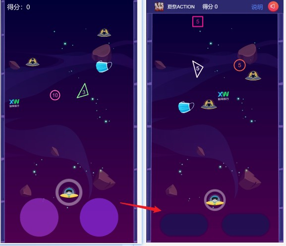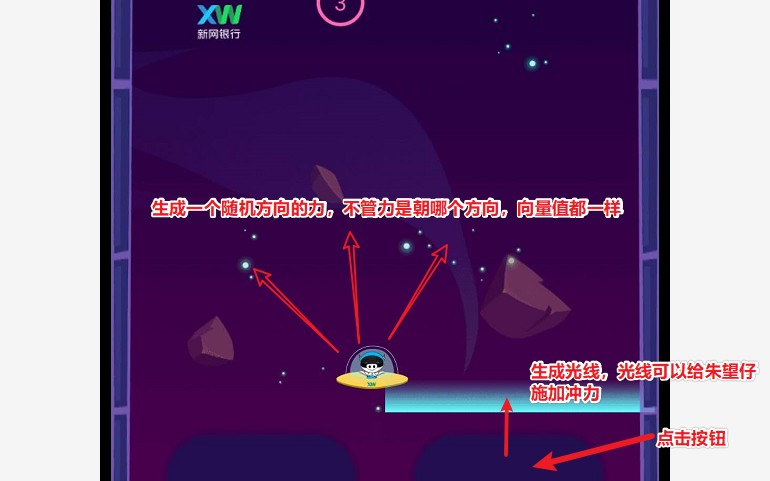 目录开发思路 2营销手段 121. 主要是通过朋友圈在老师,同学的帮助下进行推广,扩散 122. 在一些小游戏的广播聊天中,发散过 123. 鼓励玩家互相进行打榜比拼 12优化工作 121. 优化加载 122. 优化排行榜 123. 优化游戏分享 124. 游戏难度进展的控制 135. 优化后期游戏难度太高造成的失控感 136. 回弹角度 137. 生成多边形时,不能碰撞到“朱望仔” 138. 游戏结束后的优化 139. 减少游戏过程中不断占用的内存 14开发思路1.开发需求:根据新网银行提供的动画素材,研发一款简单好玩的弹珠类游戏2.根据需求设计游戏:由于官方提供的动画素材比较偏向于 “飞船、星空” 的设计元素,所以经过我们队伍一起讨论过后,希望在“朱望仔大战大反派”为主题的基础上,延伸成 “星空大作战” 这样更广阔,新颖 的主题,一个带有外太空背景的游戏主题。于是,进入游戏后的映入眼帘的标题也起名为“星 空大作战”。官方赛题要求:弹珠类游戏我们团队在各大游戏平台(例如4399小游戏等)体验了各种各样的弹珠类游戏,并且想到了 当年很经典的windows附带的一款电脑游戏《三维弹球》,结合我们的体验及对《三维弹球》这款经典的游戏情怀,设计了《星空大作战》这款弹珠类游戏(玩法:游戏页面下方设 置玩家操控的“动态挡板”,游戏页面上半部分主体中放置一些多边形的碰撞物体,以及类似 官方Demo游戏中的得分物体,玩家如果没有成功防止朱望仔落出屏幕下方,即视为游戏挑 战失败)