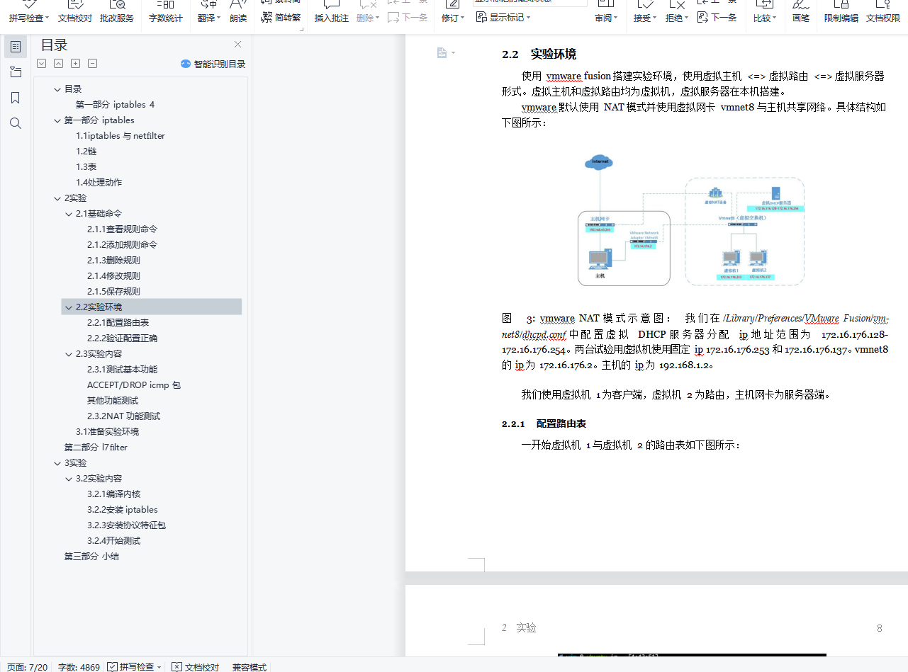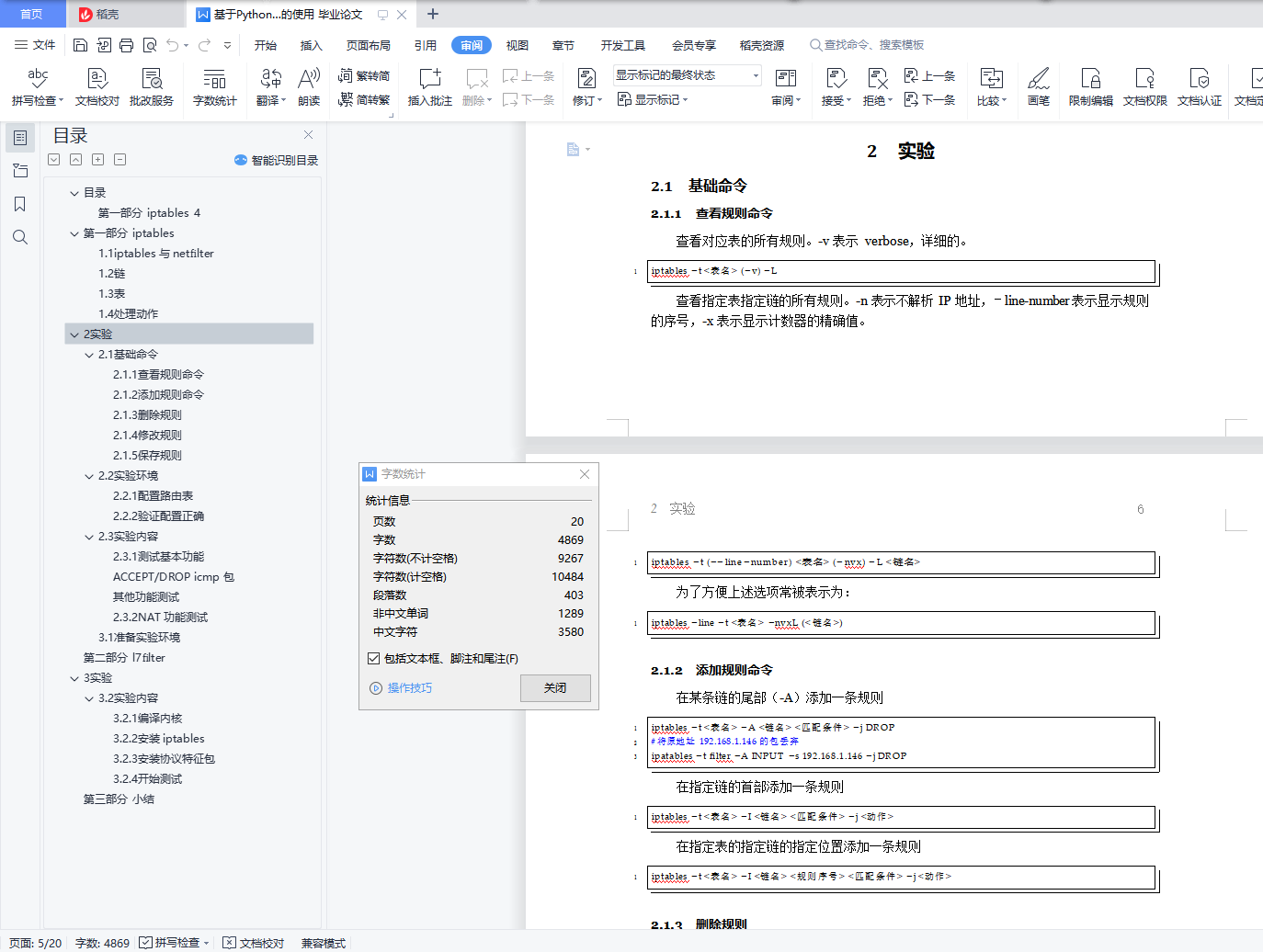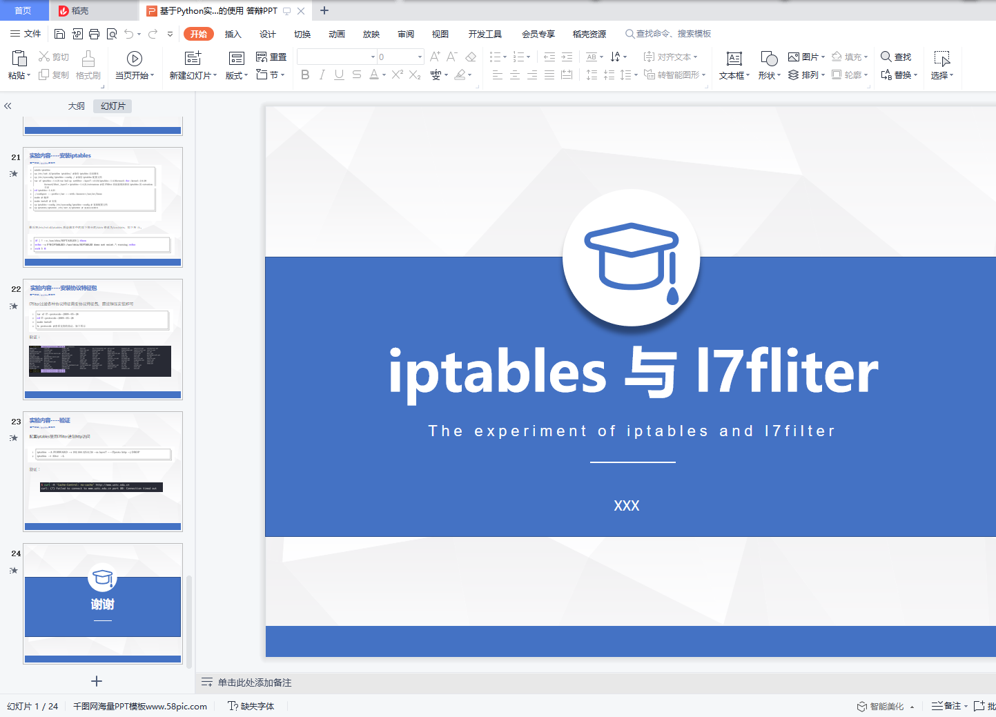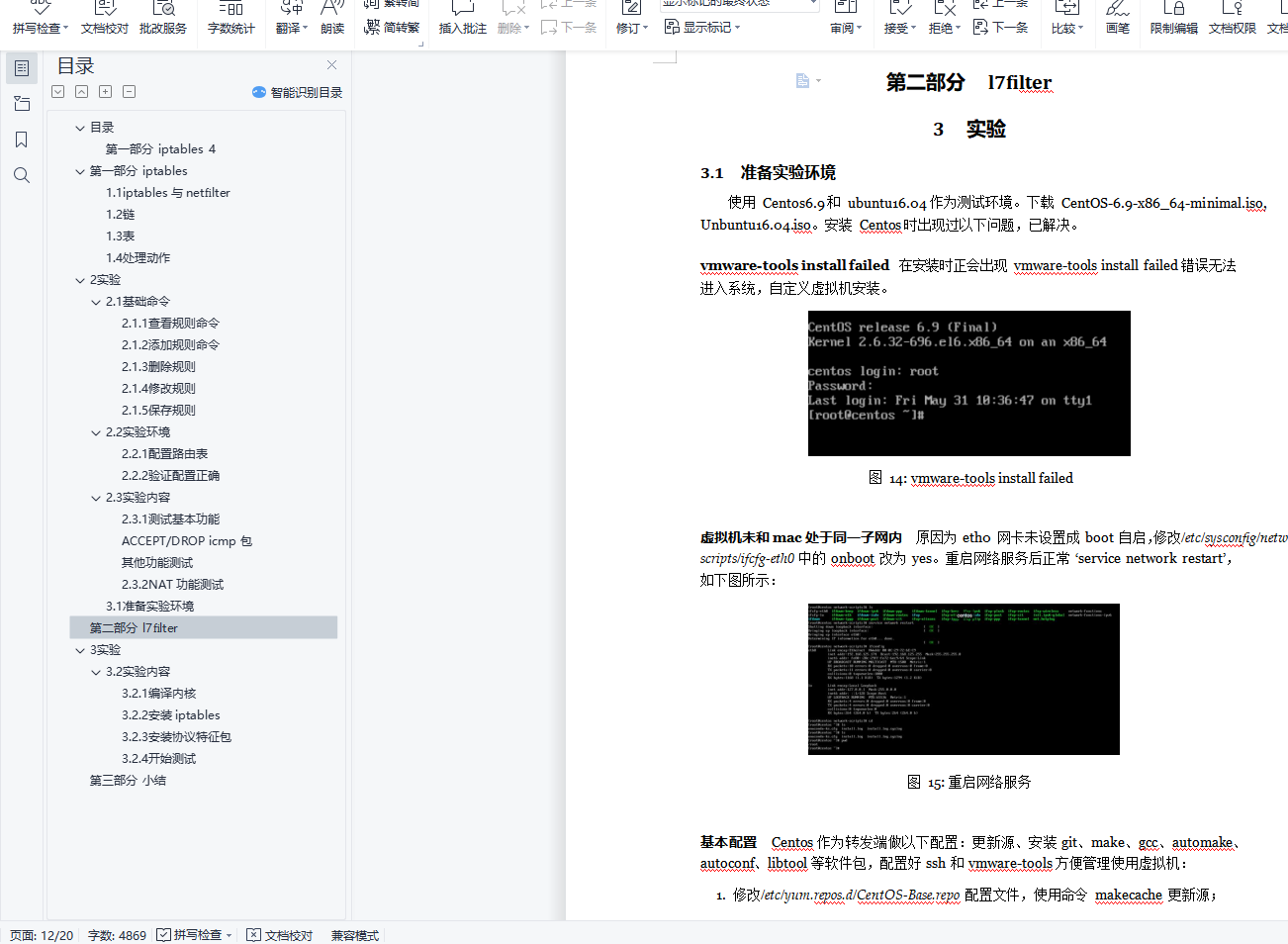 摘要ipatables 是一个常用的包过滤防火墙应用。但是,用户的安全设定实际上是由操作系统内部的一个数据包处理模块(netfilter)执行的,我们可以把 iptables 看做一个客户端代理。iptables 的核心为四表五链。四表为 raw 表、mangle 表、net 表、filter 表。五链为 PREROUTING、INPUT、FORWARD、OUTPUT、POATROUTING。我们可以向iptables 中加入不同的过滤规则,实现特定功能。在本次实验中我们测试了 iptables 的基本accept、drop、reject 动作和 nat 过滤功能。然而 netfilter 不带有应用层过滤的功能。想要实现应用层协议的过滤,我们选用了 l7filter。l7filter 从 2013 年就没有维护,必须选择较老版本的内核才能成功使用 l7filter 提供的过滤协议,在本次实验中我们选用 centos6.9 进行实验。实验需要先对 linux 内核打补丁,增加l7filter 的功能模块。完成试验后,能针对性的过滤应用层协议为 http、qq、迅雷等常见的应用层数据包。关键字:iptables、l7filter、包过滤、防火墙、应用层网关目录第一部分 iptables 44. . . . . . . . . . . . . . . . . . . . . . . . . . . . . . 4. . . . . . . . . . . . . . . . . . . . . . . . . . . . . . 4. . . . . . . . . . . . . . . . . . . . . . . . . . . . . . 4. . . . . . . . . . . . . . . . . . . . . . . . . . . . . . 55. . . . . . . . . . . . . . . . . . . . . . . . . . . . . . 52.1.1查看规则命令 52.1.2添加规则命令 62.1.3删除规则 62.1.4修改规则 62.1.5保存规则 72.2实验环境 72.2.1配置路由表 72.2.2验证配置正确 82.3实验内容 92.3.1测试基本功能 92.3.2NAT 功能测试 11第二部分 l7filter 123 实验 123.1准备实验环境 123.2实验内容 133.2.1编译内核 133.2.2安装 iptables 153.2.3安装协议特征包 163.2.4开始测试 16第三部分 小结 20第一部分 iptables1 简介1.1iptables 与 netfilteriptables 其实不是真正的防火墙,我们可以把它看做一个客户端代理。用户通过 ipta-bles 这个代理,将用户的安全设定执行到 netfilter 中。netfilter 才是真正的防火墙。netfilter 是 linux 操作系统内部的一个数据包处理模块,它具有如下功能:数据包内容修改、数据包过滤的防火墙功能。