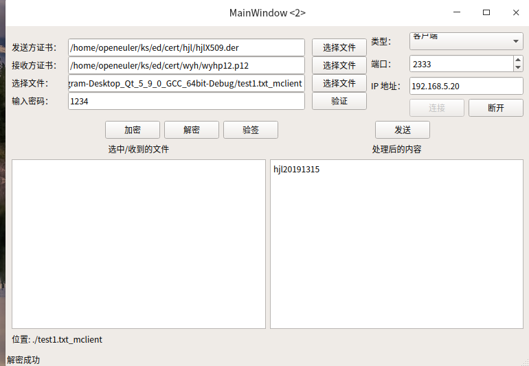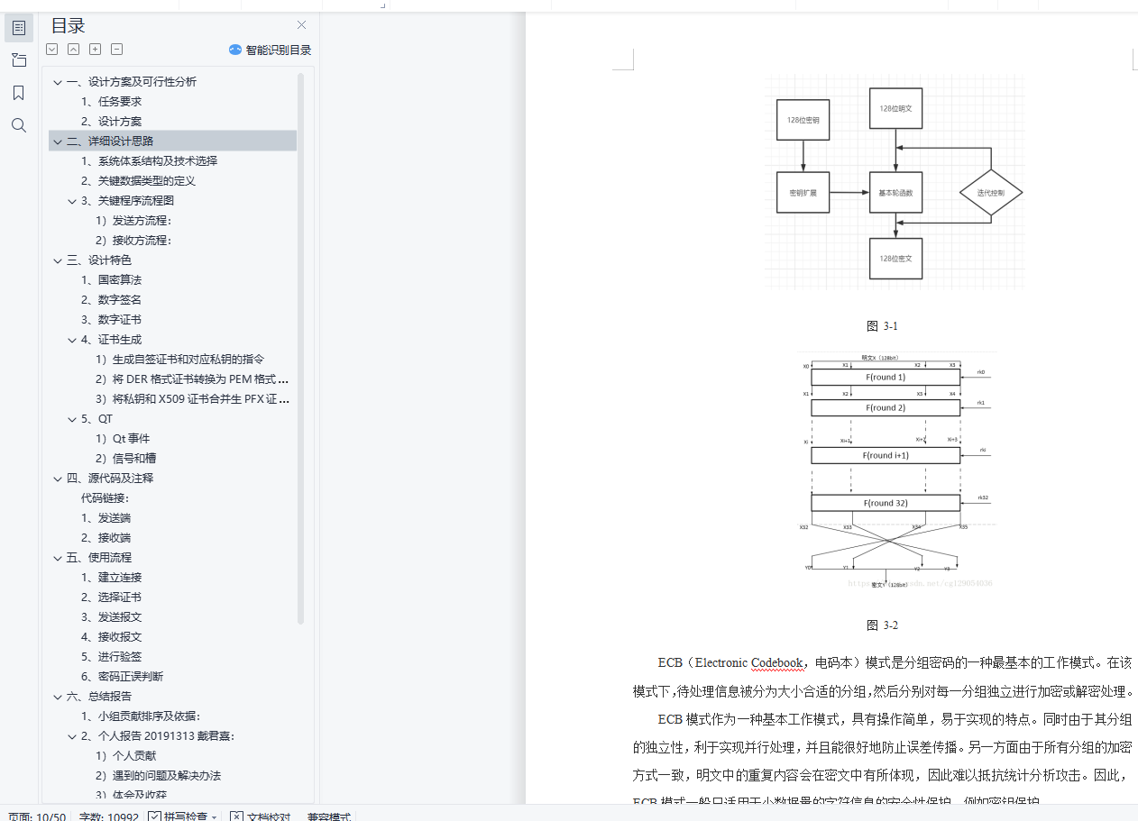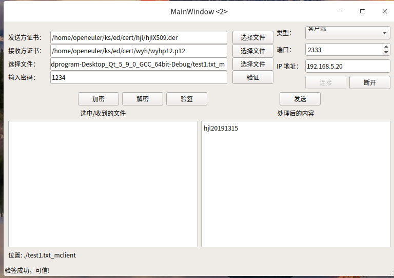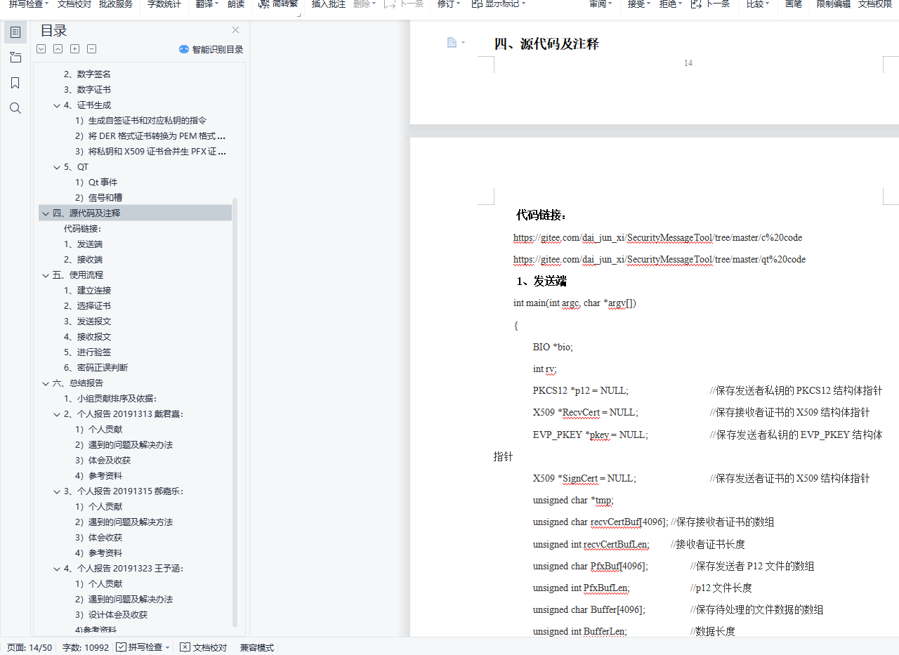目录一、设计方案及可行性分析 21、任务要求 22、设计方案 2二、详细设计思路 41、系统体系结构及技术选择 42、关键数据类型的定义 63、关键程序流程图 71)发送方流程: 72)接收方流程: 7三、设计特色 81、国密算法 82、数字签名 103、数字证书 114、证书生成 121)生成自签证书和对应私钥的指令 122)将DER格式证书转换为PEM格式指令 123)将私钥和X509证书合并生PFX证书指令 125、QT 121)Qt事件 122)信号和槽 13四、源代码及注释 13代码链接: 141、发送端 142、接收端 23五、使用流程 341、建立连接 342、选择证书 353、发送报文 364、接收报文 385、进行验签 406、密码正误判断 40六、总结报告 411、小组贡献排序及依据: 412、个人报告20191313戴君熹: 411)个人贡献 412)遇到的问题及解决办法 413)体会及收获 424)参考资料 433、个人报告20191315郝嘉乐: 431)个人贡献 432)遇到的问题及解决方法 433)体会收获 464)参考资料 464、个人报告20191323王予涵: 471)个人贡献 472)遇到的问题及解决办法 473)设计体会及收获 484)参考资料 48一、设计方案及可行性分析1、任务要求SSL协议解决了通信通道的安全问题。在实际的电子商务中,双方进行通信,不但要求通道安全,还要确保只有接收方才能阅读报文,而且报文要有发送方的签名。这就是典型的签名数字信封的应用。签名数字信封既解决了防抵赖问题又解决了数据保密问题。这次课程设计实现一个安全报文发送和接收的程序。在签名和数字信封之前,需要把私钥和证书准备好。并且使用QT语言为程序设计前端界面。2、设计方案安全报文的发送程序主要实现了对数据报文的数字信封和数字签名。假设A向B发送安全报文,其处理过程如下:1)A生成一随机的对称密钥,即会话密钥;2)A用会话密钥加密明文;3)A用B的公钥加密会话密钥;4)A对原文签名;5)A将密文及加密后的会话密钥以及签名信息传递给B。