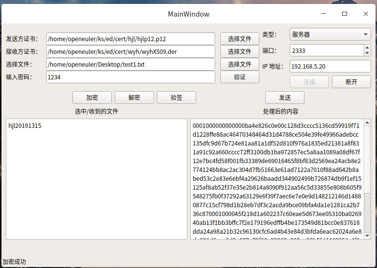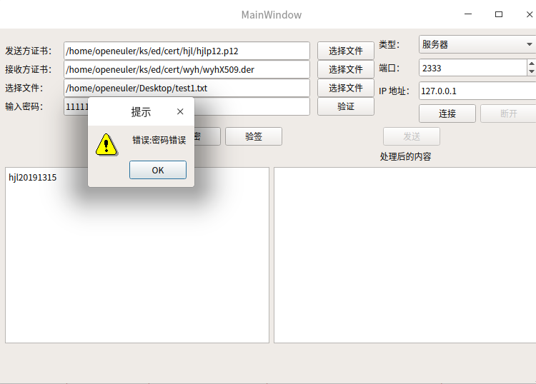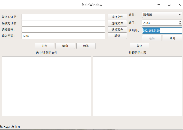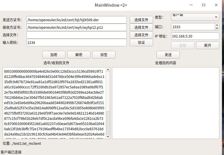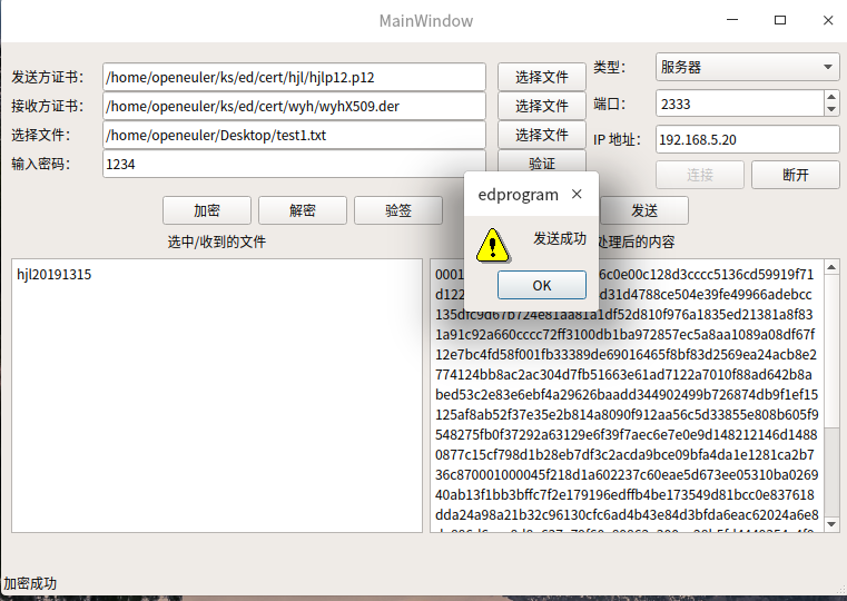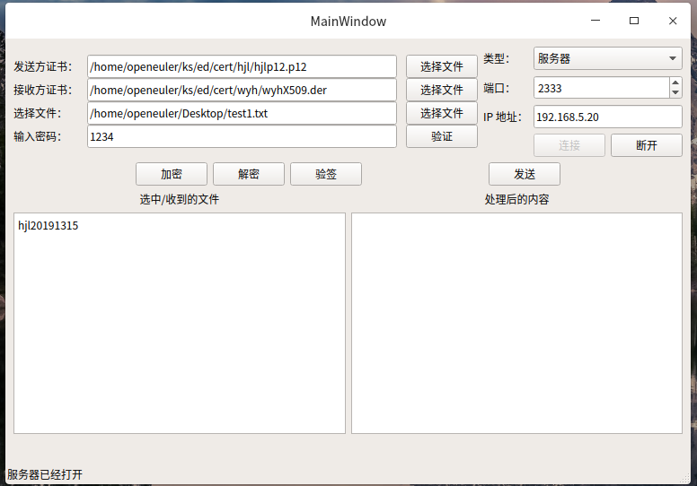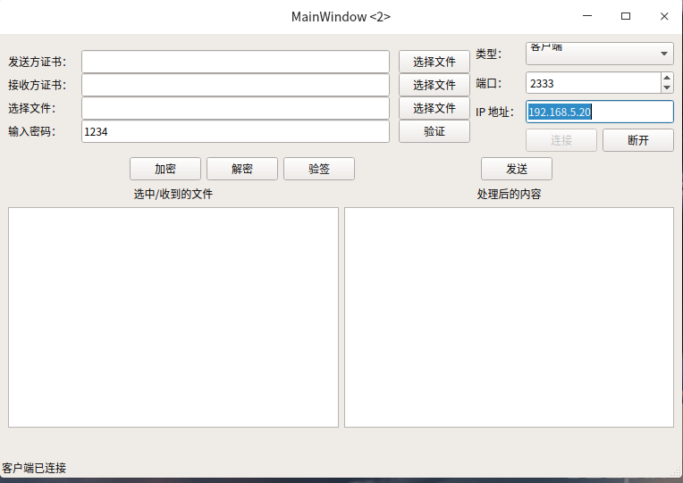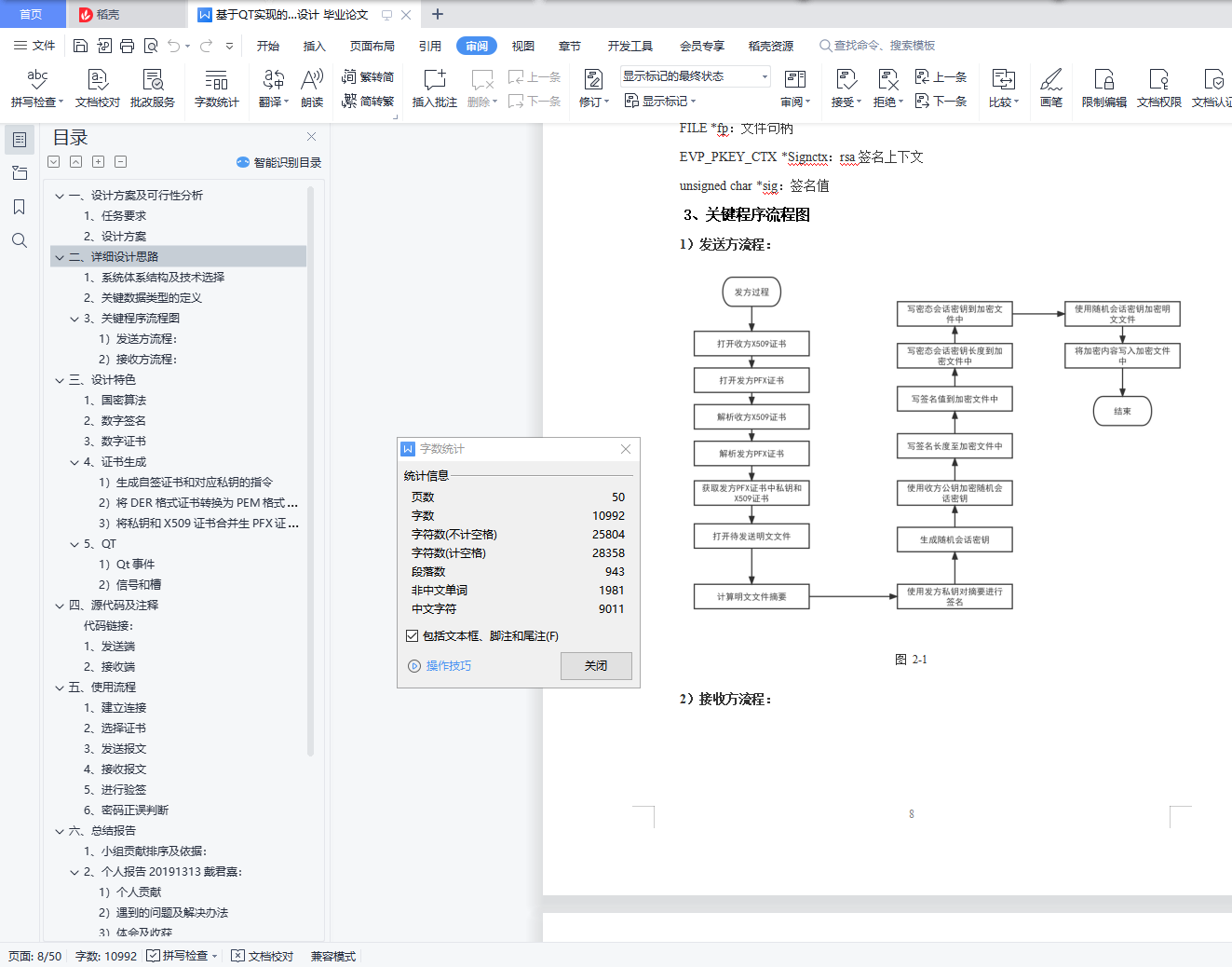 目录一、设计方案及可行性分析 21、任务要求 22、设计方案 2二、详细设计思路 41、系统体系结构及技术选择 42、关键数据类型的定义 63、关键程序流程图 71)发送方流程: 72)接收方流程: 7三、设计特色 81、国密算法 82、数字签名 103、数字证书 114、证书生成 121)生成自签证书和对应私钥的指令 122)将DER格式证书转换为PEM格式指令 123)将私钥和X509证书合并生PFX证书指令 125、QT 121)Qt事件 122)信号和槽 13四、源代码及注释 13代码链接: 141、发送端 142、接收端 23五、使用流程 341、建立连接 342、选择证书 353、发送报文 364、接收报文 385、进行验签 406、密码正误判断 40六、总结报告 411、小组贡献排序及依据: 412、个人报告20191313戴君熹: 411)个人贡献 412)遇到的问题及解决办法 413)体会及收获 424)参考资料 433、个人报告20191315郝嘉乐: 431)个人贡献 432)遇到的问题及解决方法 433)体会收获 464)参考资料 464、个人报告20191323王予涵: 471)个人贡献 472)遇到的问题及解决办法 473)设计体会及收获 484)参考资料 48一、设计方案及可行性分析1、任务要求SSL协议解决了通信通道的安全问题。在实际的电子商务中,双方进行通信,不但要求通道安全,还要确保只有接收方才能阅读报文,而且报文要有发送方的签名。这就是典型的签名数字信封的应用。签名数字信封既解决了防抵赖问题又解决了数据保密问题。这次课程设计实现一个安全报文发送和接收的程序。在签名和数字信封之前,需要把私钥和证书准备好。并且使用QT语言为程序设计前端界面。2、设计方案安全报文的发送程序主要实现了对数据报文的数字信封和数字签名。假设A向B发送安全报文,其处理过程如下:1)A生成一随机的对称密钥,即会话密钥;2)A用会话密钥加密明文;3)A用B的公钥加密会话密钥;4)A对原文签名;5)A将密文及加密后的会话密钥以及签名信息传递给B。