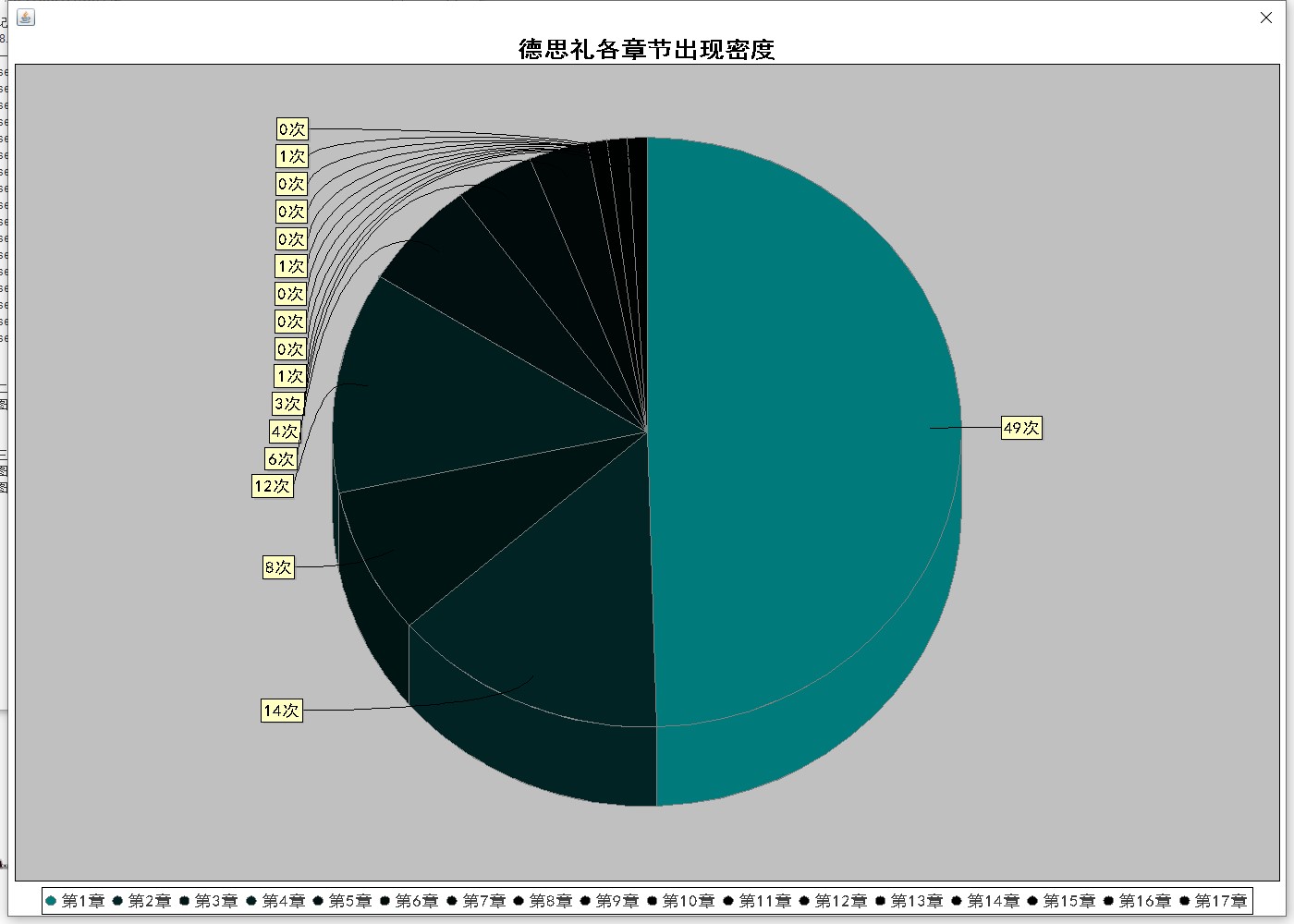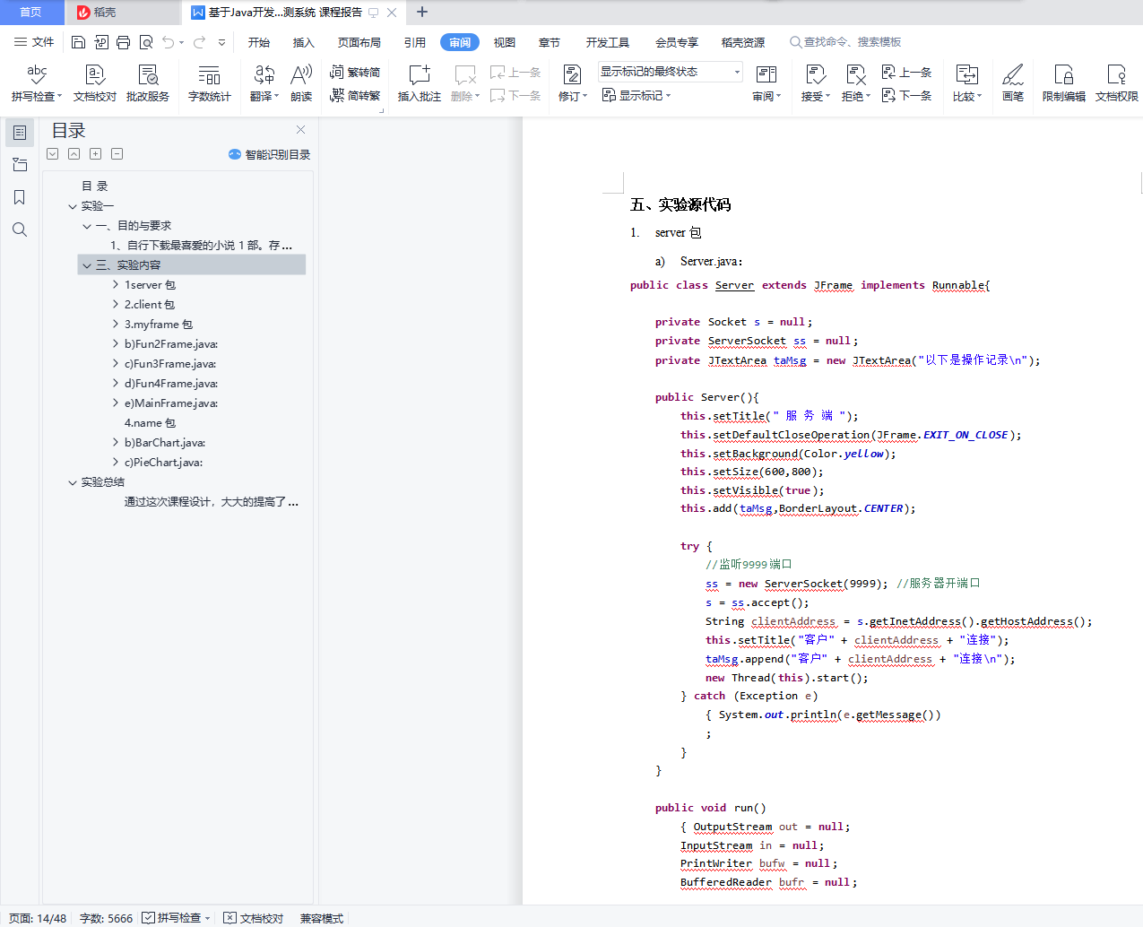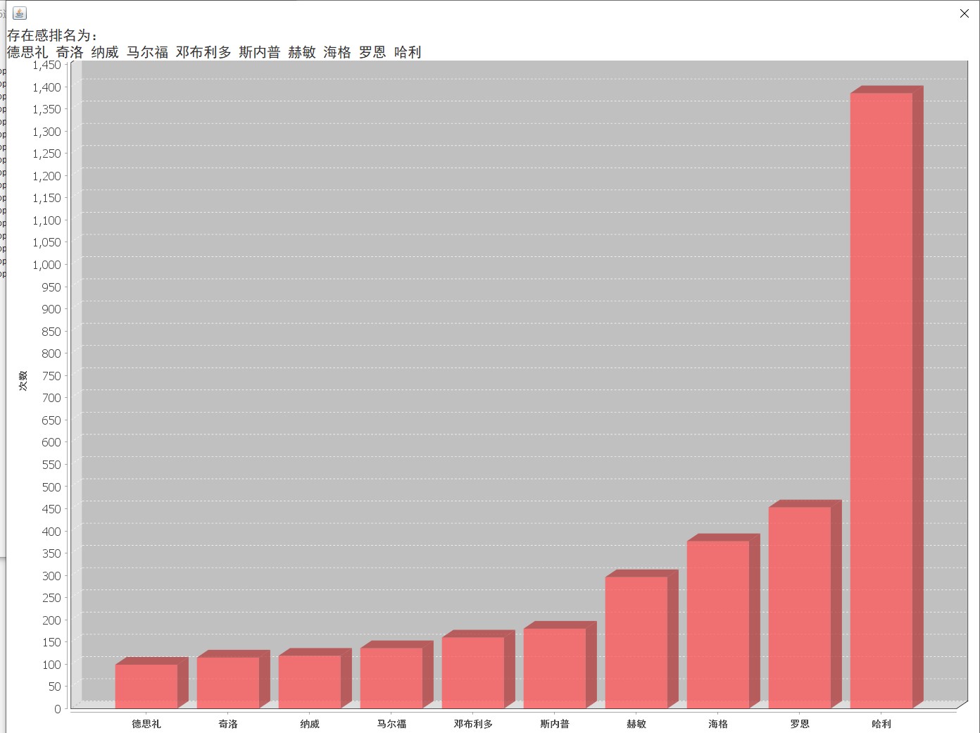 目 录实验一 2一、目的与要求 2二、操作环境 4三、实验内容 4四、实验数据 6实验总结 36实验一一、目的与要求1、自行下载最喜爱的小说 1 部。存到服务器中,格式自定。一般存储为文本文档。要求长篇小说,20 万字以上。举例说明:下载《三国演义》保存在服务器端 。 2、该软件支持从服务器载入小说,对小说中的文本进行分析。举例说明:服务器端保存《三国演义》,客户端进行分析。3、首先运行服务器。服务器运行之后,可以连接 1 个客户端。4、运行客户端。用户能够输入昵称,确定,则连接到服务器。连接成功,即可出现功能界面。客户端功能界面如下:1、功能 1:载入小说。能够选择服务器端的小说。举例说明:客户端点击按钮, 选择服务器端的文件名,《三国演义》传输到客户端。2、功能 2:任意设置 10 个人姓名(可以预设置在客户端界面上),将这 10 个人在小说中的存在感进行排名,用柱状图表示。如何计算存在感?自己定义。点击按钮,存在感排名的柱状图可以保存到服务器端。举例说明:界面上设置“刘备、曹操、张飞、关羽、赵云、诸葛亮、吕布、貂蝉、董卓、孙权”,点击按钮,出现一个柱状图,显示存在感排名为:刘备、曹操、张飞、关羽、诸葛亮、赵云、孙权、吕布、董卓、貂蝉(只是举例说明)。3、每个人在小说中活跃的位置是不一样的。任意输入 10 人中的 1 人,显示他在小说中出现的密度,画出密度图。建议用颜色深浅表示密度。点击按钮,密度图可以保存到服务器端。举例说明:输入“刘备”,在小说中前面部分密度大,后面部分密度小。4、如果两人在相距较短的一段文字中出现,我们认为两人有关系,距离越短, 关系越近;如果多次在较短篇幅出现,则关系更近。对这 10 个人,根据他们关系的紧密程度进行归类,看看可以归为哪几类?并用图形形式直观表示。如何定义关系紧密程度?自己定义。点击按钮,紧密程度归类的图像内容,可以保存到服务器端。举例说明:这 10 个人,自动分为“刘备、张飞、关羽、赵云、诸葛亮”以及“曹操”、“吕布、董卓、貂蝉”、“孙权”(只是举例)。5、附加题,不检查,做了不加分不减分。任意输入一个人,显示他最恨谁,最喜欢谁,最喜欢吃什么,经常去哪里活动,杀人多不多,是好人还是坏人?看与你的直觉是否符合?如果不太符合,说明可能的原因。