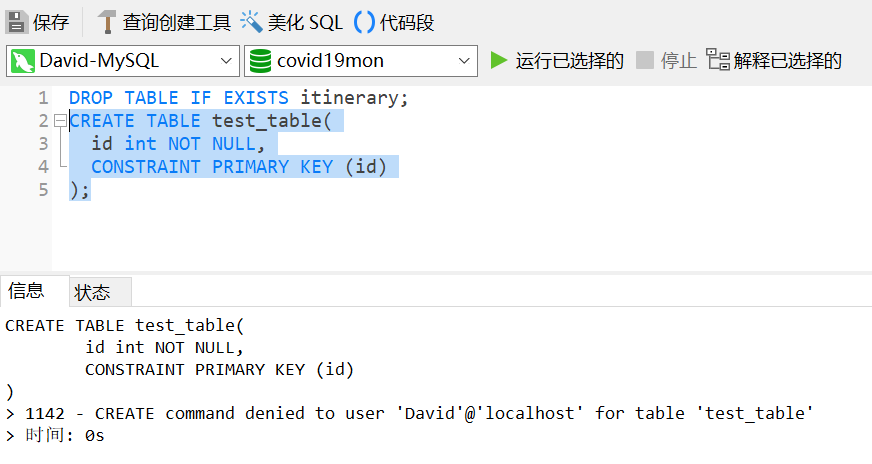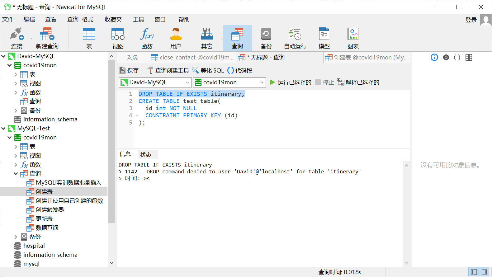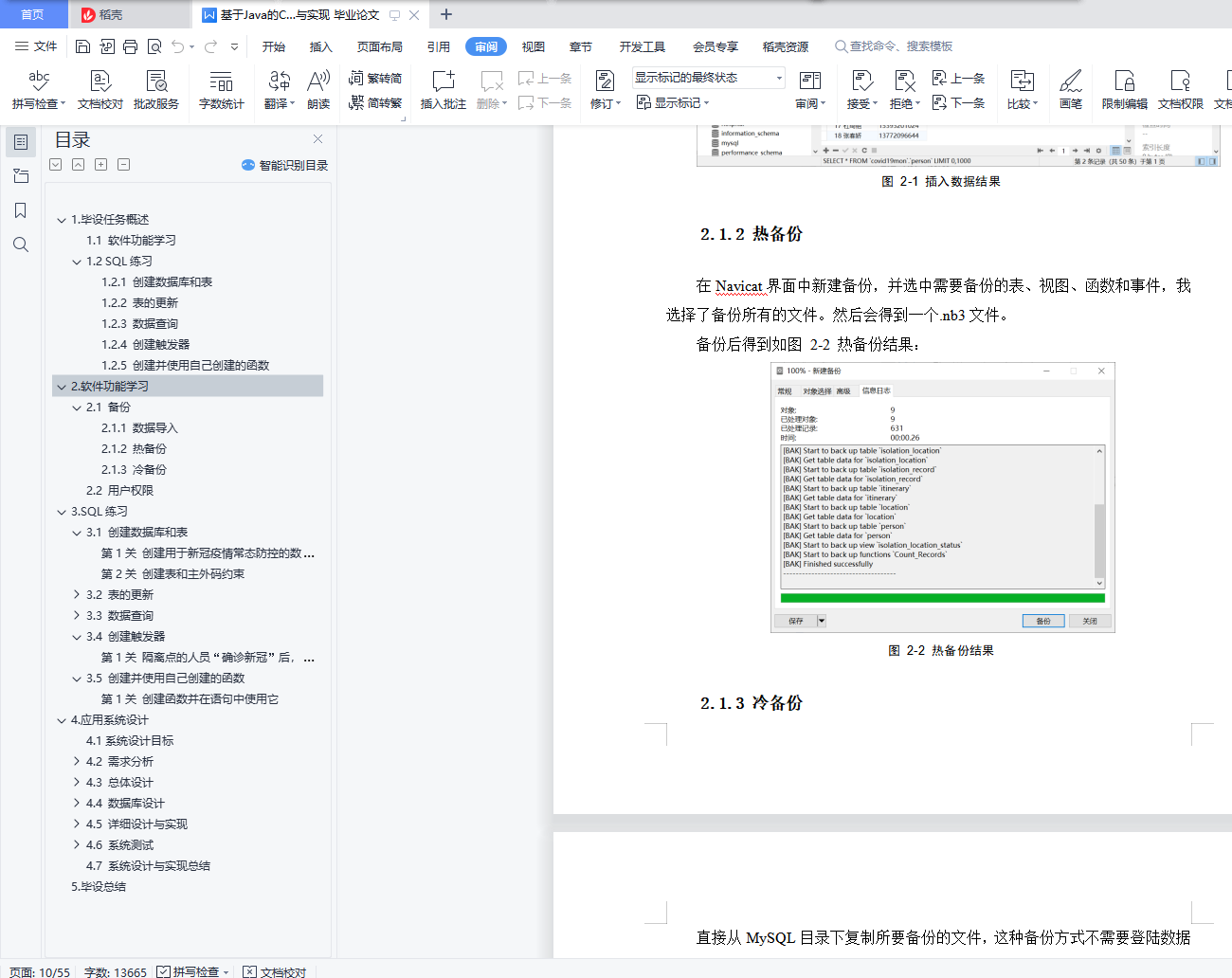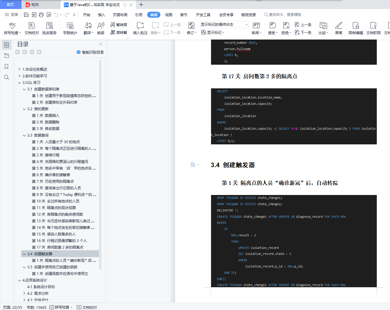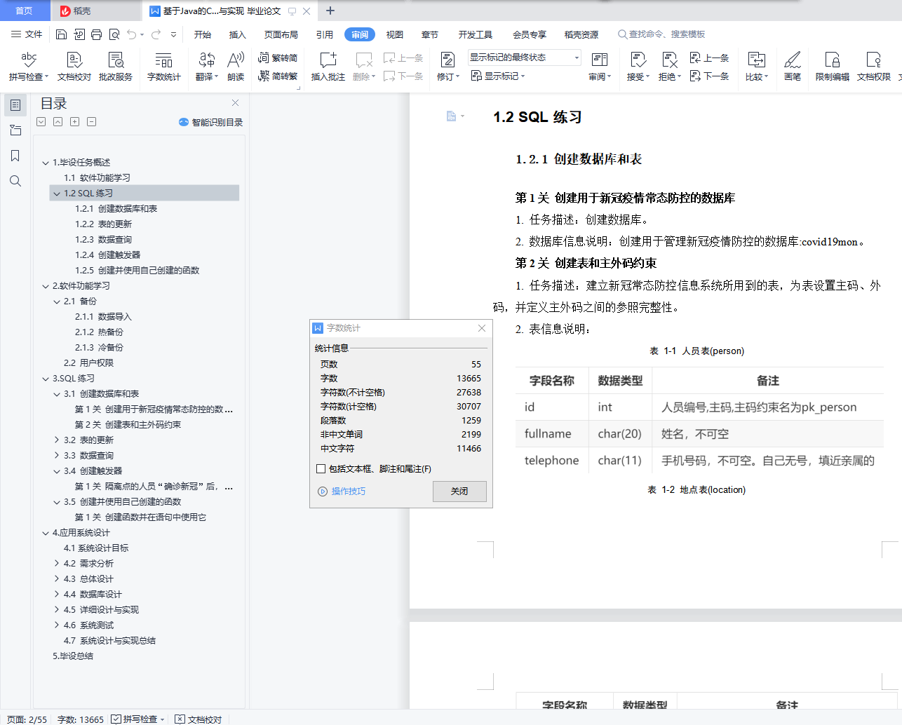 目 录1.毕设任务概述 41.1 软件功能学习 41.2 SQL练习 42.软件功能学习 112.1 备份 112.2 用户权限 133.SQL练习 153.1 创建数据库和表 153.2 表的更新 173.3 数据查询 173.4 创建触发器 243.5 创建并使用自己创建的函数 254.应用系统设计 264.1系统设计目标 264.2 需求分析 264.3 总体设计 314.4 数据库设计 354.5 详细设计与实现 404.6 系统测试 524.7 系统设计与实现总结 565.毕设总结 571.毕设任务概述1.1 软件功能学习1)练习SQL Server或其他某个主流关系数据库管理系统软件的备份方式:数据和日志文件的脱机备份、系统的备份功能。2)练习在新增的数据库上增加用户并配置权限的操作,通过用创建的用户登录数据库并且执行未经授权的SQL语句验证自己的权限配置是否成功。1.2 SQL练习1.2.1 创建数据库和表第1关 创建用于新冠疫情常态防控的数据库1.任务描述:创建数据库。2.数据库信息说明:创建用于管理新冠疫情防控的数据库:covid19mon。第2关 创建表和主外码约束1.任务描述:建立新冠常态防控信息系统所用到的表,为表设置主码、外码,并定义主外码之间的参照完整性。2.表信息说明: