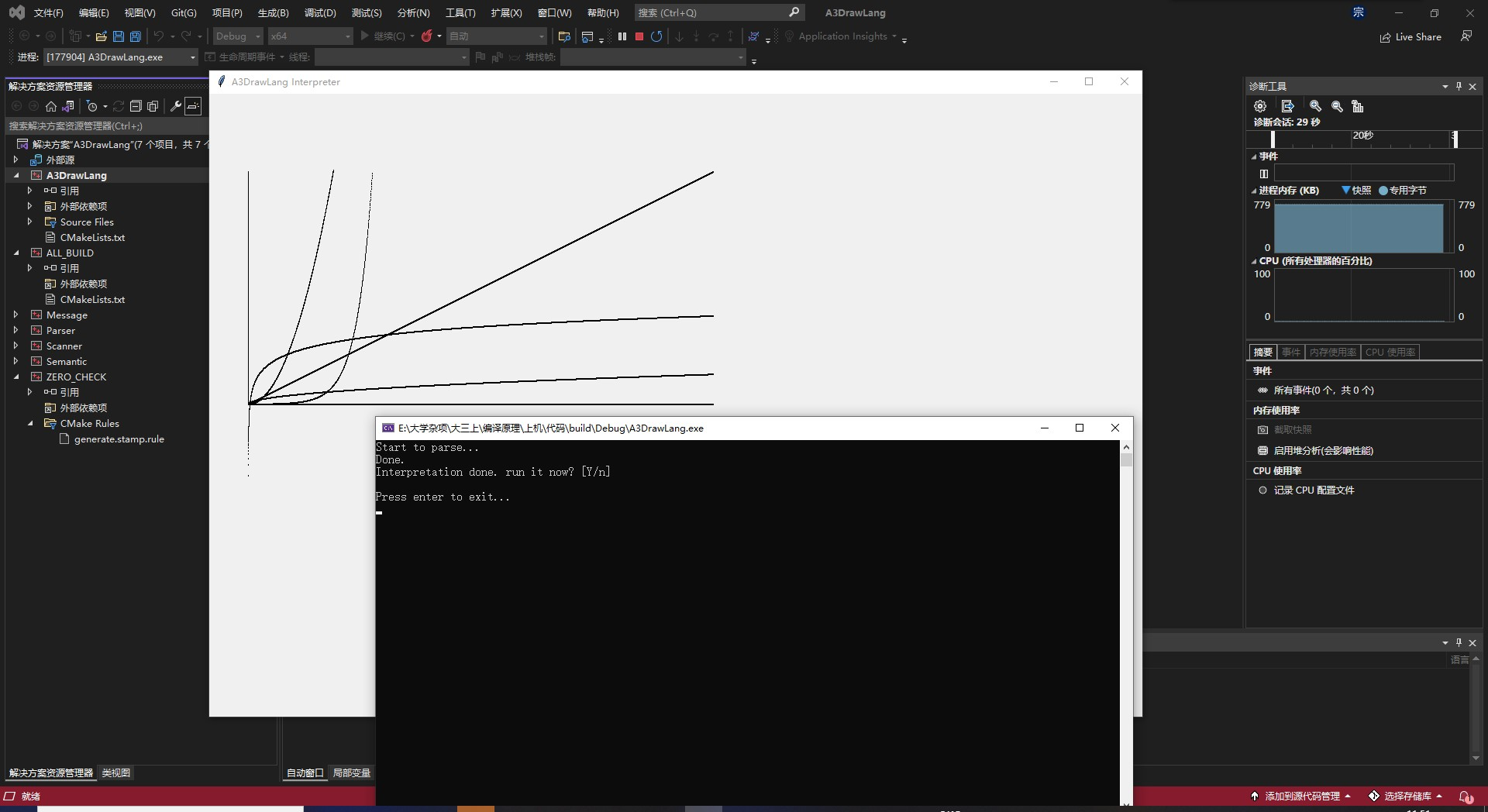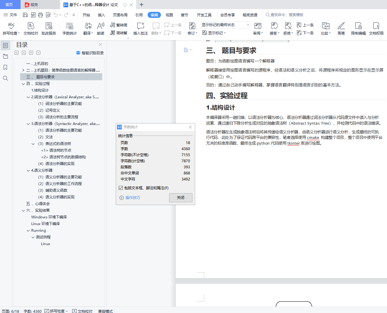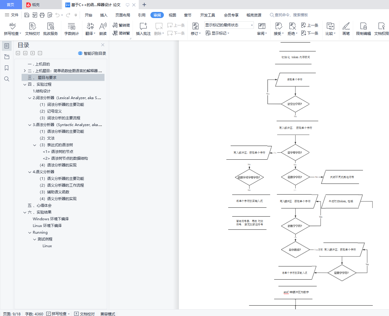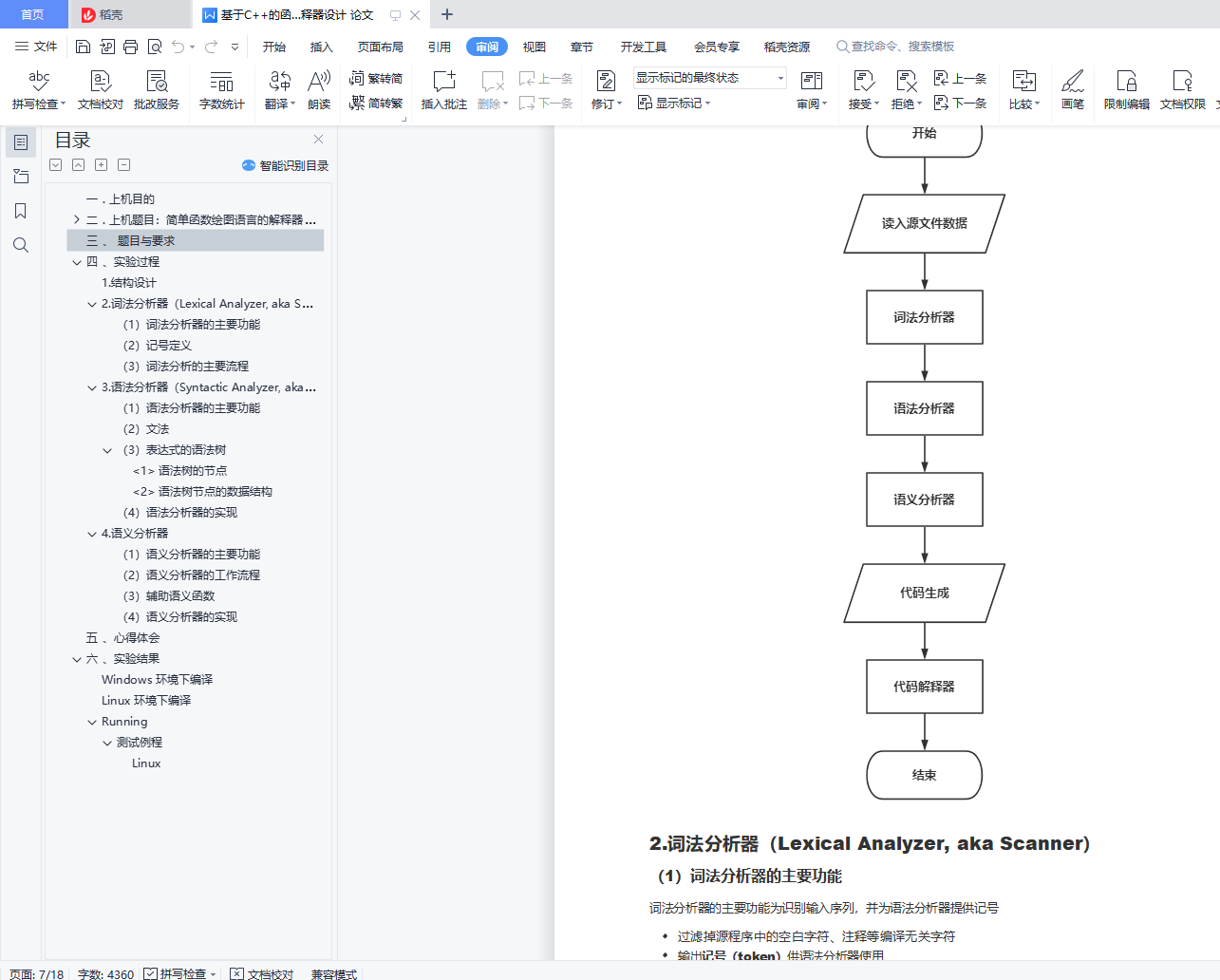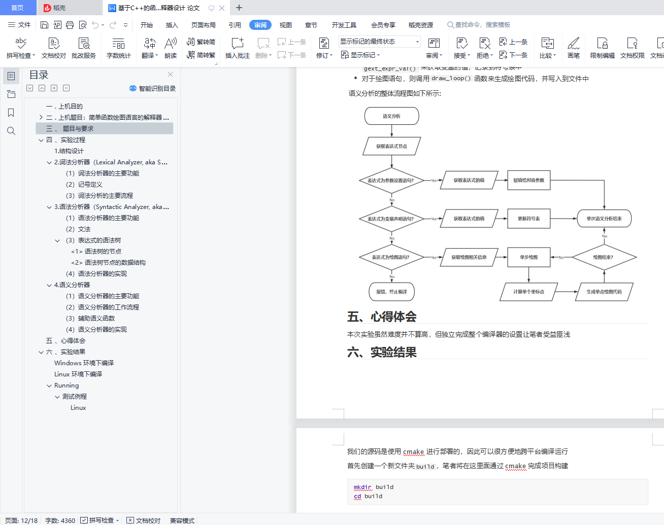 目录一 . 上机目的 1二 . 上机题目:简单函数绘图语言的解释器 12.1 题目简述 12.2 语句的语法和语义(syntax & semantics) 22.3 记号的语法和语义 4三 、 题目与要求 5四 、实验过程 51.结构设计 52.词法分析器(Lexical Analyzer, aka Scanner) 63.语法分析器(Syntactic Analyzer, aka Parser) 94.语义分析器 10五 、心得体会 11六 、实验结果 11Windows 环境下编译 12Linux 环境下编译 14Running 14一 . 上机目的1.会用正规式的产生式设计简单的语言语法2.会用递归下降子程序编写编译器或解释器3.会写上机报告二 . 上机题目:简单函数绘图语言的解释器2.1题目简述<1>实现简单函数绘图的语句循环绘图(FOR-DRAW) 比例设置(SCALE)角度旋转(ROT)坐标平移(ORIGIN) 注释 (-- 或 //)<2> 屏幕(窗口)的坐标系左上角为原点x方向从左向右增长y方向从上到下增长(与一般的坐标系方向相反)
