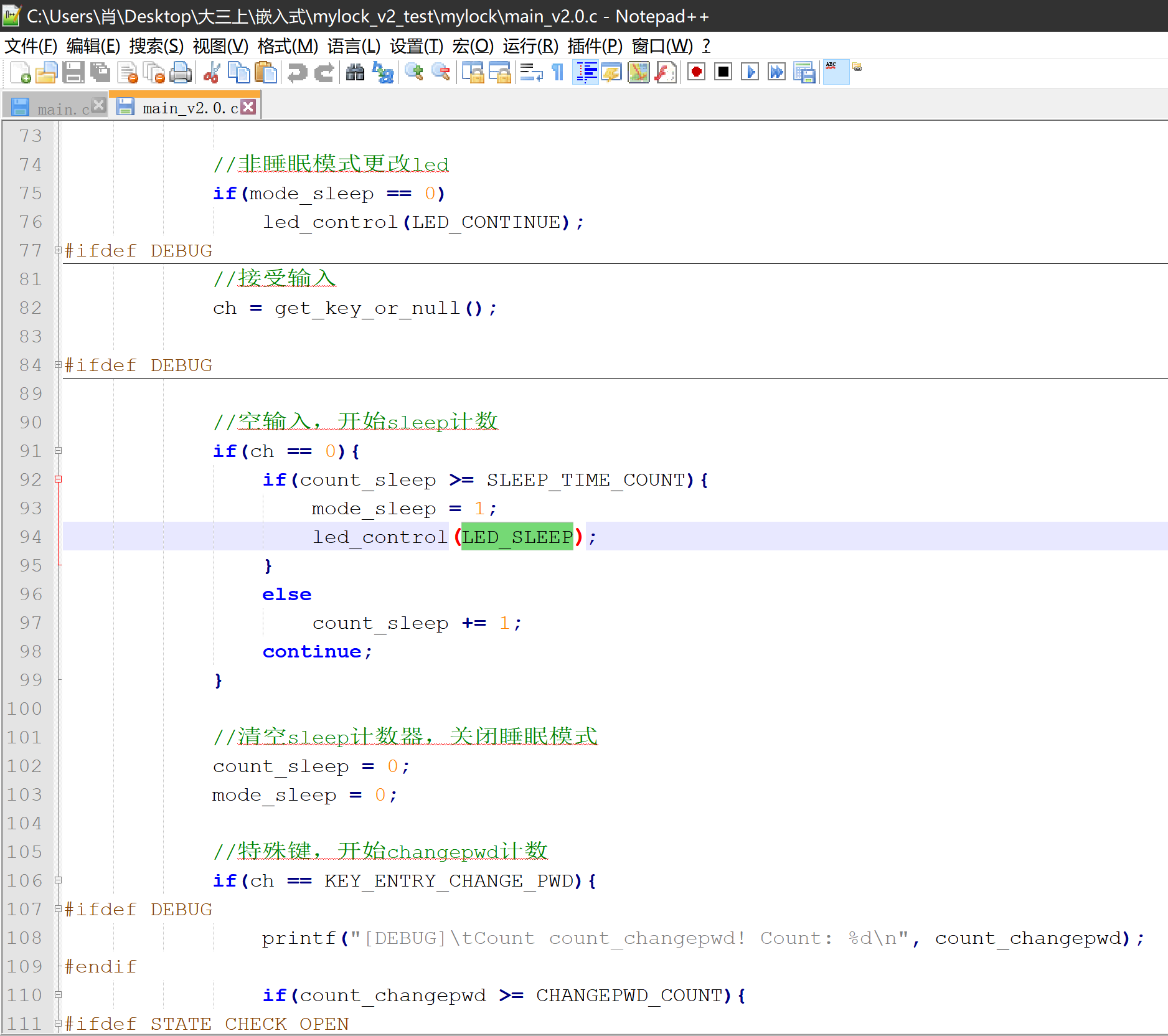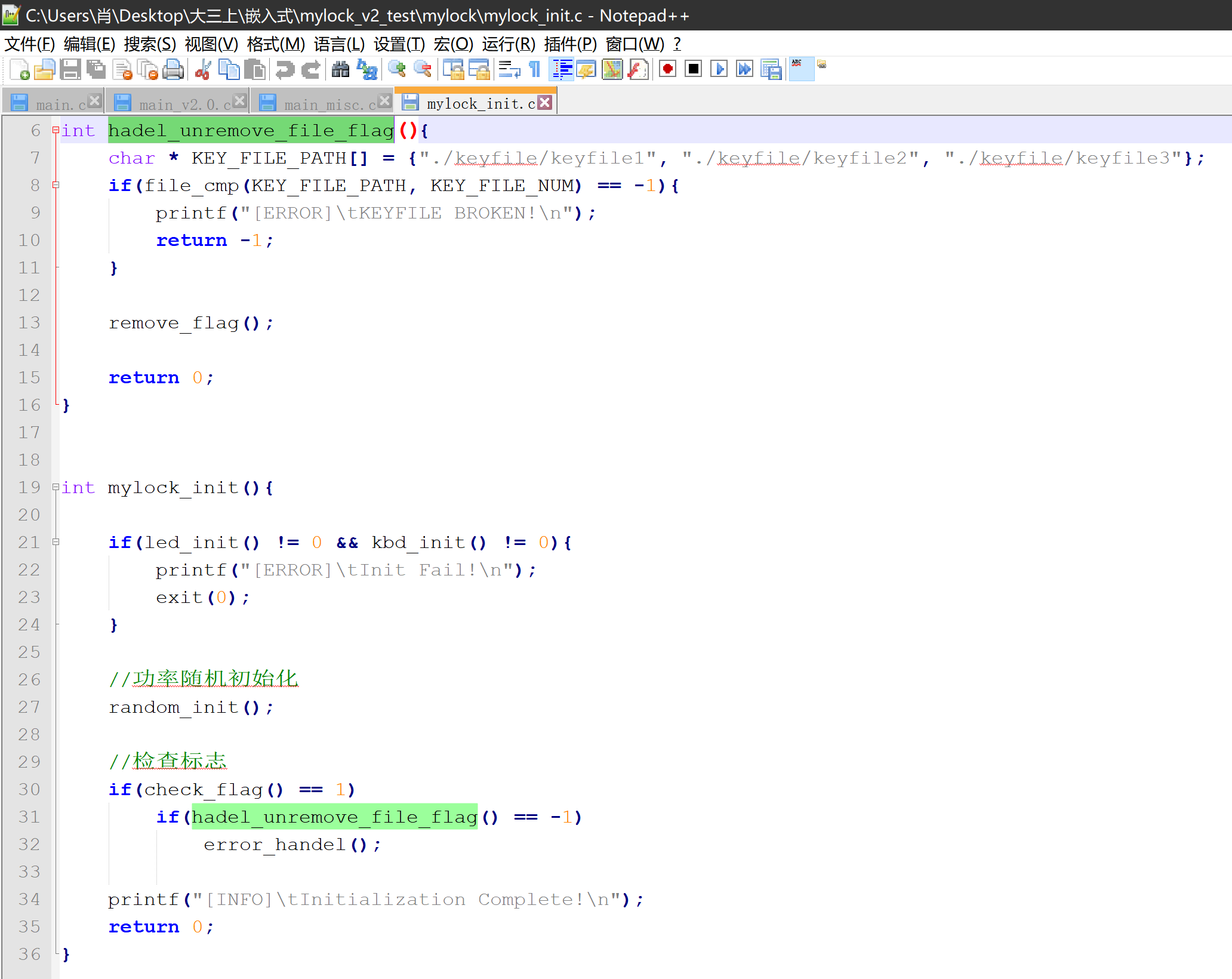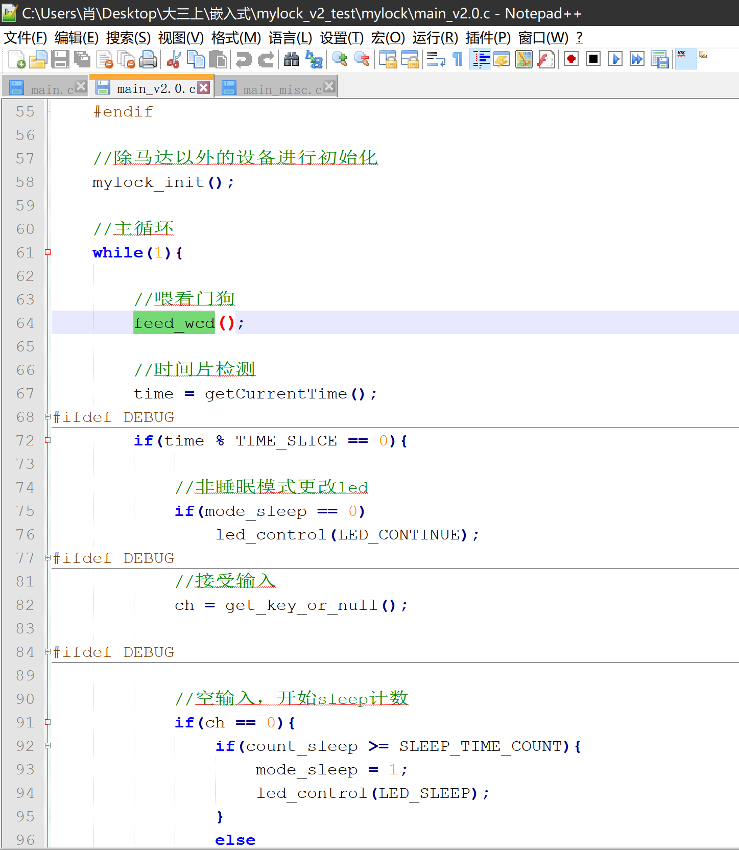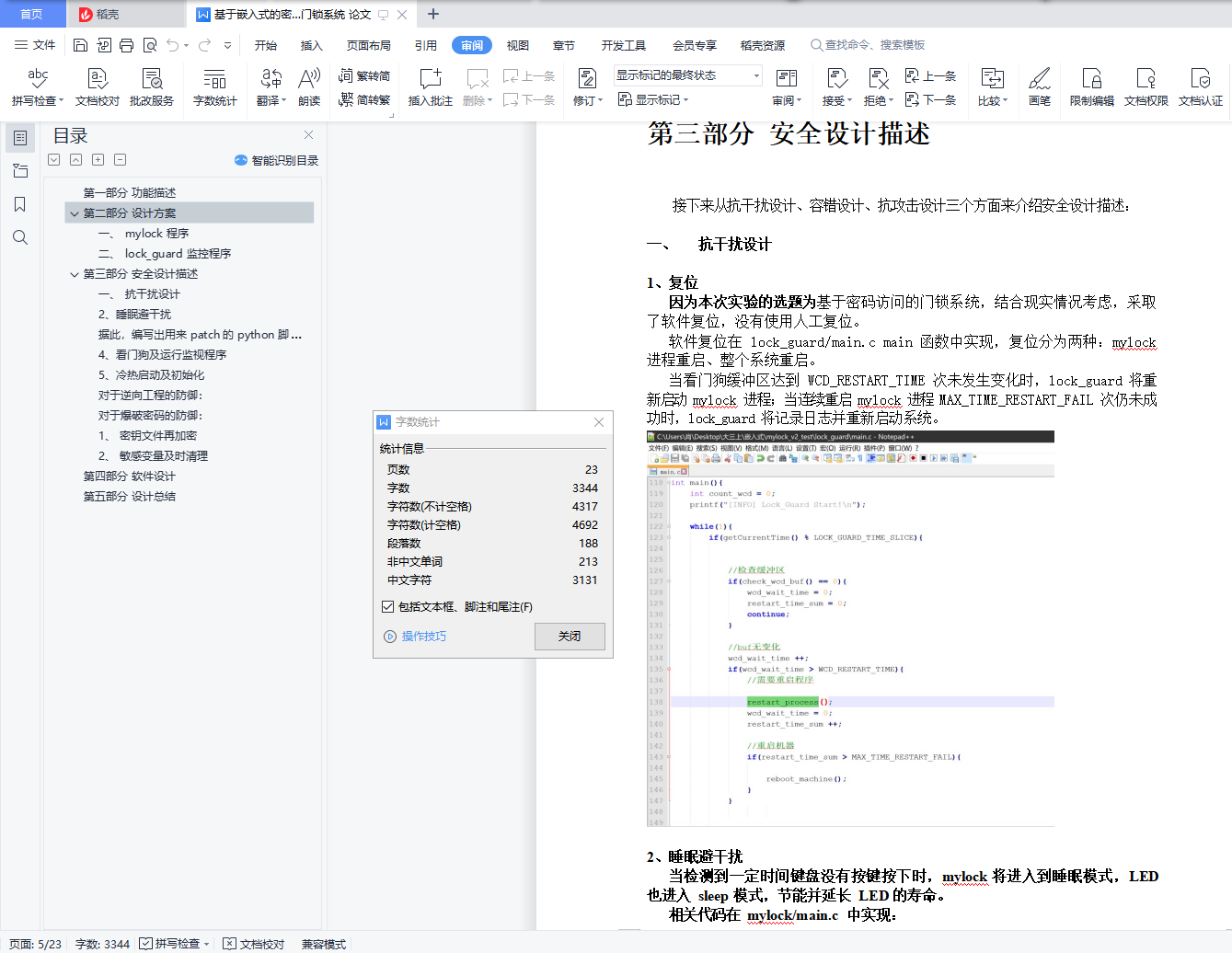 目录第一部分 功能描述 1第二部分 设计方案 1一、 mylock 程序 1二、 lock_guard 监控程序 3第三部分 安全设计描述 4一、 抗干扰设计 42、睡眠避干扰 4据此,编写出用来 patch 的 python 脚本(嵌入式-Patch_nop+call.py): 64、看门狗及运行监视程序 75、冷热启动及初始化 8对于逆向工程的防御: 17对于爆破密码的防御: 181、 密钥文件再加密 182、 敏感变量及时清理 18第四部分 软件设计 19第五部分 设计总结 22第一部分 功能描述本次实验选题为基于密码访问的门锁系统,类似于现代智能家居中的智能门锁。在本次实验中,我实现了通过键盘输入密码,若正确开启门锁(电机),若错误给出提示;并通过 LED 显示提示语以及密码输入的结果;还可以通过连续敲击特殊键,输入正确密码和新密码实现密码的更改。第二部分 设计方案为了达到实验目标,在本次实验中我编写了两个程序:主程序 mylock 以及监控程序 lock_guard,接下来分开介绍两个程序的设计方案。一、 mylock 程序使用了双线程,其中主线程负责接受输入以及进行 hash 校验等,led 线程负责控制 led 输出相应的提示语及结果。主线程的主要架构如下(mylock/main.c):