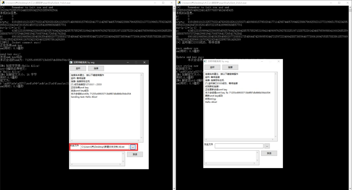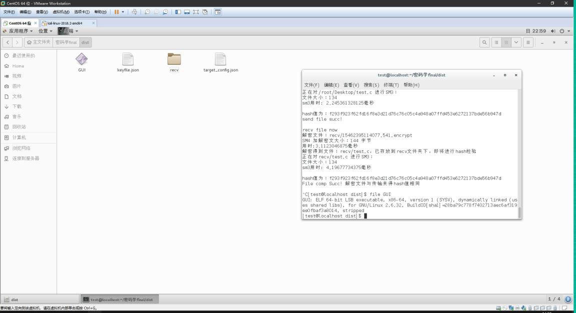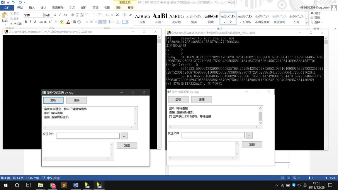目录《密码学》课程设计实验报告 1实验序号:08 实验项目名称:密码学综合实验 1程序使用说明: 4以下为单机情况进行半双工通信为例: 进入到可执行文件的文件夹, 4六、SM4 15其他 18一、 运行速度 18二、 程序占用空间 18三、 安全功能 19四、 算法扩展性 19《密码学》课程设计实验报告实验序号:08 实验项目名称:密码学综合实验学 号姓 名专业、班实验地点 网安学院 A3-1、A3-2 实验室 指导教师时间一、 实验目的及要求教学目的:(1)熟悉适合密码应用的领域及应用方法;(2)掌握一种密码应用技术。实验要求:(1)掌握对称算法的实现;(2)掌握非对称算法的实现;(3)实现下列密码学的一种(或多种)应用:计算机文件加密通信加密认证签名密钥管理(4)掌握加密、签名、认证、密钥管理等技术的综合运用。二、实验设备(环境)及要求Windows 10 64 位Python 3.6.1GUI 库:wxpython三、实验内容与步骤作品名称:基于通信加密的文字文件传输系统简介:本软件是基于通信加密的文字文件传输软件,实现了接收端、发送端二合