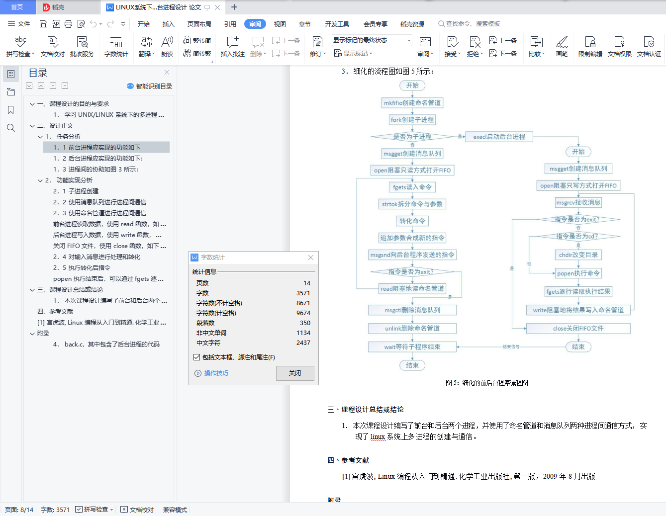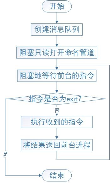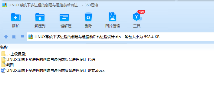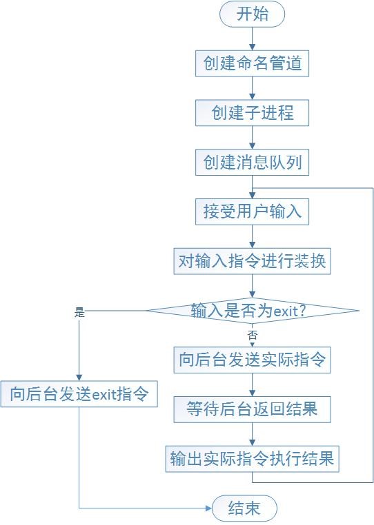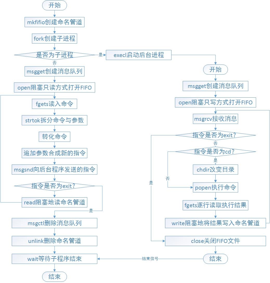 目录一、课程设计的目的与要求 11. 学习 UNIX/LINUX 系统下的多进程创建、控制和通信。 1二、设计正文 11. 任务分析 11.1 前台进程应实现的功能如下 11.2 后台进程应实现的功能如下: 31.3 进程间的协助如图 3 所示: 52. 功能实现分析 52.1 子进程创建 52.2 使用消息队列进行进程间通信 52.3 使用命名管道进行进程间通信 6前台进程读取数据,使用 read 函数,如下 7后台进程写入数据,使用 write 函数,如下: 7关闭 FIFO 文件,使用 close 函数,如下: 72.4 对输入消息进行处理和转化 82.5 执行转化后指令 9popen 执行结束后,可以通过 fgets 逐行读取执行的结果: 9三、课程设计总结或结论 101. 本次课程设计编写了前台和后台两个进程,并使用了命名管道和消息队列两种进程间通信方式, 实现了 linux 系统上多进程的创建与通信。 10四、参考文献 10[1] 宫虎波, Linux 编程从入门到精通. 化学工业出版社, 第一版,2009 年 8 月出版 10附录 104. back.c,其中包含了后台进程的代码 12一、课程设计的目的与要求1. 学习 UNIX/LINUX 系统下的多进程创建、控制和通信。1.1 Linux 上的 bash 和 Windows 中的命令行有很大的不同。但是两者都有完成相似任务的命令,比如 Linux 上 bash 的 ls 命令的功能,类似于 Windows 命令行中的 dir 命令的功能。用 C 语言写一个简单的 Linux 终端软件,接收用户发出的类似于 Windows 命令行中的命令,转换成对应的 Linux 命令加以执行,并将执行的结果回显给用户。比如,用户输入“dir”,进程实际返回“ls”的内容。1.2 软件包含前、后台两个进程,用户启动前台进程时,前台进程自行启动后台进程。前台进程提供界面,负责接收用户输入,对输入进行转换,并向后台进程发出实际要执行的指令,后台负责执行实际的指令,并将指令执行的结果返回给前台进程,由前台进程在终端显示。二、设计正文1. 任务分析1.1 前台进程应实现的功能如下创建消息队列创建命名管道接受用户输入对输入进行装换向后台发送实际要执行的指令等待后台返回结果输出指令执行的的结果若输入的指令是 exit 则向后台发送 exit 命令删除消息队列删除命名管道等待后台进程退出
