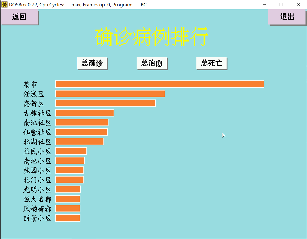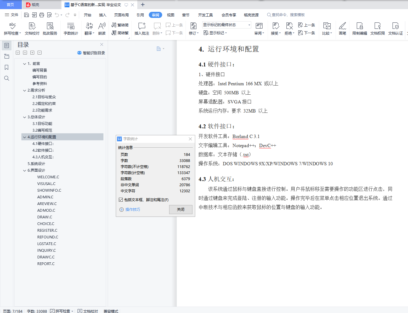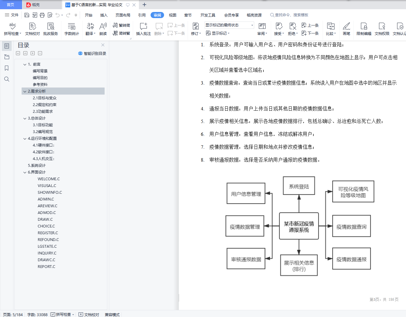 目录1.前言 3编写背景 3编写目的 3参考资料 32.需求分析 42.1目标与受众 42.2假定和约束 42.3功能需求 53.总体设计 63.1目标功能 63.2编写规范 64.运行环境和配置 74.1硬件接口: 74.2软件接口: 74.3人机交互: 75.系统设计 85.1系统架构设计: 85.2软件结构设计 95.2 各模块的调用与接口设计 156.界面设计 167.数据结构 318.时间安排 339. 源代码: 34WELCOME.C 34LOGIN.C 36VISUSAL.C 42SHOWINFO.C 53ADMIN.C 59AREVIEW.C 62ADMOD.C 71DRAW.C 81CHOICE.C 86REGISTER.C 97REFOUND.C 103LGSTATE.C 109INQUIRY.C 127DRAWC.C 133REPORT.C 139GETTIME.C 144DAYINFO.C 145ADUSER.C 158ADOP.C 175MAIN.C 18010.总结 183组员总结 183组员总结 18411.代码分工 1861. 前言编写背景2020 年,新型冠状病毒(Covid-19)引发了全球大流行疫情,截至 2020 年 9 月 14 日,全球已有 188 个国家和地区累计报告逾 2,900.6 万名确诊病例,其中至少约 1,962.5 万人已康复、至少约 92.4 万人死亡。疫情扩散对全球航空、旅游、娱乐、体育、石油市场、金融市场等方面造成巨大影响。该传染病传染性极强,目前尚无针对新型冠状病毒的预防疫苗及治疗方法。由于该病传染性强且潜伏期为 14-28 天,初步判断外来人员的被感染风险显得极为重要。目前各国都已建立了一套完备的自下而上的疫情通报系统:由基层社区、医院等逐层上报,汇总到数据中心进行处理,计算出新增,累计,死亡与治愈等病例数据;结合大数据技术,制作出涵盖各级行政区的“疫情地图”,并进行可视化处理,从而方便公众及时了解疫情信息。目前较为典型的有中国疾控中心疫情分布系统(http://2019ncov.chinacdc.cn/2019-nCoV/)、WHO 疫情地图(https://covid19.who.int/)、约翰・霍普金斯大学疫情地图(https://coronavirus.jhu.edu/map.html)。笔者设计了这个新冠疫情通报系统,旨在使居民能够了解本地区疫情状况,以便能够获取最新疫情动态、判断被感染风险、及时储存物资。对于医疗工作者而言,他们可以利用该系统向上通报所在单位当日疫情新增、治愈与死亡人数。对于普通用户而言,可以了解到该地区新增、累计病例,并能从可视化地图上了解该地区风险等级,保护自己与他人的健康。编写目的该项报告对于整个“某市新冠疫情通报系统”进行了全面的用户需求与功能的分析。包括可行性分析、需求分析、系统功能设计、代码实现、集成测试等等。本报告明确了本软件系统架构设计,软件结构与数据结构设计,各模块之间的接口和调用,系统界面设计,系统功能设计(函数罗列)。同时,该项报告也明确了两位开发者的分工。参考资料1.王士元. C 高级实用程序设计. 北京: 清华大学出版社. 1996 年2.周纯杰,何顶新等. 程序设计与应用(用 C/C++编程). 北京: 机械工业出版社.2008 年3.[美] Prata. C Primer Plus(第六版)北京:人民邮电出版社. 2016 年4.严蔚敏,吴伟民编著. 数据结构(C 语言版)北京:清华大学出版社. 2018 年