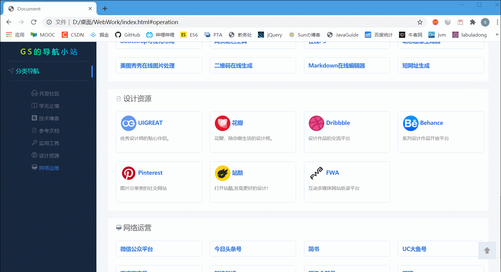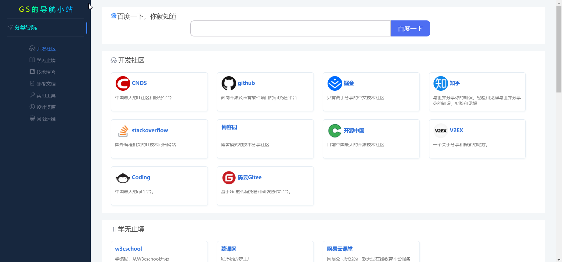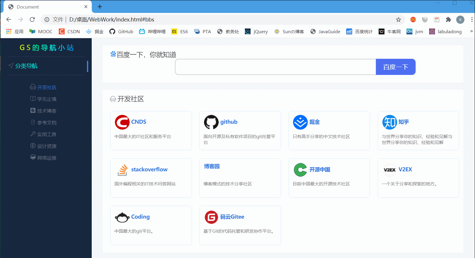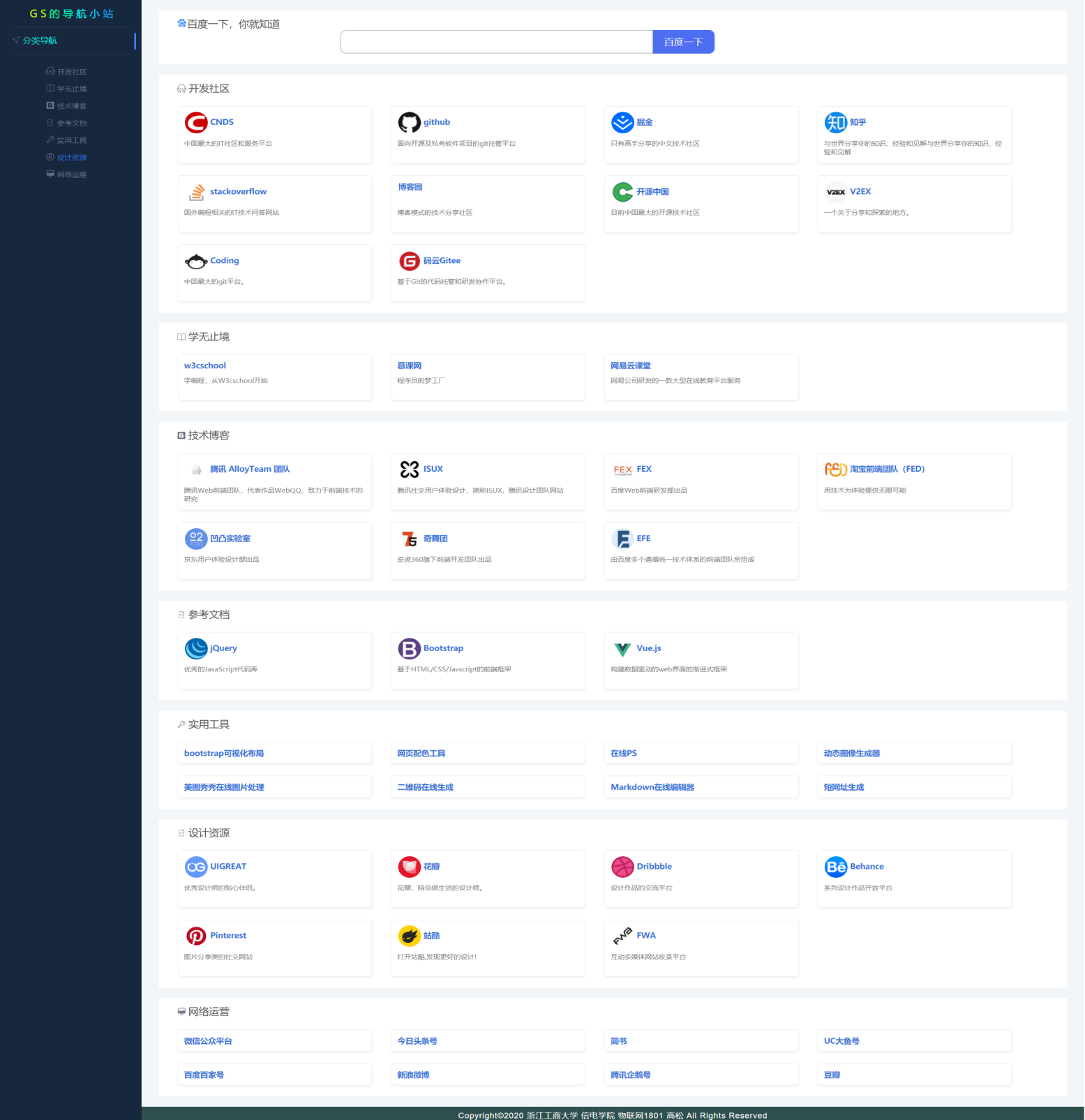 目录选题简介 1设计理念 1用户市场分析 1案例分析 2网站介绍及使用 2开发总结 7不足与后续展望 9选题简介经过十周左右的学习,掌握了基本的html、css 和 JavaScript 并对其产生了浓厚的学习兴趣。时间过得很快,这门课马上也要结课了,想了很多选题,最后我还是想做一个导航相关的网页。自己断断续续花了快一周的时间做了一个网页导航的网页作为我的期末大作业,也是对我所学过知识的总结与应用。设计理念从互联网时代到移动互联网时代,一直流传着一句话,得入口者的天下,入口是指用户寻找信息、解决问题的方式,成为入口意味着获得巨量的用户。虽然掌握用户并不直接等同于商业变现,但如果失去这个阵地,也就同时失去了成为行业巨头的机会。从微软做windows占领了PC的桌面,google做Android占领了手机的搜索框,到现在的浏览器、网址导航、手机桌面、手机应用市场,其初衷还是占领入口。作为学生,我们每天都在打开浏览器,在互联网上寻觅我们想要的信息,所以一个好的网页导航作为我们的入口,这应该是非常不错的。但是随着现在互联网的发展,很多网址导航变得很臃肿,还有很多广告,用户体验非常不好,有的流氓软件甚至自动更改我们的主页,真的让用户很恶心。所以自己学习了网页设计这门课,最后就想自己弄一个简约、没有广告、页面美观的网页导航,设计理念就是:简约、没有广告、美观。用户市场分析学生和公司职员是网址导航的主力用户,性别男性居多,在年龄层面偏年轻化,由于网址导航的便利性,低龄用户群体将会越来越多。所以这个市场还是非常大的,一个好的网页导航,只要能站在用户角度思考问题,帮助用户解决问题,做出让用户满意的产品,后续的市场肯定是不小的。互联网在日益成熟,网民的理解程度和需求也相应的在提高,普通的网址推荐已经很难满足用户的需求,那么网址导航类网站该如何改进呢,我觉得有下面几点:实用简约+年轻时尚化+个性化定制。案例分析1999年,网络在中国逐渐普及,当时中文网站不仅内容不够丰富,数量也较少,而且复杂的英文域名很难记忆,对于那时候连打字都困难的网民来说,在网上找资料的确不是件易事。此时,第一代网址导航应运而生,仅仅是以网站收录归类为主,便获得了广大网民的青睐,国内比较早的是李兴平创建的hao123导航和后来蔡文胜创建的265导航,而后分别被百度和谷歌两家巨头纳入旗下。说到发展史,不得不提到hao123,于1999年5月由李兴平创建,不仅是国内网址导航的鼻祖,也是第一个被互联网巨头百度认可并收购的网站;蔡文胜是笔者到现在都非常崇拜的一个草根创业者,当年卖域名赚得了人生第一桶金,就是这样一个具有慧眼的创业者创办的265导航也足足比hao123晚了4年,不过在2008年也被谷歌中国斥巨资收购了。这两个网页导航为什么能做得如此成功,我觉得就是抓住用户的痛点,真真实实为用户解决问题。网站介绍及使用我的网页导航大体分三部分,左边的导航栏、右边的主内容栏、还有最下面的版权信息声明,当然我也加入了一些有用的功能,提升用户体验。先看一下进去的页面吧: