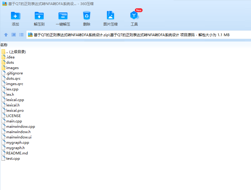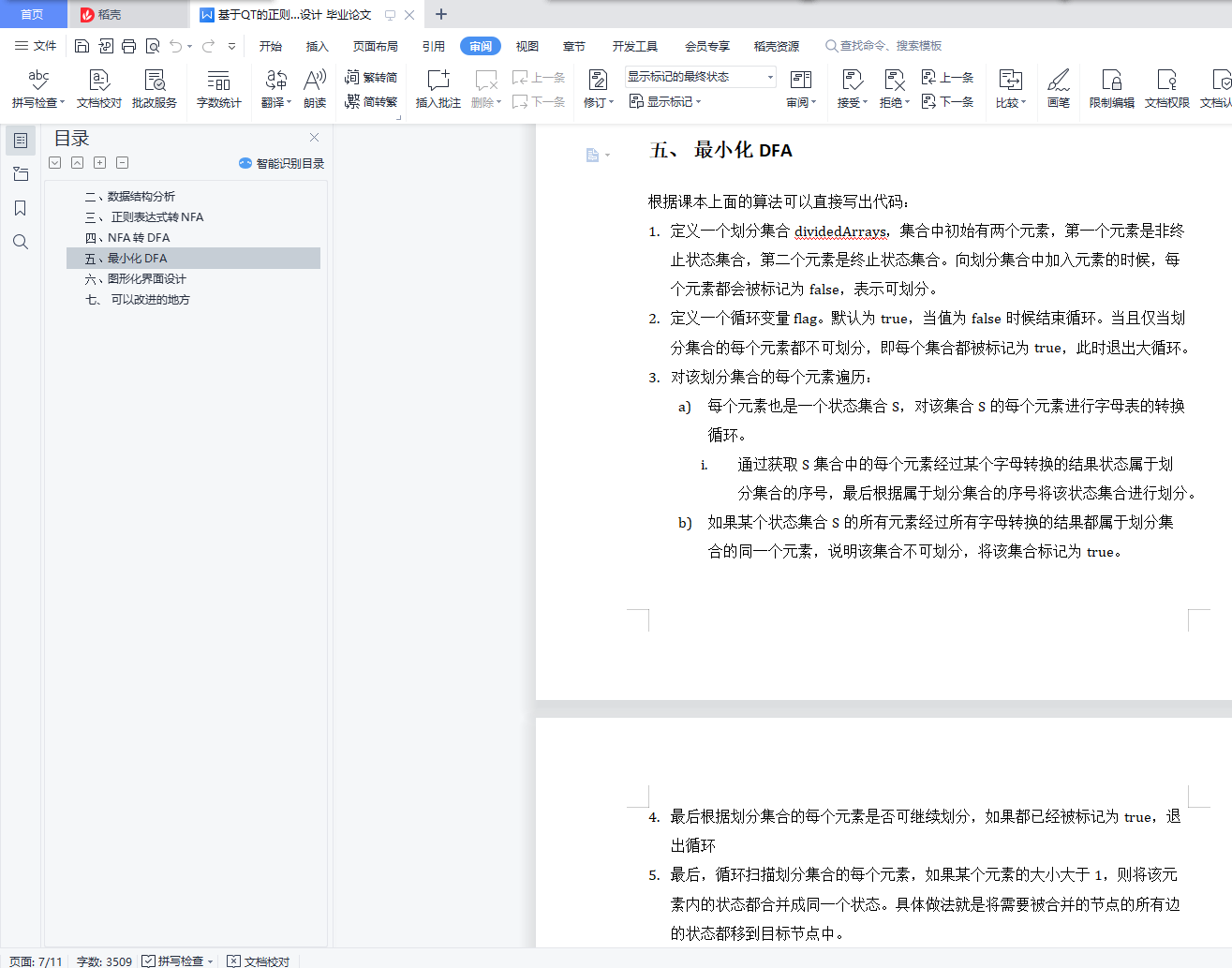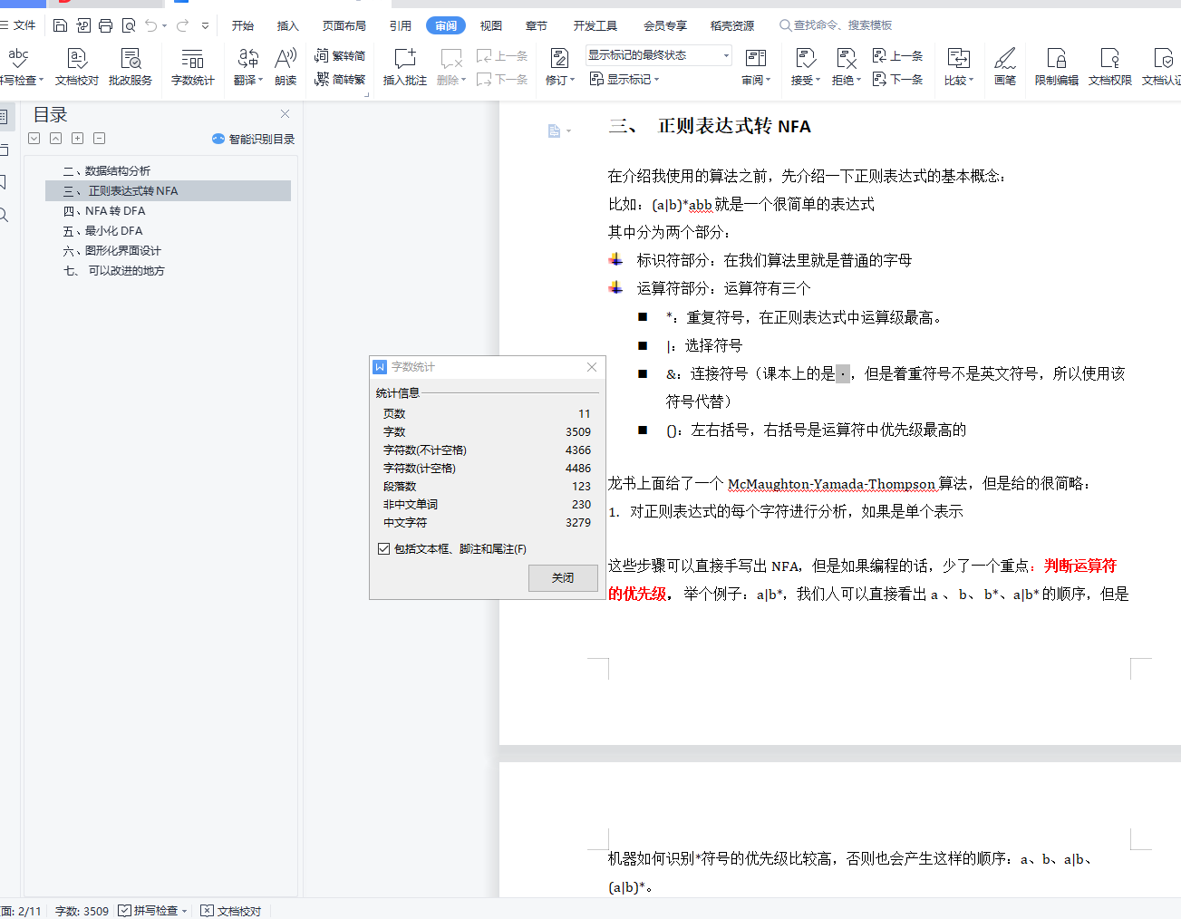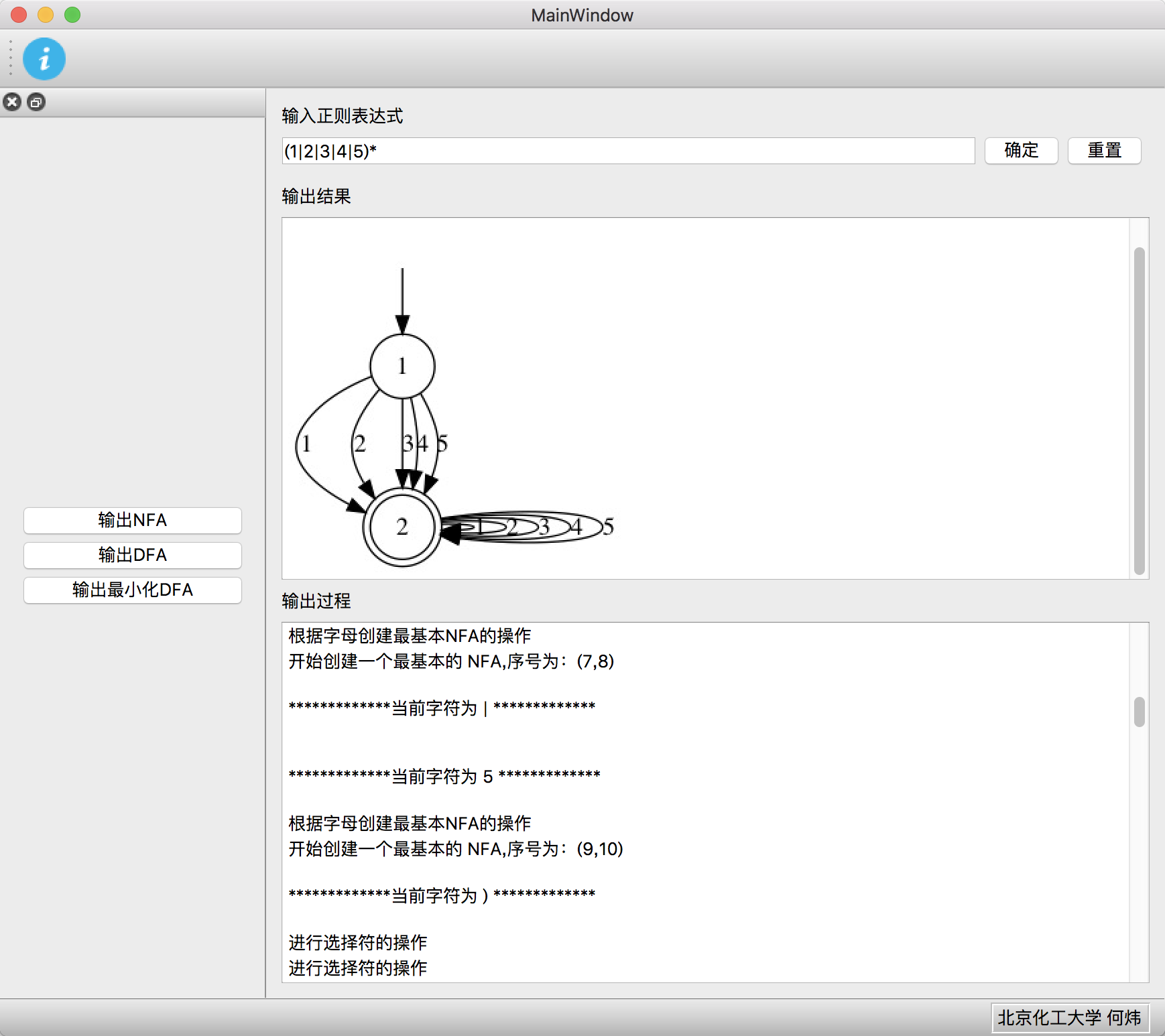 目录一、 编程环境 1二、 数据结构分析 1三、 正则表达式转NFA 2四、 NFA转DFA 6五、 最小化DFA 7六、 图形化界面设计 8七、 可以改进的地方 10一、编程环境语言: c++ 11IDE:qt creator、 CLion界面库:qt、GraphViz开发平台:mac,Windows下未做测试编译该项目,必须本地已经下载安装GraphViz,并且需要修改lex.h中的dot常量为你的系统中dot命令的位置。如果是mac系统,你可以通过 which dot 查看具体位置。const string dot = "/usr/local/bin/dot";二、数据结构分析正则表达式由用户输入,使用string类型简单存储,正则表达式分为两个部分:运算符部分和标识符部分NFA和DFA类的成员变量:MyGraph:因为NFA,DFA每个节点有多个出度,多个入度,用图表示最合适的存储方式,定义了图的数据结构用来存储整个数据StartStatus:存储开始状态序号,相当于头部指针EndStatus:存储结束状态序号,相当于尾部指针mVexs:对应的NFA或者DFA的节点集合,NFA集合是一维数组,DFA的节点集合是二维集合,每个节点的信息为对于的NFA转换的状态集合MyGraph:图的具体实现mMatrix: 使用一个二维整形数组存储了节点的边之间的关系,值为一个char型的vector,这里是考虑到两个节点之间可能有多条同向边。mVexNum:节点的数量,辅助变量,便于后面的分析。mEdgeNum:边的数量,辅助变量,便于后面的分析。