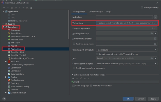 其中--module-path后面跟的路径(红色高亮部分)为前面安装JavaFX包目录下面lib子目录的路径。做好上面的配置先点击Apply,再点击OK。