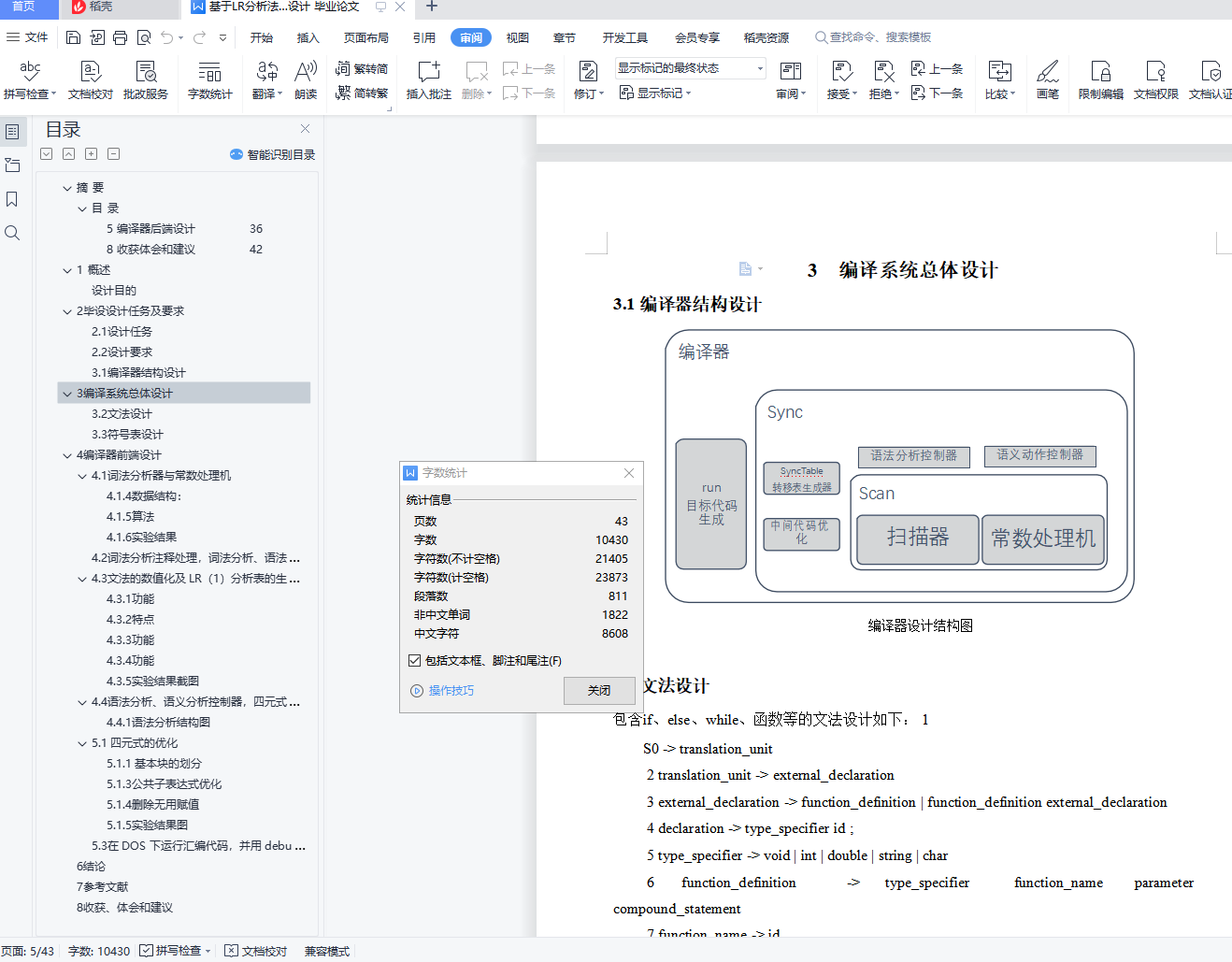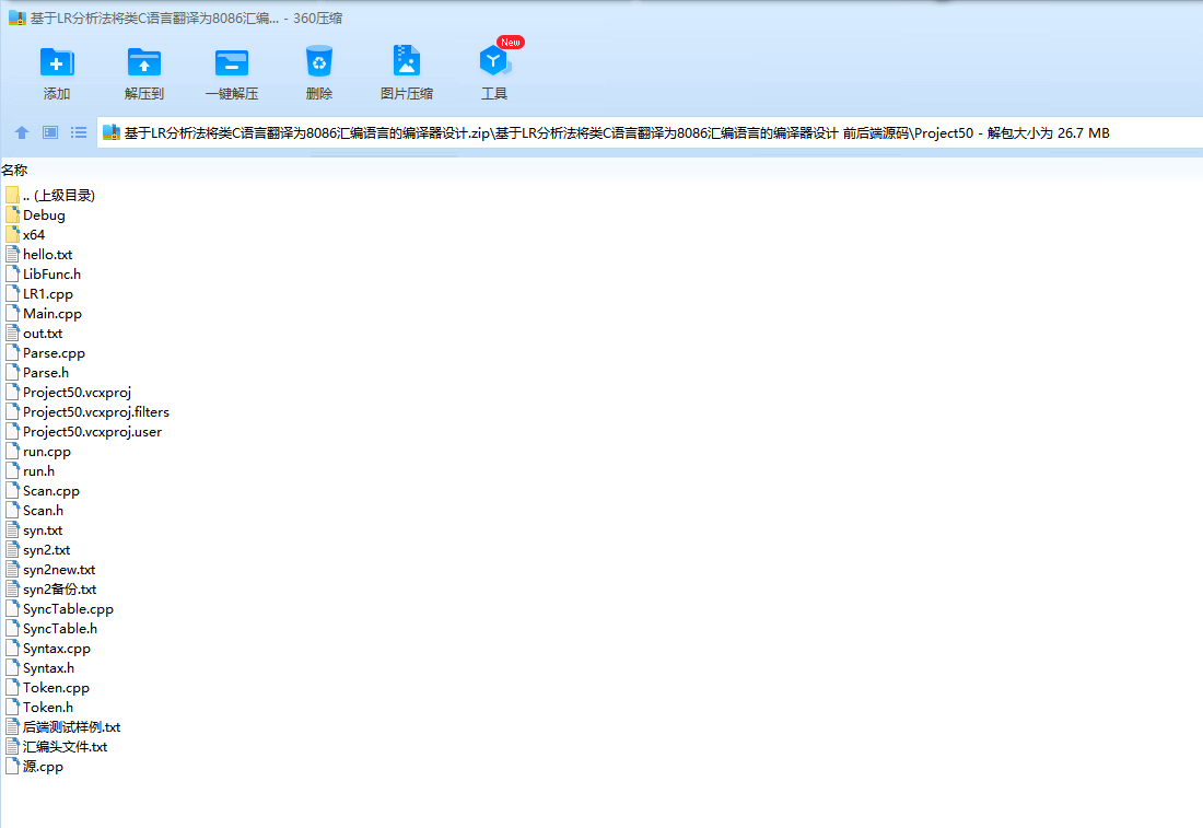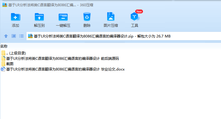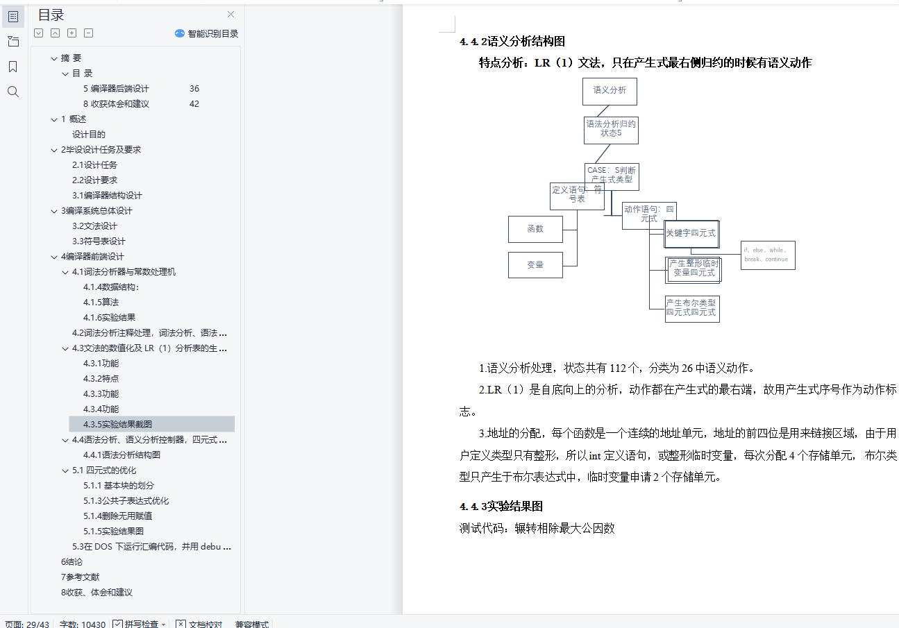 摘 要本次毕设,我们组采用 LR(1)分析法,经过完整的五大编译步骤,将类 C 语言翻译为8086 汇编语言,并在 DOS 环境下运行,并调用 debug-t-g-d 查看程序运行后内存值,验证编译过程是否正确。文法支持整数类型及判断语句中产生的布尔类型,函数的定义与调用,if、else 分支语句,while 循环语句等功能,并允许各模块之间相互嵌套使用。本组毕设最主要的特点是 LR(1)分析以及采用机械构表方法,即给定文法后由函数自动生成转移表,既避免了人工推导分析表的复杂性,又保证了文法的可扩充性。此外,本组毕设在每个编译步骤中都有一定广度扩展:语法语义分析中共有 77 条文法产生式、112 个状态语法状态、26 个语义动作;词法语法语义分析报错系统精确到行的具体位置;包含 3 种情况的中间代码优化;目标代码运行验证等等。关键词:LR(1),机械构表,函数,优化,目标代码运行验证……目 录摘要 41 概述 62 毕设设计任务及要求 72.1 设计目的 72.2 设计任务 72.3 设计要求 73 编译系统总体设计 83.1 编译器结构设计 83.2 文法设计 83.3 符号表设计 134 编译器前端设计 144.1 词法分析器与常数处理机 144.2 词法分析注释处理,词法分析、语法语义分析报错 184.3 文法的数值化及 LR(1)分析表的生成 224.4 语法分析,语义分析控制器,四元式与符号表生成 315 编译器后端设计 365.1 四 元 式 的 优 化 365.2 目 标 代 码 具 体 实 现 365.3 在 DOS 下运行汇编代码,并用 debug 验证正确性 386 结论 417 参考文献 418 收获体会和建议 42