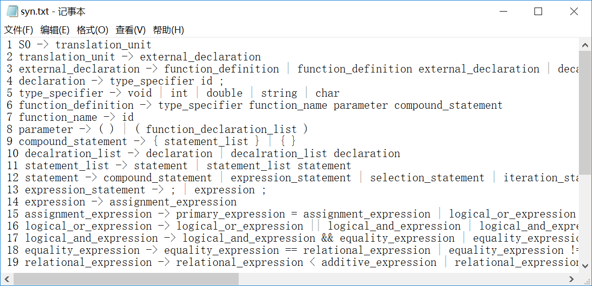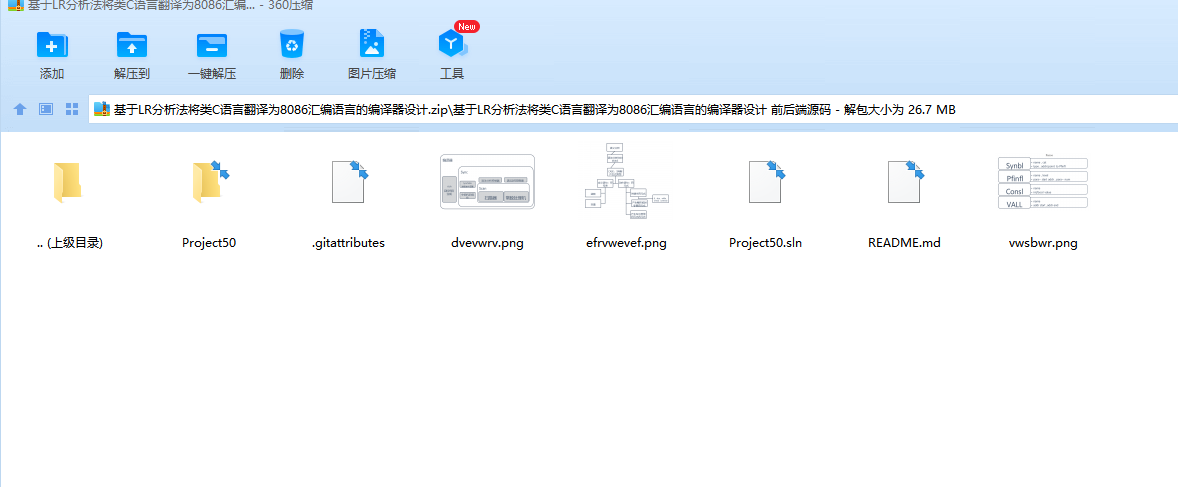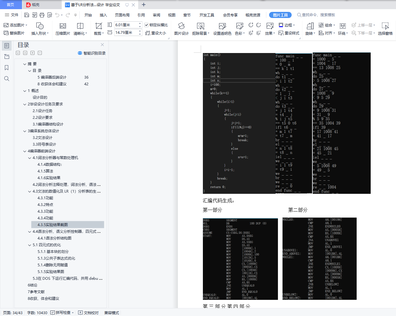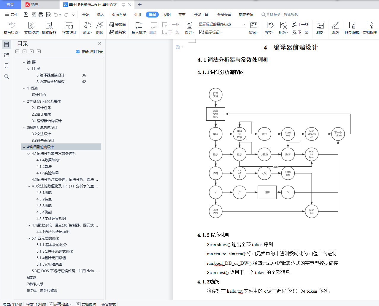 摘 要本次毕设,我们组采用 LR(1)分析法,经过完整的五大编译步骤,将类 C 语言翻译为8086 汇编语言,并在 DOS 环境下运行,并调用 debug-t-g-d 查看程序运行后内存值,验证编译过程是否正确。文法支持整数类型及判断语句中产生的布尔类型,函数的定义与调用,if、else 分支语句,while 循环语句等功能,并允许各模块之间相互嵌套使用。本组毕设最主要的特点是 LR(1)分析以及采用机械构表方法,即给定文法后由函数自动生成转移表,既避免了人工推导分析表的复杂性,又保证了文法的可扩充性。此外,本组毕设在每个编译步骤中都有一定广度扩展:语法语义分析中共有 77 条文法产生式、112 个状态语法状态、26 个语义动作;词法语法语义分析报错系统精确到行的具体位置;包含 3 种情况的中间代码优化;目标代码运行验证等等。关键词:LR(1),机械构表,函数,优化,目标代码运行验证……目 录摘要 41 概述 62 毕设设计任务及要求 72.1 设计目的 72.2 设计任务 72.3 设计要求 73 编译系统总体设计 83.1 编译器结构设计 83.2 文法设计 83.3 符号表设计 134 编译器前端设计 144.1 词法分析器与常数处理机 144.2 词法分析注释处理,词法分析、语法语义分析报错 184.3 文法的数值化及 LR(1)分析表的生成 224.4 语法分析,语义分析控制器,四元式与符号表生成 315 编译器后端设计 365.1 四 元 式 的 优 化 365.2 目 标 代 码 具 体 实 现 365.3 在 DOS 下运行汇编代码,并用 debug 验证正确性 386 结论 417 参考文献 418 收获体会和建议 42