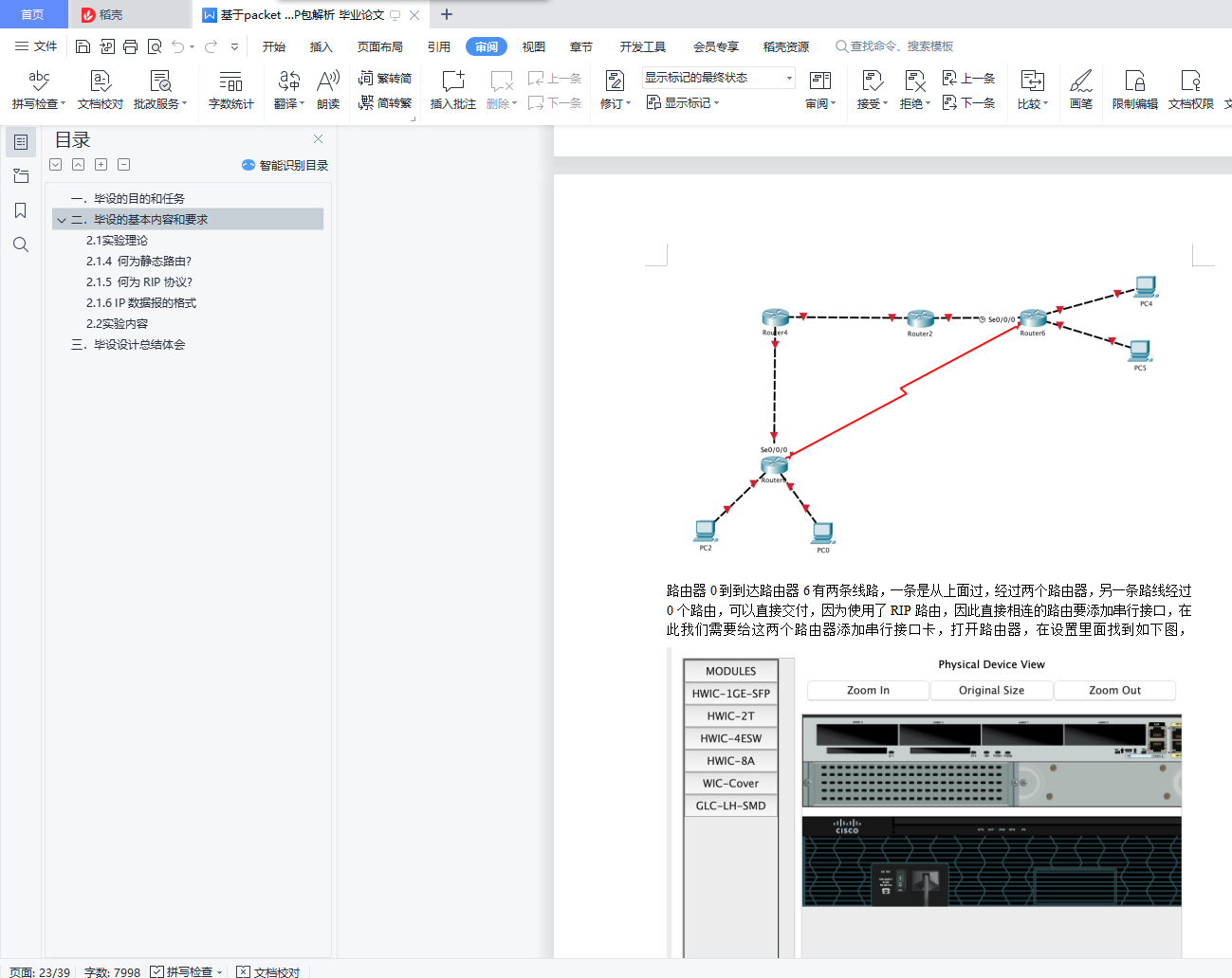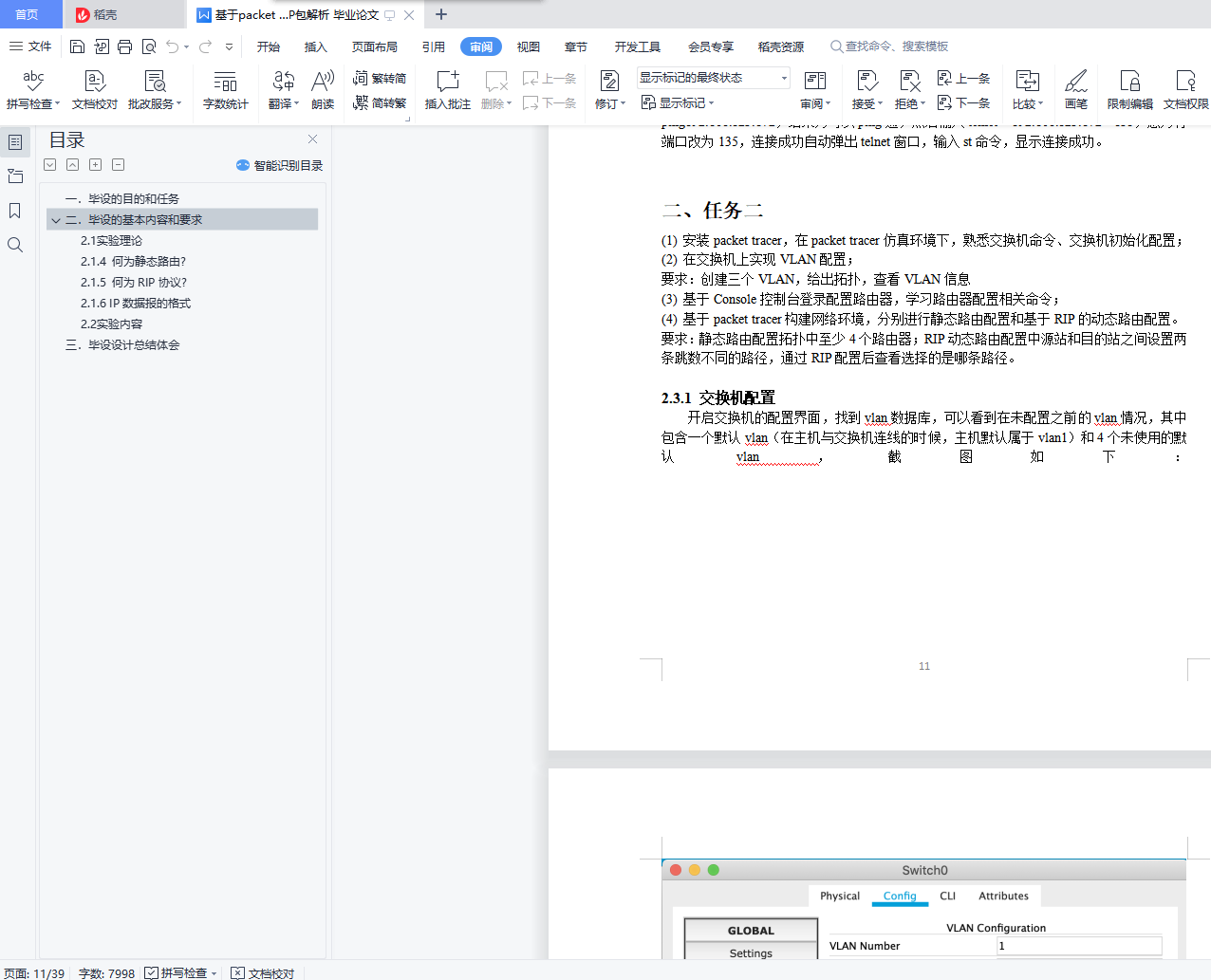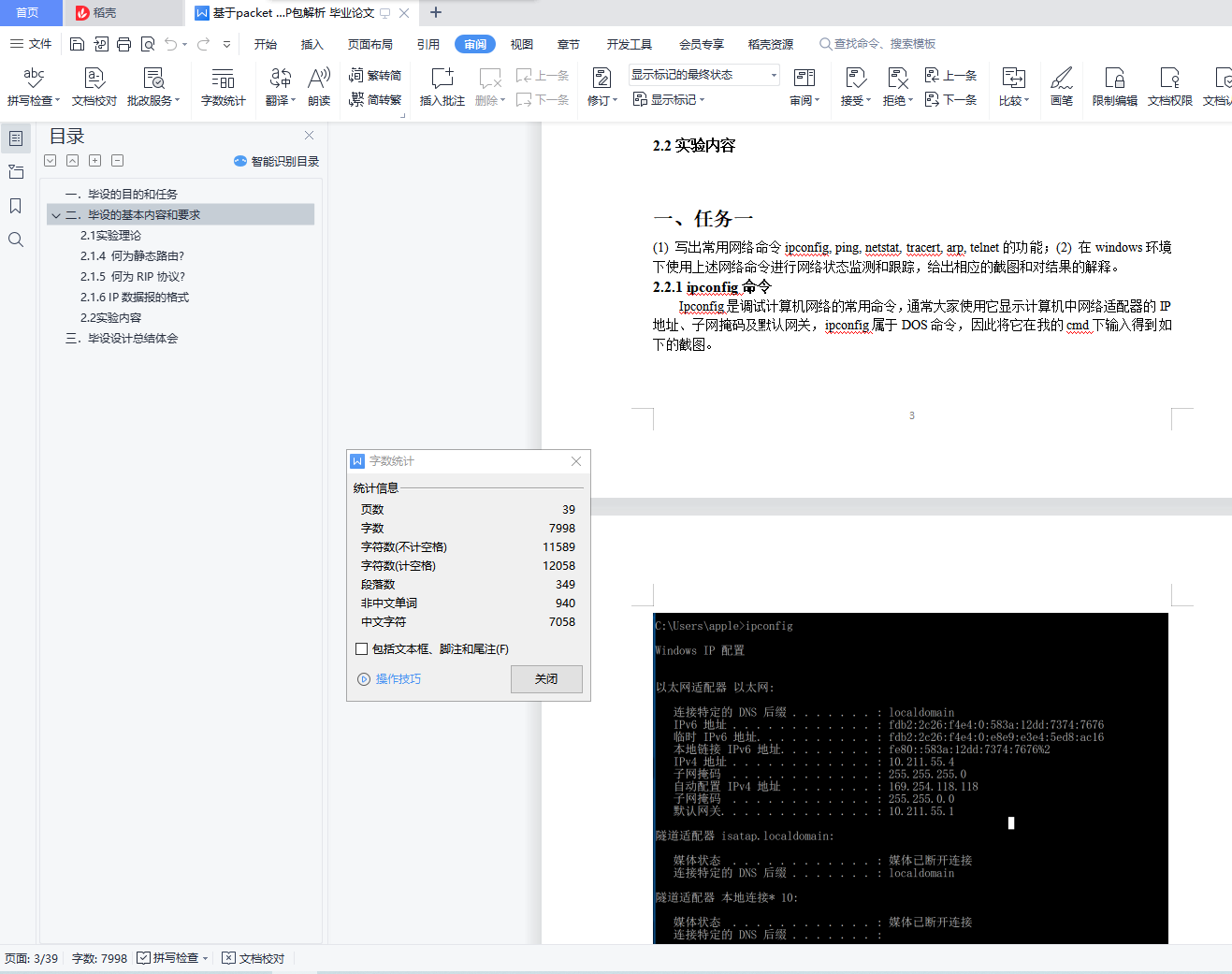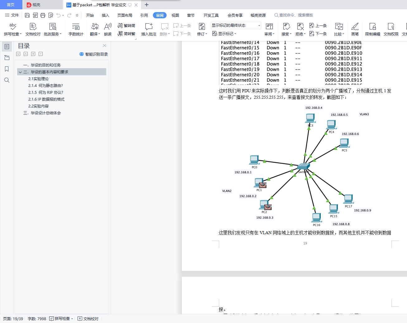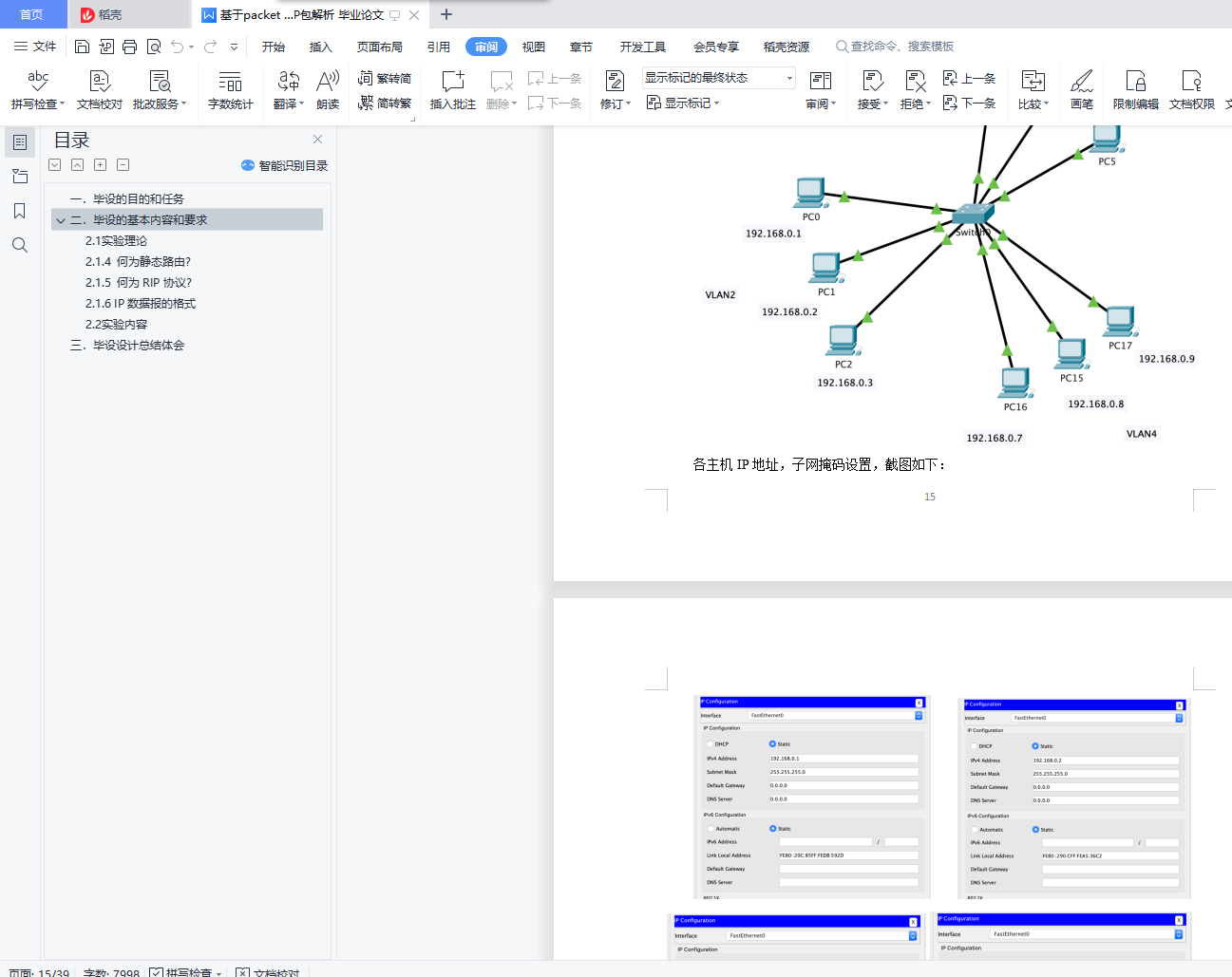 目录一. 毕设的目的和任务 4二. 毕设的基本内容和要求 42.1 实验理论 42.1.1 何为vlan? 42.1.2 何为交换机? 42.1.3 何为路由器? 42.1.4 何为静态路由? 52.1.5 何为RIP协议? 52.1.6 IP数据报的格式 52.2 实验内容 5一、任务一 52.2.1 ipconfig命令 52.2.2 ping 命令 72.2.3 netstat命令 92.2.4 tracert命令 102.2.5 arp命令 112.2.6 telnet命令 12二、任务二 132.3.1 交换机配置 132.3.2 路由器配置 152.3.3 vlan配置 172.3.4 静态路由配置 212.3.5 RIP动态路由配置 25三、任务三 332.4.1给出IP包头的各个字段信息 332.4.2说明自己使用的实验软件及操作系统 352.4.3 程序的设计思想 352.4.4 程序流程图 352.4.5 程序注释 372.4.6 实验结果与分析 402.4.7 实验总结与心得体会 40三. 毕设设计总结体会 40一.毕设的目的和任务本毕设要求学生在“计算机网络原理”理论学习基础上,验证和加深对计算机网络概念的理解。通过本毕设的实践,培养学生独立思考、综合分析和动手实践的能力。通过本毕设的学习,达到如下目标:(1). 理解计算机网络体系结构和工作原理,掌握常用的网络命令,能够对命令的功能进行解释,分析命令执行结果,得到合理有效结论。(2). 掌握Packet Tracer软件的操作方法,能够使用该软件模拟组网、配置交换机、路由器,能够按照实验方案实施仿真实验,采集和整理数据。(3). 具备网络编程能力,能够设计抓包程序获取数据包,结合相关协议对数据包各个字段的含义进行分析、处理和解释,获取有效结论。