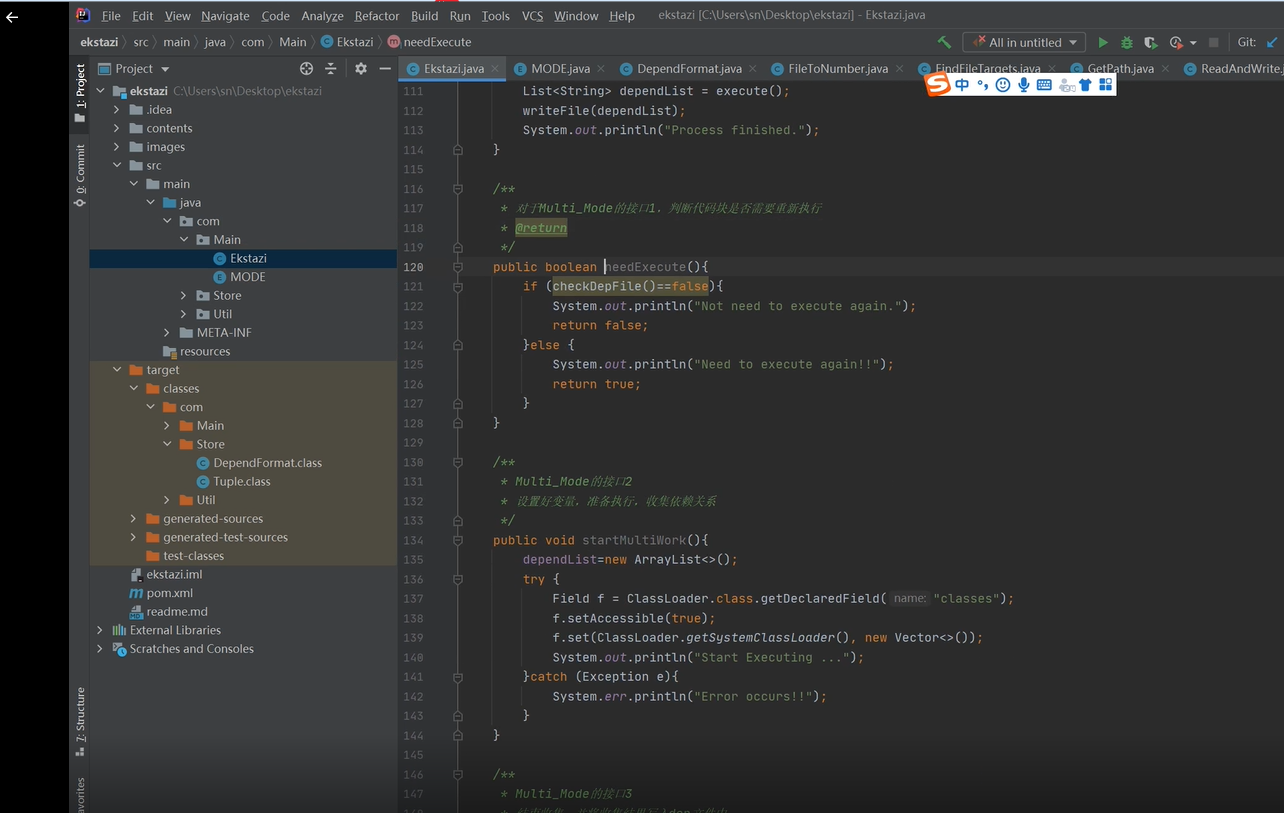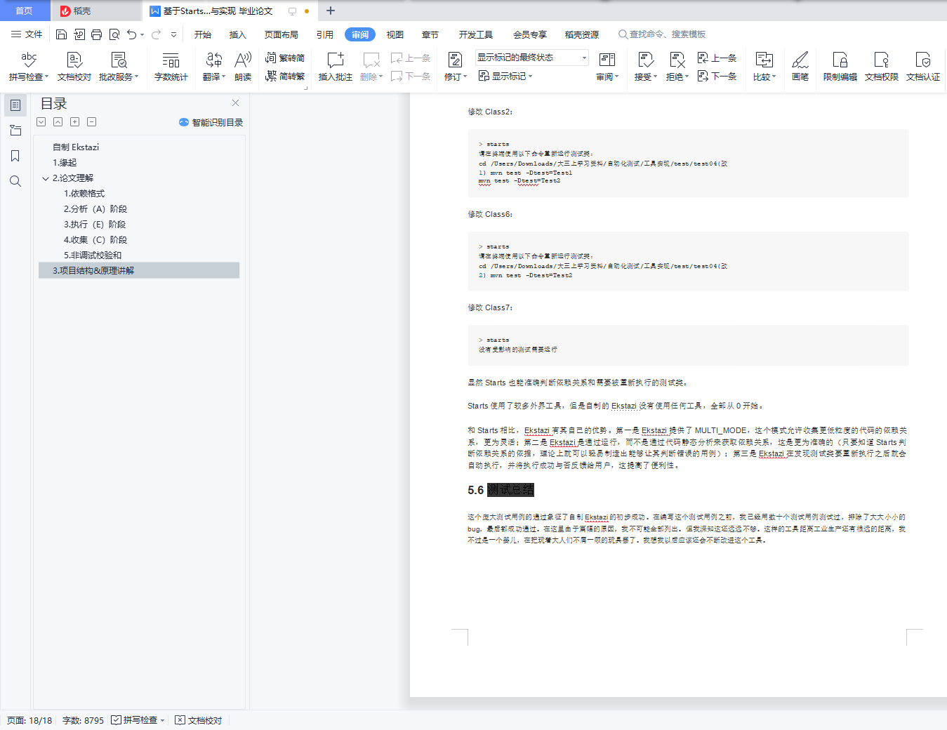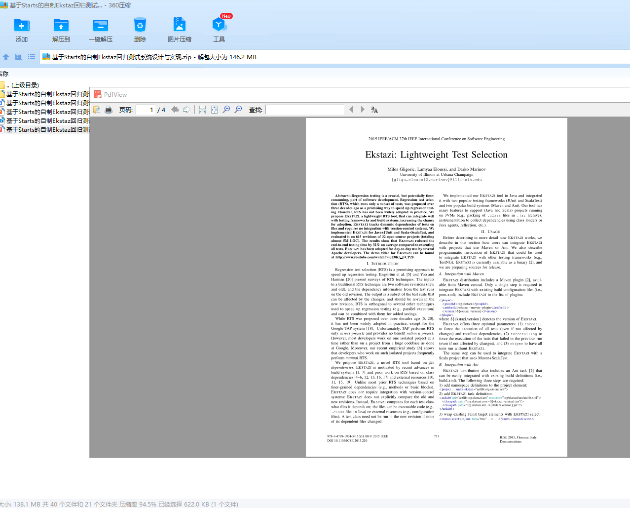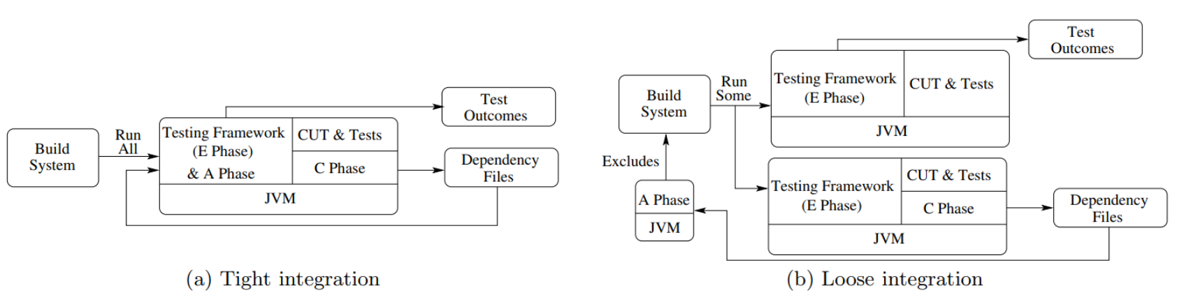目录自制Ekstazi 11. 缘起 12. 论文理解 11. 依赖格式 22. 分析(A)阶段 23. 执行(E)阶段 34. 收集(C)阶段 35. 非调试校验和 33. 项目结构&原理讲解 3自制Ekstazi1.缘起在自动化测试这门课程中,我学习到了有关源码级测试、移动端测试、智能软件测试的知识,并且对源码级测试产生了浓厚的兴趣。我们知道,回归测试是当今自动化测试研究的热门重点之一,项目中平均80%的测试成本都用在了回归测试中。而自动化回归测试技术包含了测试用例优先级技术、测试用例选择技术等。而在其中,测试用例选择技术又涵盖了静态测试用例选择和动态测试用例选择,其中静态是仅仅通过根据代码的分析来判断类之间的依赖关系,而动态则是通过运行来获得类之间的依赖关系。经过研究发现,动态在总体上是要优于静态的,因为它可以更精准地获得依赖关系,而静态可能会分析过头,反而导致效率降低。但是在运行测试阶段,静态是优于动态的,因为静态不用像动态那样反复插桩,效率较高。除此以外,在细粒度和粗粒度的选择上,Java测试粒度选择偏向于类级别的。在工具复现大作业中,我选择了复现一种几年前研究人员提出的动态自动化测试用例选择技术Ekstazi,并且尝试加入了自己的理解。凑巧的是,我的一位舍友选择了静态自动化测试用例选择技术Starts,这样我们就可以对彼此复现的工具进行相互的评估,比较静态和动态的差别。具体资料(.jar文件、论文、PPT、录屏等)都在content文件夹中。2.论文理解我阅读了Ekstazi: Lightweight Test Selection 这篇介绍了Ekstazi的论文,对其产生了较为深刻的理解。以下为我通过论文对Ekstazi的一些简单的理解。Ekstazi是一种轻量级的回归测试选择工具,它可以很好地与测试框架和构建系统集成。Ekstazi跟踪文件上测试的动态依赖关系,并且不需要与版本控制系统集成。Ekstazi是基于构建系统的最新进展,以及之前类依赖性和外部资源来工作的。与以往大多数基于更细粒度依赖关系(例如,方法或基本块)的测试用例选择技术不同,Ekstazi不需要与版本控制系统集成,它没有明确地比较旧版本和新版本;相反,它为每个测试类计算其所依赖的文件,这些文件可以是可执行代码(例如,Java中的.class文件)或外部资源(例如,配置文件)。如果测试类的相关文件没有任何更改,则不需要在新版本中运行这个测试类。Ekstazi有三种方式可以调用,一种的通过maven集成,一种是通过ant集成,最后一种是通过程序调用来使用。程序调用的三个接口如下:org.ekstazi.Ekstazi.inst().checkIfAffected("name")org.ekstazi.Ekstazi.inst().startCollectingDependencies("name")org.ekstazi.Ekstazi.inst().finishCollectingDependencies("name")接下来简单解析一下Ekstazi的工作原理。典型的测试用例选择技术有三个阶段:分析(A)阶段选择在当前版本中运行哪些测试用例,执行(E)阶段运行所选测试,收集(C)阶段为下一个版本收集信息。而Ekstazi在文件的级别上收集依赖关系。接下来首先介绍Ekstazi存储依赖项的格式。其次提供关于每个阶段的更多细节及其与测试框架的集成。最后描述Ekstazi中一个重要的优化方法。1.依赖格式Ekstazi以一种简单的格式存储依赖关系,这种格式类似于Fabricate构建工具的依赖关系格式。对于每个测试类,Ekstazi存储该类在执行期间使用的文件的名称和校验和。校验和是散列出的文件的内容。这些校验和能让Ekstazi在不去检查旧版本的情况下也能发现文件修改。Ekstazi将所有信息存储在每个测试类的单独依赖项文件中。2.分析(A)阶段Ekstazi的分析阶段非常简单,因此速度也很快。对于每个测试类,Ekstazi将检查所有依赖文件的校验和是否仍然相同。如果是这样,则不选择运行这个测试类。这种检查不需要对旧版本和新版本进行复杂的比较。事实上,它甚至不需要分析旧版本(就像构建系统只要知道哪些源文件更改就可以增量编译代码一样)。Ekstazi自然地处理新添加的测试类:如果某些类没有依赖项信息,它将被选中运行。最初,在Ekstazi的第一次运行时,没有任何类的依赖信息,所以它们都被选中运行了。3.执行(E)阶段Ekstazi首先决定不运行哪些测试类。这就避免了准备运行一个类并发现它不应该运行而导致的不必要的开销(例如,加载类或生成一个新的JVM)。A阶段将排除不应该运行的测试类的列表,并且构建系统在执行测试之前忽略它们。有两种可能的方法可以集成E阶段和C阶段。第一个也是最简单的方法是一次性完成回归测试。显然,未选择中的测试类的依赖项无法更改。但是,需要运行所选的测试类,并确定它们是否仍然通过或失败,然后通知启动测试会话的用户。又因为这些类的依赖关系发生了变化,所以更新它们的依赖关系文件的是最简单的方法。但是,收集依赖关系会有一个开销。因此,一些设置可能允许使用两种模式:一种是不收集依赖项,只是为了确定测试结果并尽快通知用户;另一种是为了收集依赖项,但是效率可能会差一些。4.收集(C)阶段收集阶段将为已执行的测试类创建依赖项文件。Ekstazi监视测试和被测试代码的执行情况,以收集在每个类的执行期间访问的文件集,计算这些文件的校验和,并将它们存储在相应的依赖文件中。为了精确地收集已访问的文件,Ekstazi动态地分析字节码并监视执行,以收集显式访问的文件和隐式访问的文件。在执行过程中,Ekstazi会持续收集类加载器中加载过的类,这些类将有可能写入测试类的