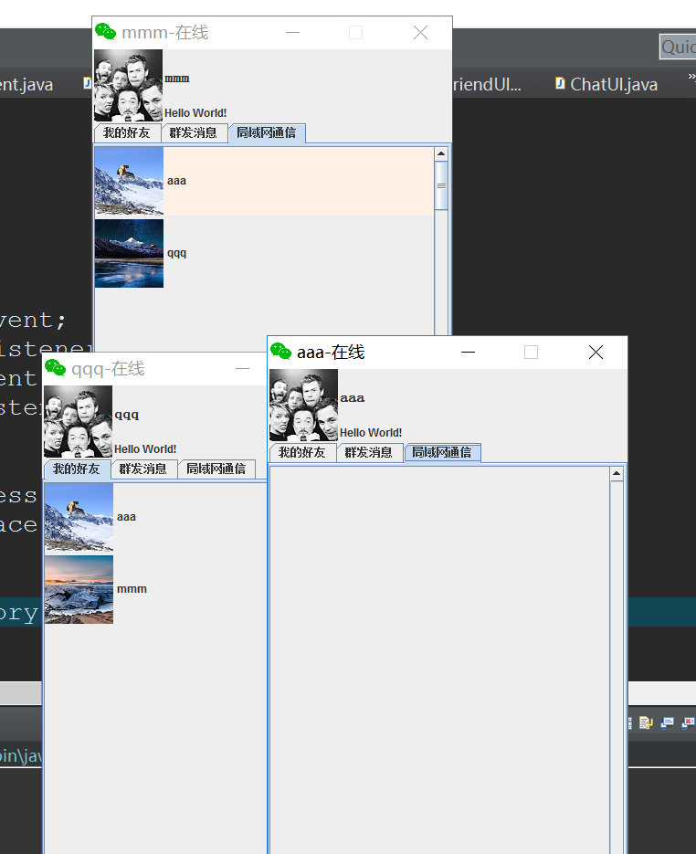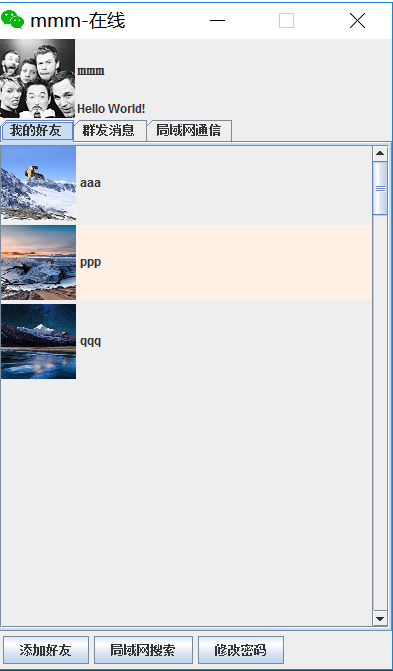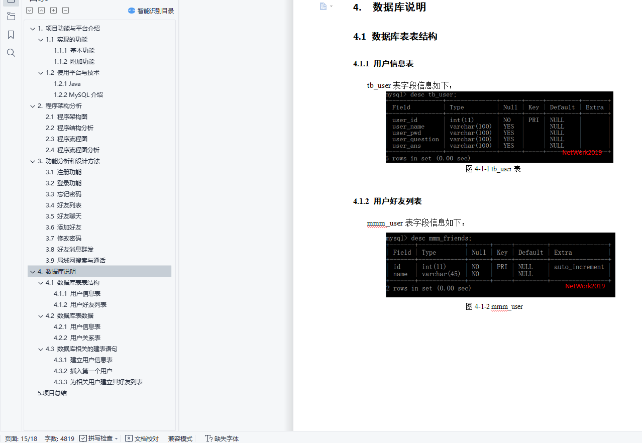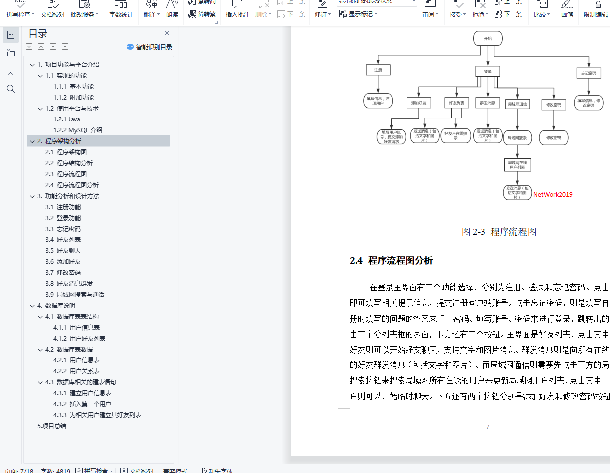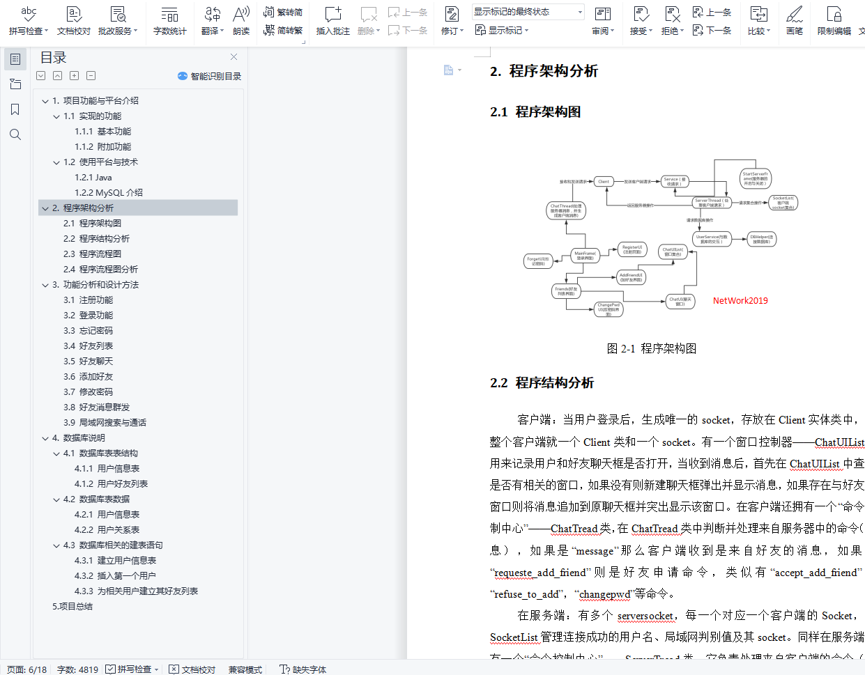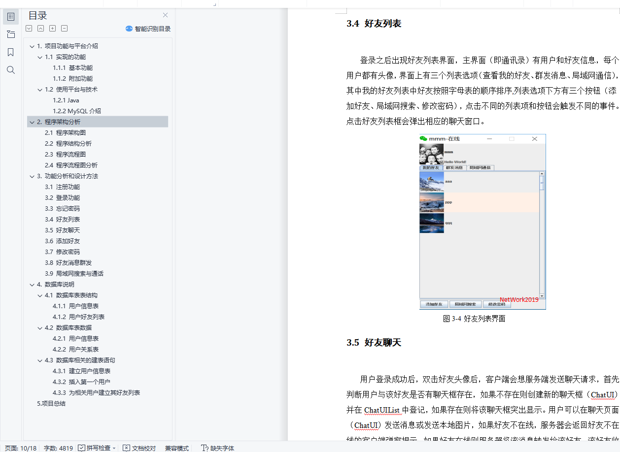 摘 要本系统是基于java8开发的简易微信。有用户注册、用户登陆、修改密码、忘记密码、添加好友、用户聊天(包括发送文字和图片)、显示好友列表、群发消息以及局域网客户端通信功能。本项目是在java环境下,使用eclipse工具实现的基于Socket编程和mysql数据库的即时通信工具,并且在局域网内均有通信功能,但通信的内容只局限于文字和本地图片的发送。如果服务器还没有启动,则客户端的操作是不会有任何响应的,如果在运行过程中,服务器断开则系统会有提示,聊天对象如果下线发送消息后会有弹窗提示。本项目可以解决部分局域网通信的需求,但限于时间的关系并没有添加过多功能。关键词:Socket编程、mysql数据库、Java、局域网目 录1. 项目功能与平台介绍 31.1 实现的功能 31.1.1 基本功能 31.1.2 附加功能 41.2 使用平台与技术 41.2.1 Java 41.2.2 MySQL介绍 52. 程序架构分析 62.1 程序架构图 62.2 程序结构分析 62.3 程序流程图 72.4 程序流程图分析 73. 功能分析和设计方法 83.1 注册功能 83.2 登录功能 83.3 忘记密码 93.4 好友列表 103.5 好友聊天 103.6 添加好友 113.7 修改密码 123.8 好友消息群发 123.9 局域网搜索与通话 134. 数据库说明 154.1 数据库表表结构 154.1.1 用户信息表 154.1.2 用户好友列表 154.2 数据库表数据 164.2.1 用户信息表 164.2.2 用户关系表 164.3 数据库相关的建表语句 164.3.1 建立用户信息表 164.3.2 插入第一个用户 174.3.3 为相关用户建立其好友列表 175. 项目总结 18