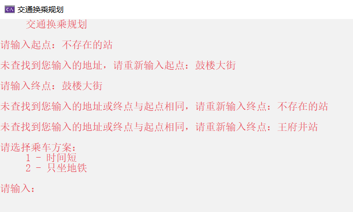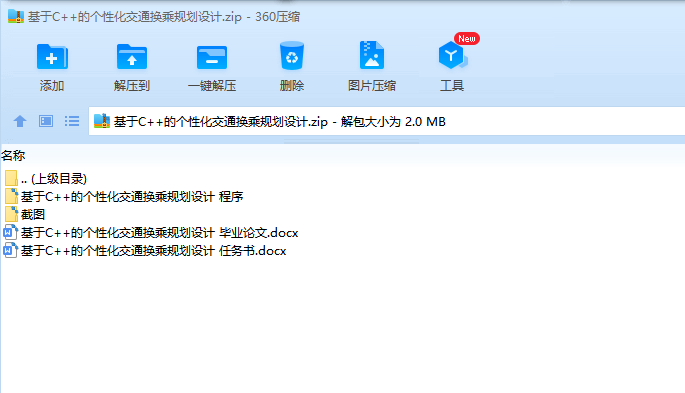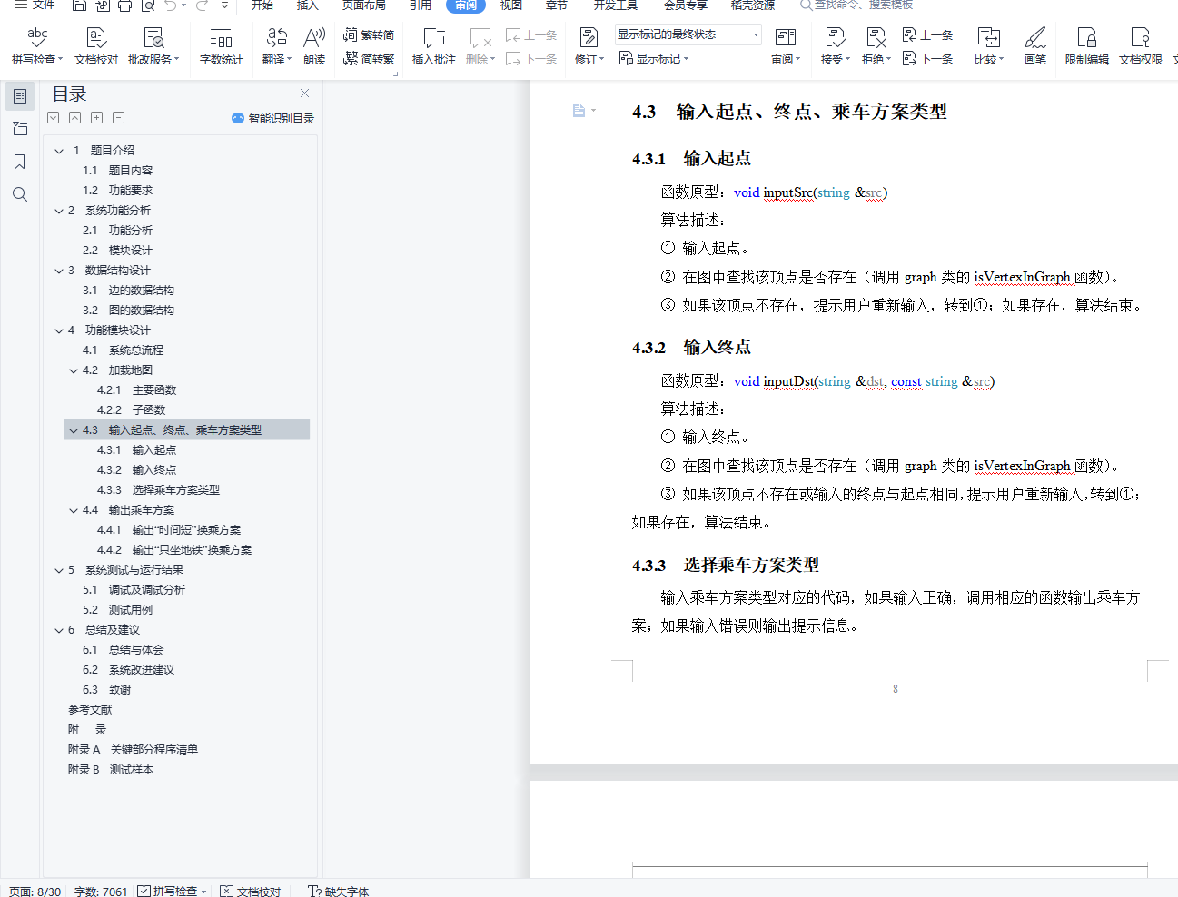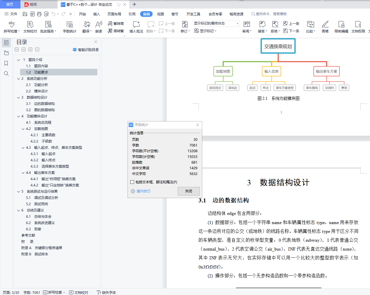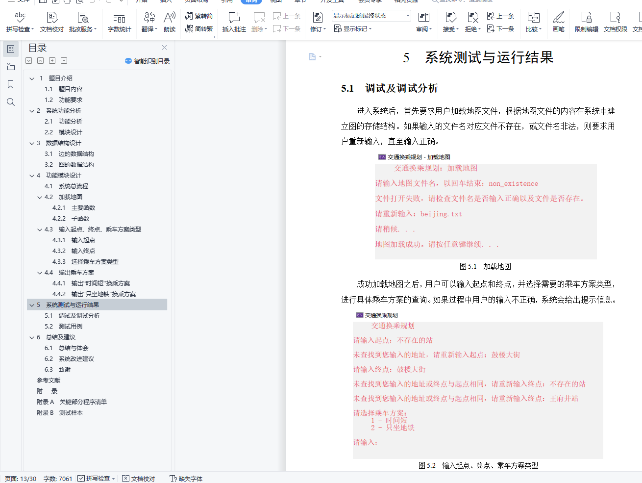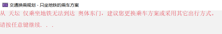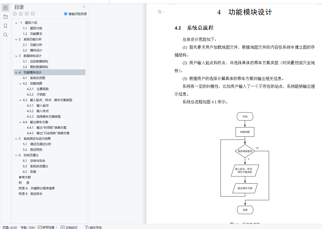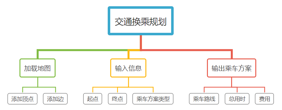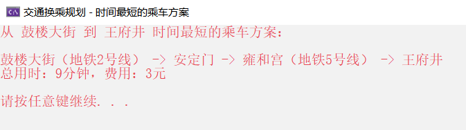目录1 题目介绍 21.1 题目内容 21.2 功能要求 22 系统功能分析 32.1 功能分析 32.2 模块设计 33 数据结构设计 43.1 边的数据结构 43.2 图的数据结构 44 功能模块设计 64.1 系统总流程 64.2 加载地图 74.2.1 主要函数 74.2.2 子函数 74.3 输入起点、终点、乘车方案类型 84.3.1 输入起点 84.3.2 输入终点 84.3.3 选择乘车方案类型 84.4 输出乘车方案 94.4.1 输出“时间短”换乘方案 94.4.2 输出“只坐地铁”换乘方案 115 系统测试与运行结果 135.1 调试及调试分析 135.2 测试用例 146 总结及建议 176.1 总结与体会 176.2 系统改进建议 176.3 致谢 17参考文献 19附 录 20附录A 关键部分程序清单 20附录B 测试样本 291 题目介绍1.1 题目内容某城市的公共交通由地铁和公交车组成,其中公交车分为空调车(每次2元钱)和普通车(每次1元)两种,地铁票价计算方式为0~7站3元,7~14站5元,大于14站8元,请设计程序规划一个交通工具换乘方案。1.2 功能要求(1) 设计合适的数据结构存储站点信息和连接关系信息;(2) 交通图至少应有20个结点代表各站点信息;(3) 能够保留各站点之间的交通方式以及预计通行时间;(4) 设计不止一种个性化的换乘方案,如时间最短、换乘次数最少、花费最小等。