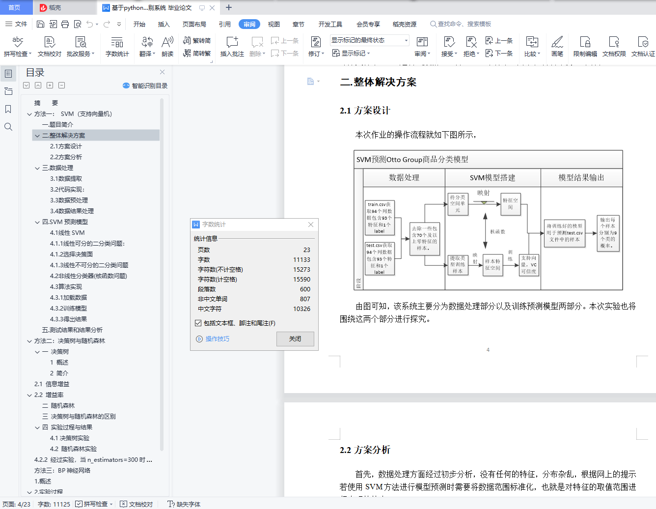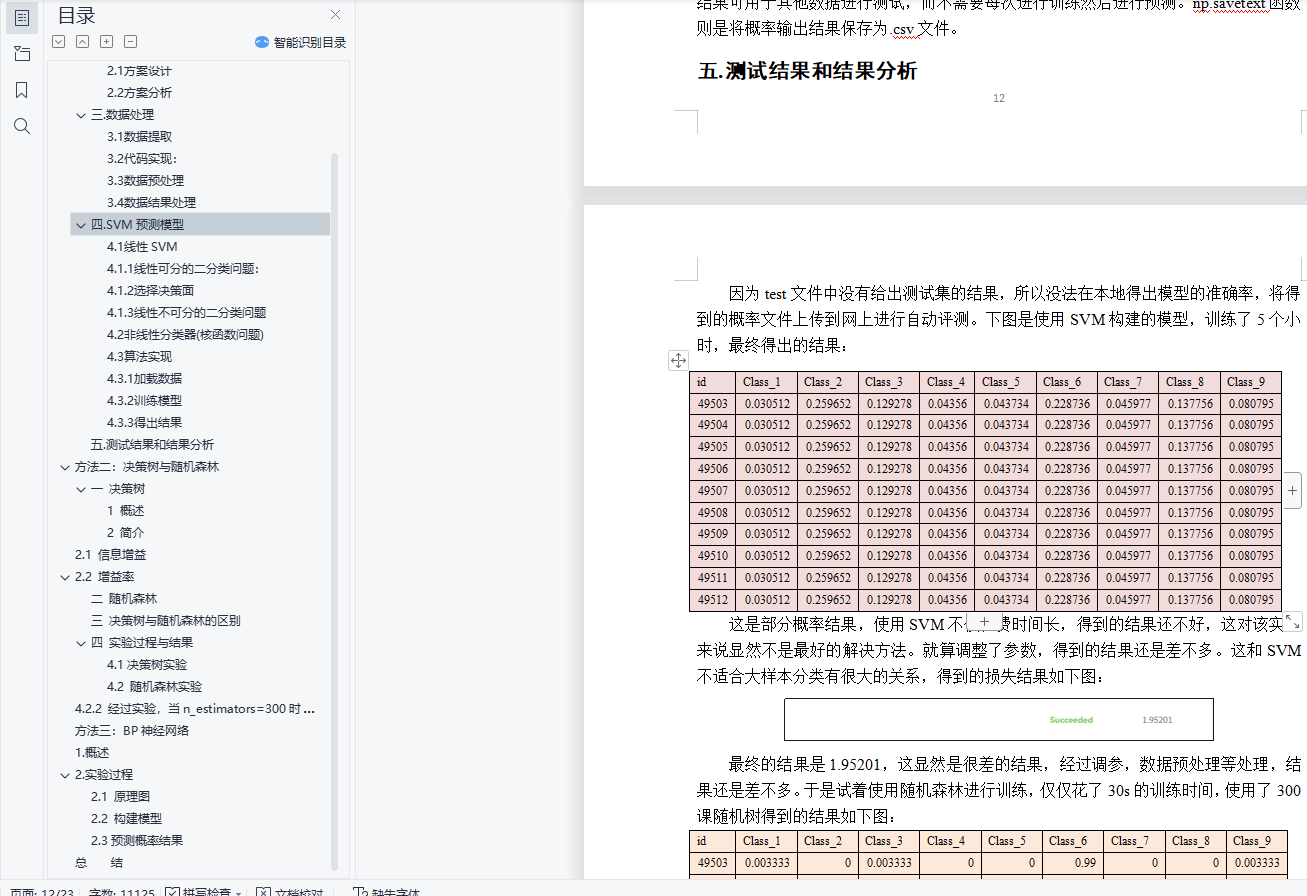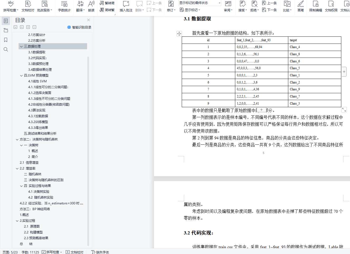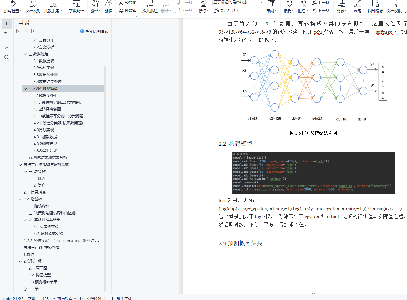 摘 要Otto Group是世界上最大的电子商务公司之一,在全世界范围内,它每天会卖出数百万件商品。每件商品所属的类别分别是Class_1~ Class_9。对于这家公司的来说,货物供给和需求分析是非常重要的信息。现给定一些商品的多个特征,设计一个算法模型判断一个商品所属的类别。SVM(support vector machines)支持向量机是一种二分类模型,它的目的是寻找一个超平面来对样本进行分割,分割的原则是间隔最大化,最终转化为一个凸二次规划问题来求解。由简至繁的模型包括:当训练样本线性可分时,通过硬间隔最大化,学习一个线性可分支持向量机;当训练样本近似线性可分时,通过软间隔最大化,也就是加入松弛变量和惩罚因子已达到允许系统错分的情况,学习一个线性支持向量机;当训练样本线性不可分时,通过核技巧和软间隔最大化,学习一个非线性支持向量机,核函数通常会使用高斯核函数。对支持向量的求解通常比较复杂,所以这里使用求解对偶函数的方法来求解原问题的解。该实验的数据有93个特征,一个类别标签,分为9类,显然是一个多分类问题。根据分析,特征类型是非线性的。按照SVM的解决方法会将数据映射到高维,映射到高维无疑会增加计算的复杂度,而且是指数式增加。回了解决这一问题,如果映射正好是核函数则会改善计算的复杂度。根据核函数的性质,核函数的内积等于内积再做核函数运算。利用这一性质就可以在不增加运算复杂度的情况下对数据进行高维分类。本次数据分类中采用高斯核函数,在该实验中,高斯核函数具有最优的效率。除了svm方法,后面还提供了决策树和神经网络两种方法。关键词: 多分类,SVM,决策树,随机森林,神经网络目录摘 要 1方法一: SVM(支持向量机) 2一. 题目简介 2二. 整体解决方案 32.1 方案设计 32.2 方案分析 3三. 数据处理 43.1 数据提取 43.2 代码实现: 53.3 数据预处理 53.4 数据结果处理 5四. SVM预测模型 64.1 线性SVM 64.1.1 线性可分的二分类问题: 64.1.2 选择决策面 64.1.3 线性不可分的二分类问题 84.2 非线性分类器(核函数问题) 84.3 算法实现 104.3.1 加载数据 104.3.2 训练模型 104.3.3 得出结果 11五. 测试结果和结果分析 12方法二:决策树与随机森林 13一 决策树 131 概述 132 简介 132.1 信息增益 132.2 增益率 14二 随机森林 15三 决策树与随机森林的区别 16四 实验过程与结果 164.1决策树实验 174.2 随机森林实验 184.2.2 经过实验,当n_estimators=300时,效果最好 18方法三:BP神经网络 191.概述 192. 实验过程 202.1 原理图 202.2 构建模型 202.3预测概率结果 20总 结 22