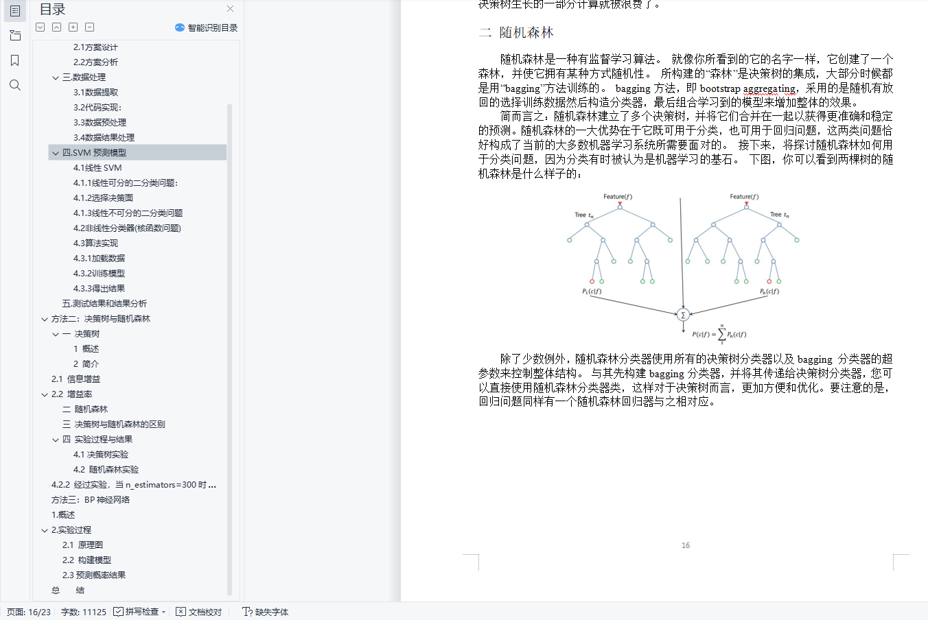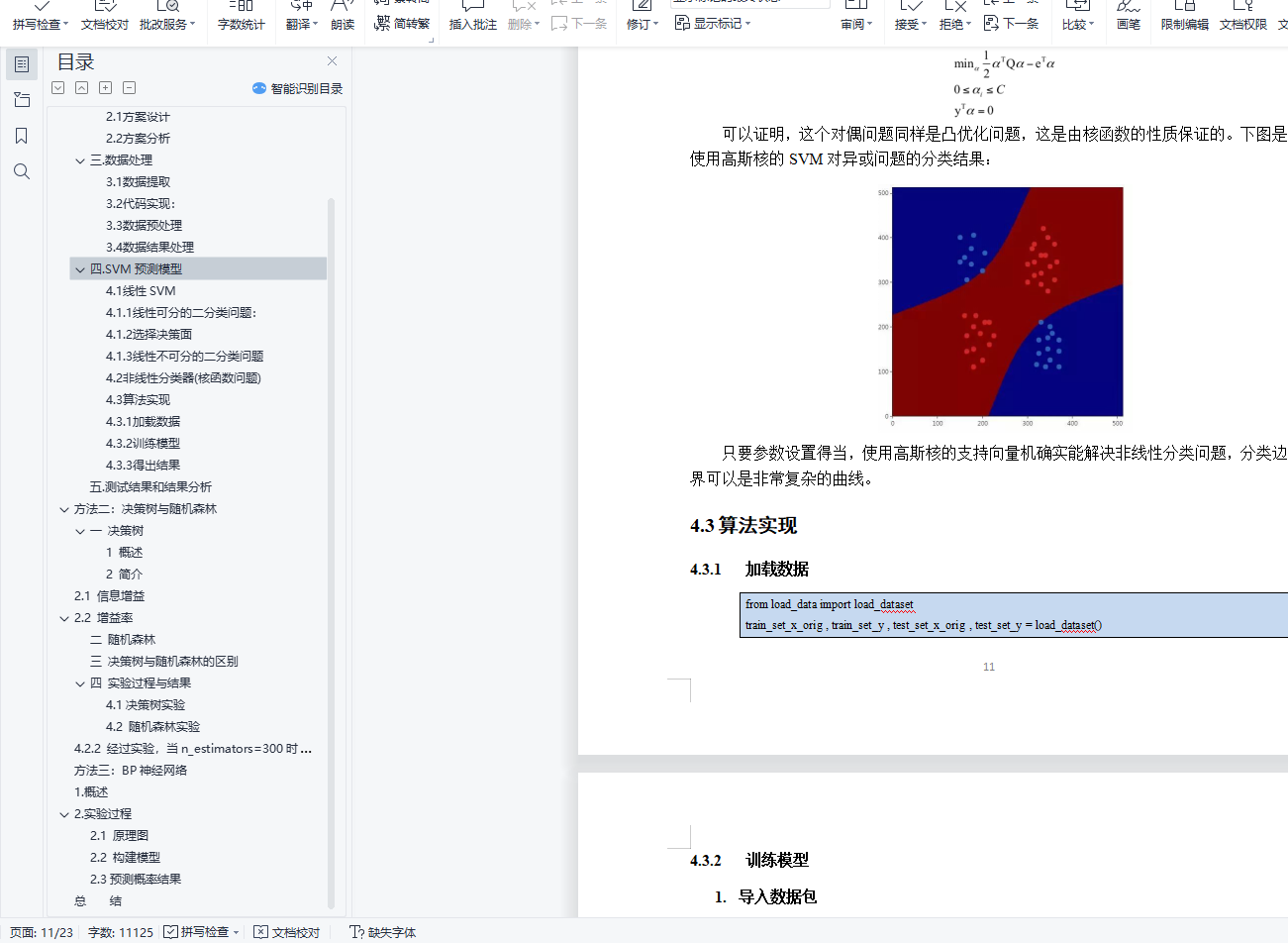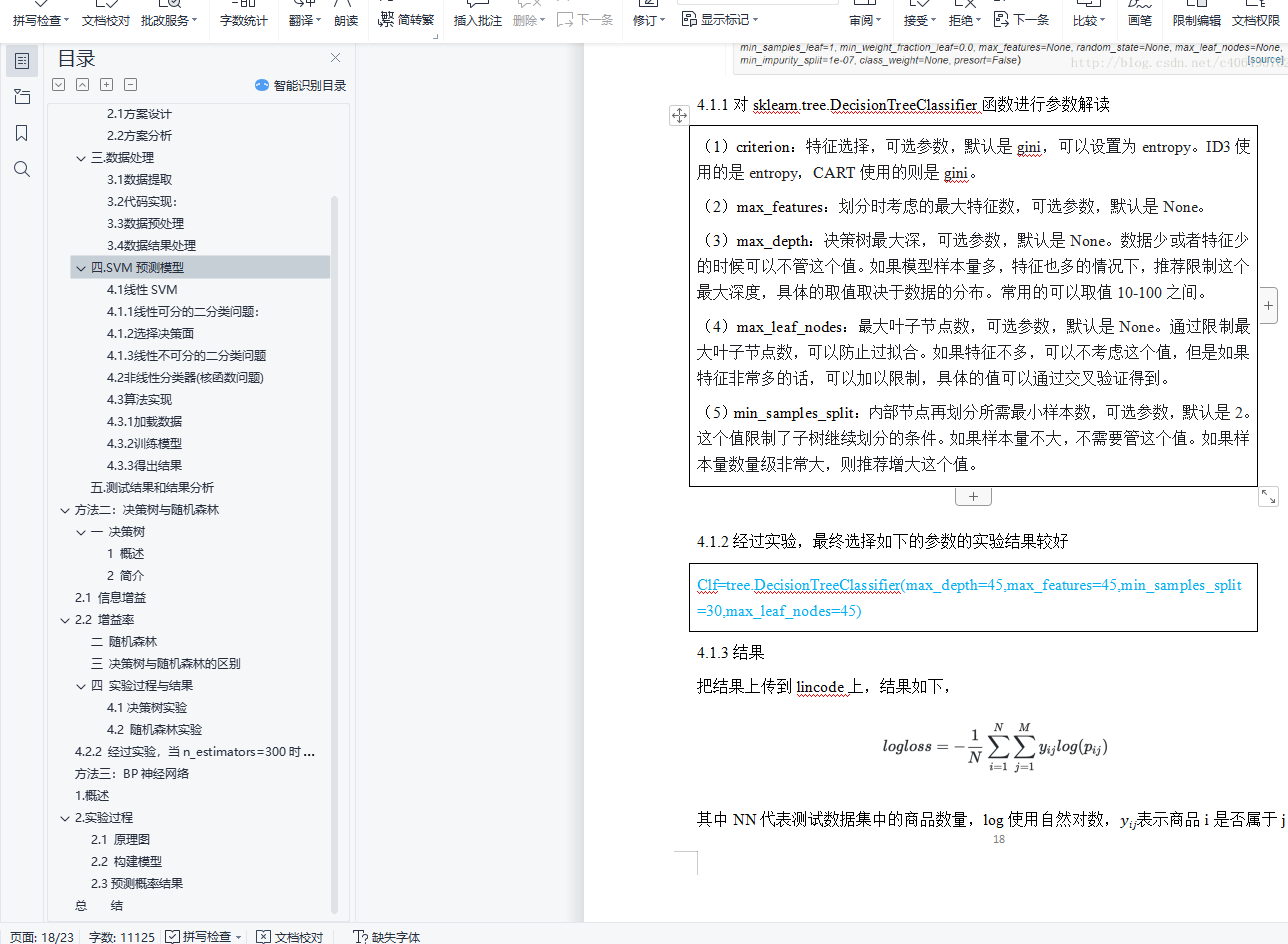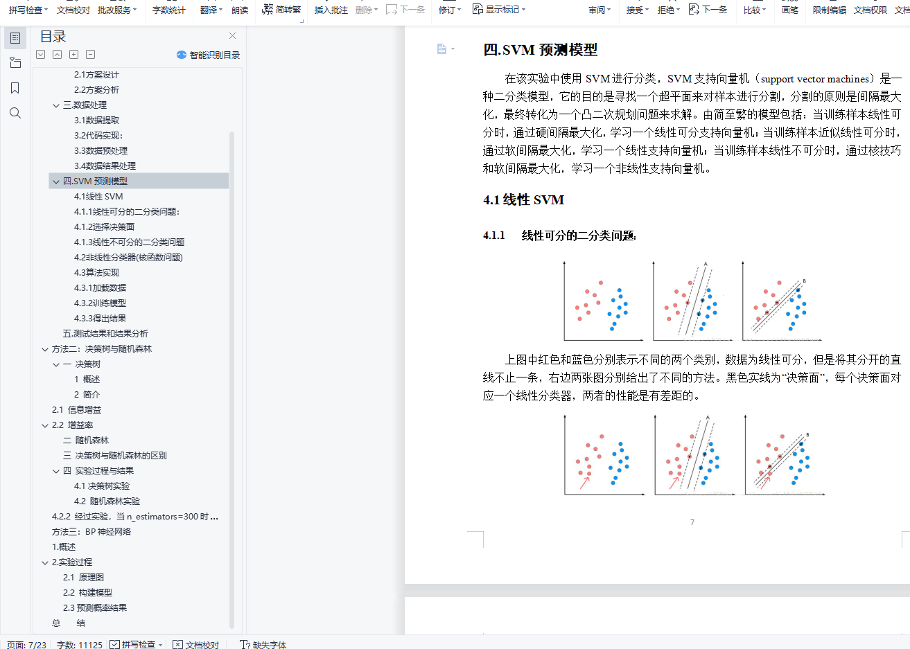 摘 要Otto Group是世界上最大的电子商务公司之一,在全世界范围内,它每天会卖出数百万件商品。每件商品所属的类别分别是Class_1~ Class_9。对于这家公司的来说,货物供给和需求分析是非常重要的信息。现给定一些商品的多个特征,设计一个算法模型判断一个商品所属的类别。SVM(support vector machines)支持向量机是一种二分类模型,它的目的是寻找一个超平面来对样本进行分割,分割的原则是间隔最大化,最终转化为一个凸二次规划问题来求解。由简至繁的模型包括:当训练样本线性可分时,通过硬间隔最大化,学习一个线性可分支持向量机;当训练样本近似线性可分时,通过软间隔最大化,也就是加入松弛变量和惩罚因子已达到允许系统错分的情况,学习一个线性支持向量机;当训练样本线性不可分时,通过核技巧和软间隔最大化,学习一个非线性支持向量机,核函数通常会使用高斯核函数。对支持向量的求解通常比较复杂,所以这里使用求解对偶函数的方法来求解原问题的解。该实验的数据有93个特征,一个类别标签,分为9类,显然是一个多分类问题。根据分析,特征类型是非线性的。按照SVM的解决方法会将数据映射到高维,映射到高维无疑会增加计算的复杂度,而且是指数式增加。回了解决这一问题,如果映射正好是核函数则会改善计算的复杂度。根据核函数的性质,核函数的内积等于内积再做核函数运算。利用这一性质就可以在不增加运算复杂度的情况下对数据进行高维分类。本次数据分类中采用高斯核函数,在该实验中,高斯核函数具有最优的效率。除了svm方法,后面还提供了决策树和神经网络两种方法。关键词: 多分类,SVM,决策树,随机森林,神经网络目录摘 要 1方法一: SVM(支持向量机) 2一. 题目简介 2二. 整体解决方案 32.1 方案设计 32.2 方案分析 3三. 数据处理 43.1 数据提取 43.2 代码实现: 53.3 数据预处理 53.4 数据结果处理 5四. SVM预测模型 64.1 线性SVM 64.1.1 线性可分的二分类问题: 64.1.2 选择决策面 64.1.3 线性不可分的二分类问题 84.2 非线性分类器(核函数问题) 84.3 算法实现 104.3.1 加载数据 104.3.2 训练模型 104.3.3 得出结果 11五. 测试结果和结果分析 12方法二:决策树与随机森林 13一 决策树 131 概述 132 简介 132.1 信息增益 132.2 增益率 14二 随机森林 15三 决策树与随机森林的区别 16四 实验过程与结果 164.1决策树实验 174.2 随机森林实验 184.2.2 经过实验,当n_estimators=300时,效果最好 18方法三:BP神经网络 191.概述 192. 实验过程 202.1 原理图 202.2 构建模型 202.3预测概率结果 20总 结 22