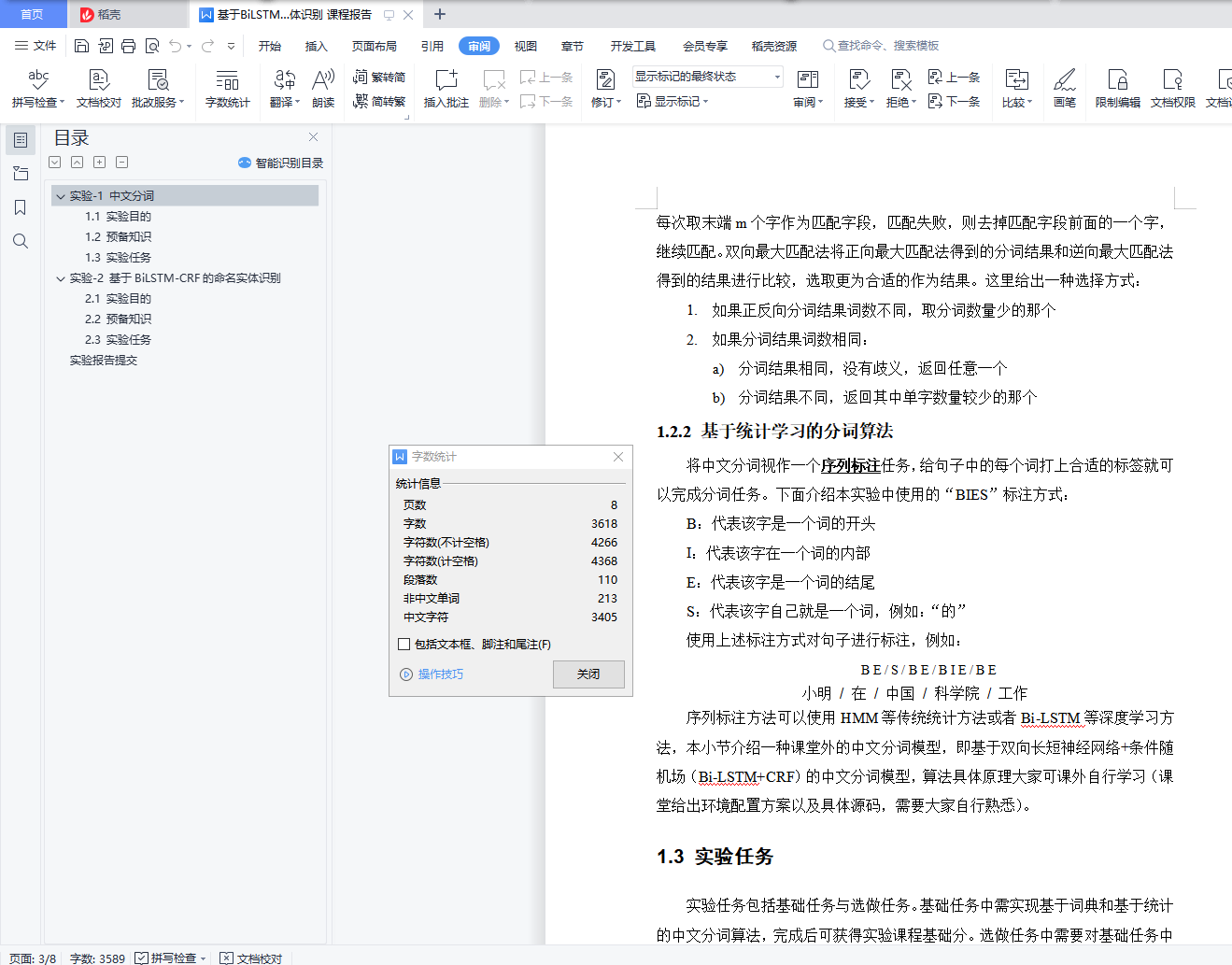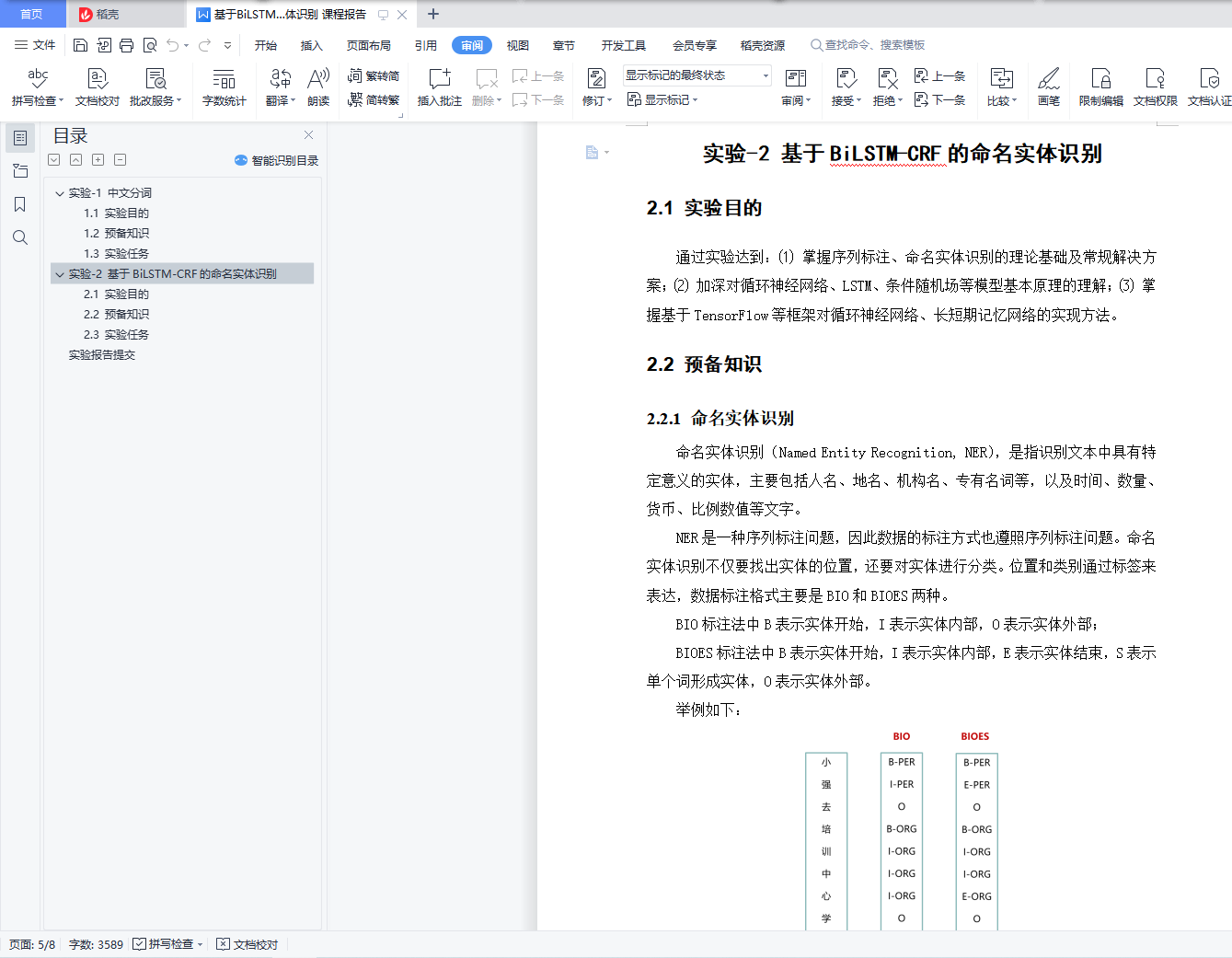 目 录实验-1 中文分词 11.1 实验目的 11.2 预备知识 11.3 实验任务 2实验-2 基于BiLSTM-CRF的命名实体识别 42.1 实验目的 42.2 预备知识 42.3 实验任务 6实验报告提交 7实验-1 中文分词1.1 实验目的通过实验了解中文分词的大致思路。在实验中实现中文分词处理,可考虑使用课堂讲解过的算法(比如基于统计、基于词典的分词方法等),或者课外学习算法(比如Bi-LSTM+CRF模型等)进行分词,最后对比不同算法分词效果和性能,加深对中文分词算法的理解。1.2 预备知识中文分词指将汉字序列切分成单个词语的过程。在以英文为代表的拉丁语系中,单词之间是以空格作为自然分界符的。而中文只有字、句和段能通过明显的分界符来划界,唯独词没有一个形式上的分界符,这给中文的处理带来了独有的困难,因此中文分词技术得到了广泛研究。理论上讲,构建一套完备的分词规则便可以将所有句子正确划分,但语言规则庞大复杂并且是动态发展的,编写这样一套规则是不现实的,因此目前主流的分词方法可以大致分为:(1)基于词典匹配的分词算法;(2)基于统计学习的分词算法;(3)基于深度学习的分词算法等。1.2.1 基于词典匹配的分词算法基于词典匹配的分词算法依赖人工建立的词库(词典)进行,包括正向最大匹配法、逆向最大匹配法以及双向最大匹配法。这里给出正向最大匹配法的大致流程:1.从左向右取句子的前m个字作为匹配字段(m为词典中最长词的长度)2.查找词典进行匹配3.若匹配成功,则将该字段作为一个词切分出去4.若匹配不成功,则将该字段最后一个字去掉,剩下的字作为新匹配字段,再次进行匹配5.重复上述过程,直到切分所有词为止逆向最大匹配法则从待分词句子的末端开始,也就是从右向左开始匹配扫描,每次取末端m个字作为匹配字段,匹配失败,则去掉匹配字段前面的一个字,继续匹配。双向最大匹配法将正向最大匹配法得到的分词结果和逆向最大匹配法得到的结果进行比较,选取更为合适的作为结果。这里给出一种选择方式:1.如果正反向分词结果词数不同,取分词数量少的那个2.如果分词结果词数相同:a)分词结果相同,没有歧义,返回任意一个b)分词结果不同,返回其中单字数量较少的那个
