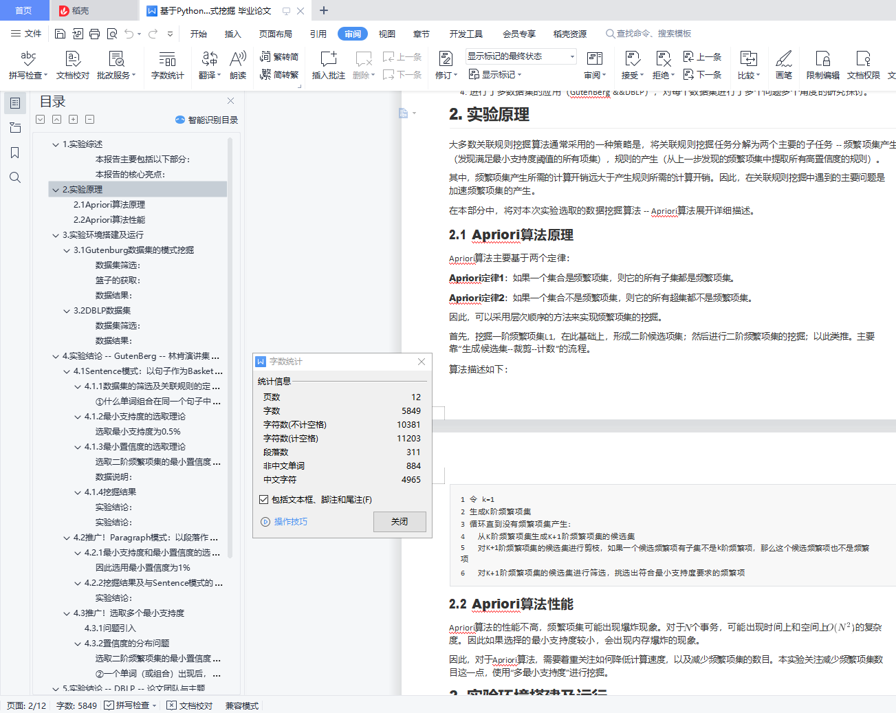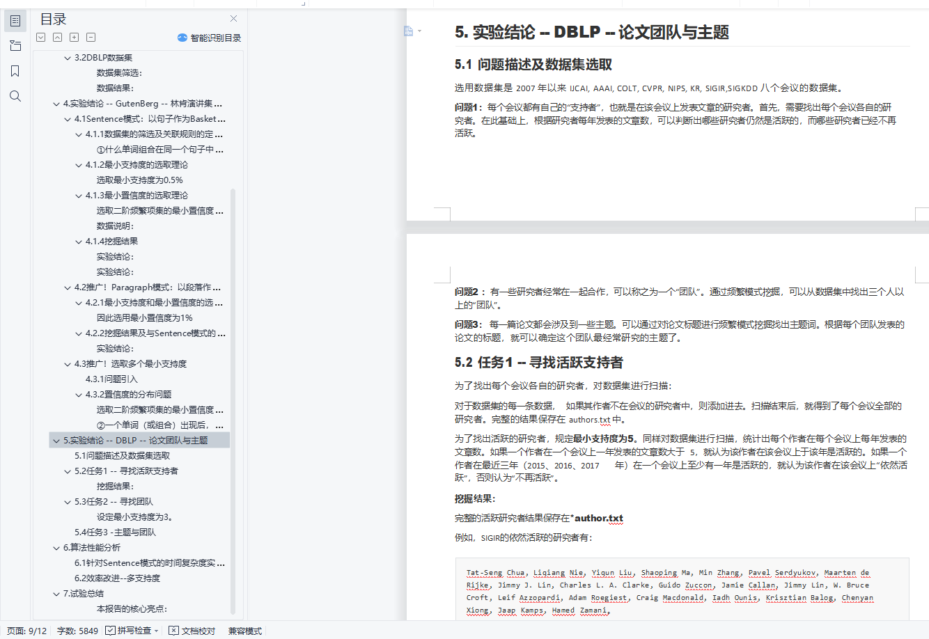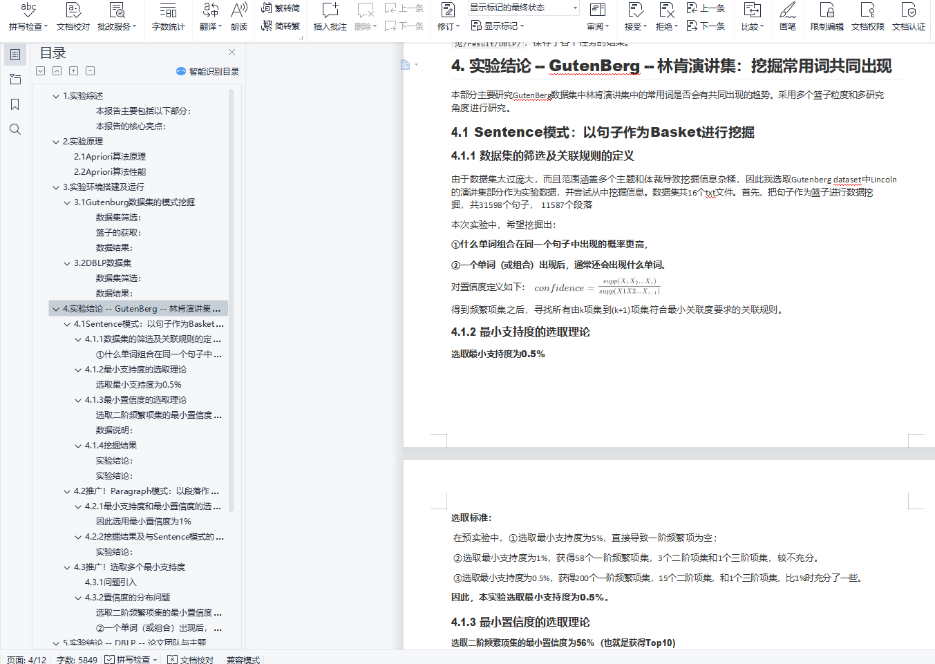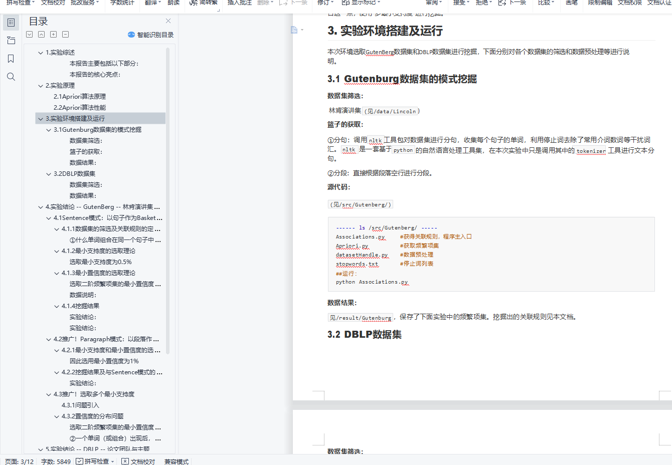 目录1. 实验综述 12. 实验原理 12.1 Apriori算法原理 22.2 Apriori算法性能 33. 实验环境搭建及运行 33.1 Gutenburg数据集的模式挖掘 33.2 DBLP数据集 34. 实验结论 -- GutenBerg -- 林肯演讲集:挖掘常用词共同出现 44.1 Sentence模式:以句子作为Basket进行挖掘 44.2 推广!Paragraph模式:以段落作为Basket进行挖掘 84.3 推广!选取多个最小支持度 115. 实验结论 -- DBLP -- 论文团队与主题 125.1 问题描述及数据集选取 125.2 任务1 -- 寻找活跃支持者 135.3 任务2 -- 寻找团队 135.4 任务3 -主题与团队 136. 算法性能分析 146.1 针对Sentence模式的时间复杂度实证研究 146.2 效率改进--多支持度 147. 试验总结 151.实验综述关联分析常常用于从大规模数据库中寻找元素的隐含关系,是数据仓库中数据挖掘的最常用的方法。本实验旨在实 现基本的数据挖掘算法(Apriori算法),选取部分数据集数据进行挖掘。在探寻数据隐含关系的同时,试图评估数 据挖掘算法的性能和特性。本报告主要包括以下部分:1.实验原理(包括算法详细描述、算法特点等)2.实验环境搭建(数据集的选取、挖掘的问题、编程环境简述)3.实验发现4.算法性能分析本报告的核心亮点:1.实现了Apriori算法,并对算法效率进行了实证性研究,应用了潜在解决方案。2.进行了多粒度的数据挖掘(选取了句子和段落作为两种篮子,并比较二者区别)。3.探索了多个支持度值的应用可能。4.进行了多数据集的应用(GutenBerg &&DBLP),对每个数据集进行了多个问题多个角度的研究探讨。
