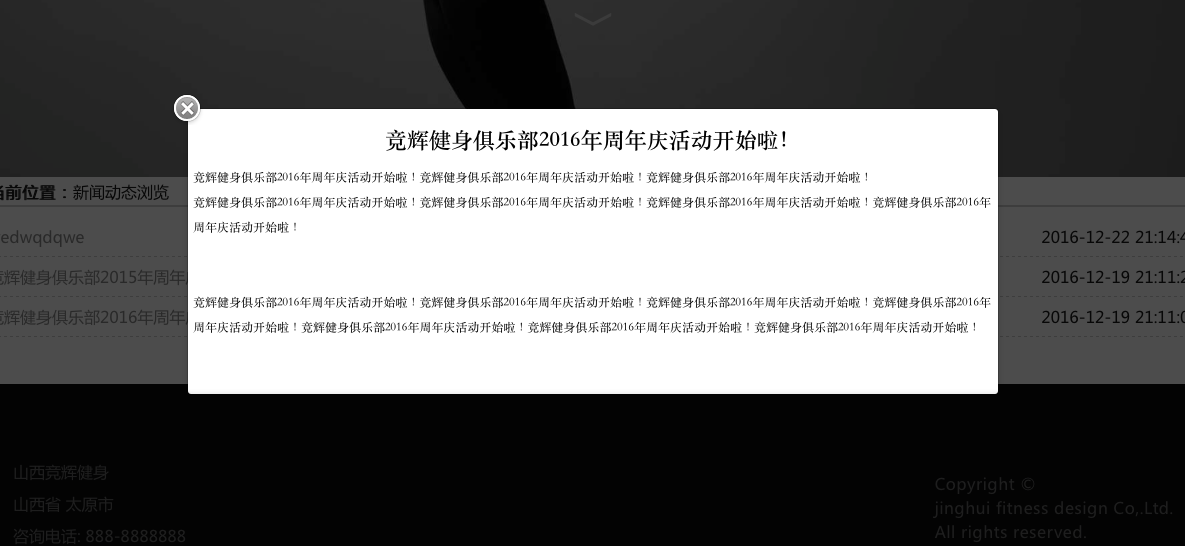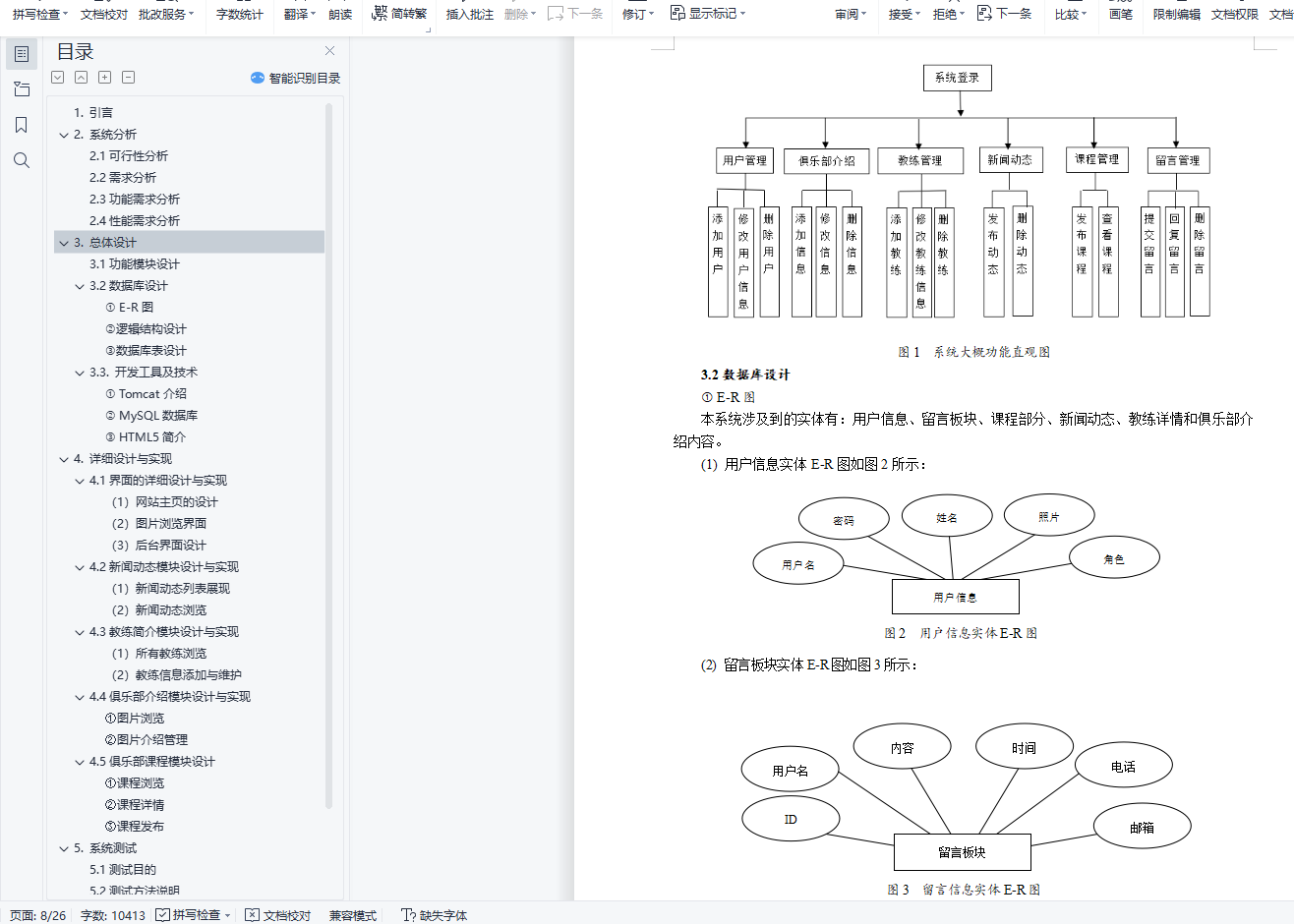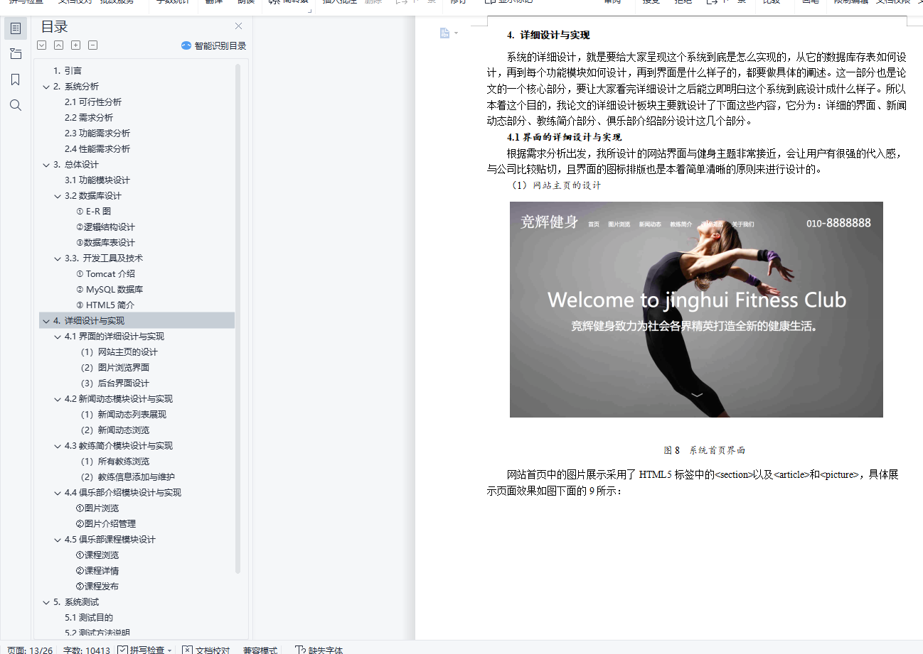 目 录1. 引言 12. 系统分析 22.1可行性分析 22.2需求分析 22.3功能需求分析 22.4性能需求分析 33. 总体设计 33.1功能模块设计 33.2数据库设计 43.3. 开发工具及技术 84. 详细设计与实现 84.1界面的详细设计与实现 84.2新闻动态模块设计与实现 114.3教练简介模块设计与实现 134.4俱乐部介绍模块设计与实现 144.5俱乐部课程模块设计 155. 系统测试 165.1测试目的 165.2测试方法说明 165.3测试用例设计 165.4测试结果分析 186. 结语 18参考文献 19基于html5的健身俱乐部网站设计与实现摘要:本次开发设计的网站为竞辉健身俱乐部网站。整个体系运用HTML5开发技术,以JDK1.6为开发工具,以Tomcat为服务器以MySql作为数据库开发工具。网站主要分为前台和后台两个部分,前台主要是面向消费者,后台面向竞辉的管理员。关键词:健身俱乐部网站 HTML5 MySqlFitness club website design and implementation based on html5Abstract: The website developed and designed this time is the Jinghui Fitness Club website.The whole system uses HTML5 development technology, with JDK1.6 as the development tool, with Tomcat as the server and MySql as the database development tool.The website is mainly divided into two parts: the front desk and the background. The front desk is mainly for consumers, and the background is for the administrator of Jinghui.Key words: fitness club website HTML5 MySql