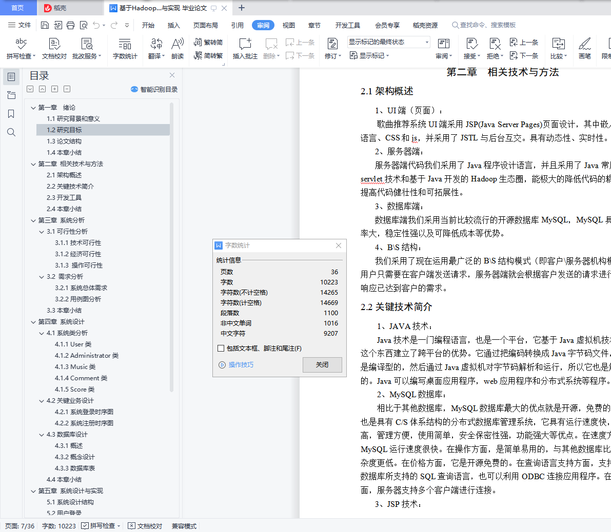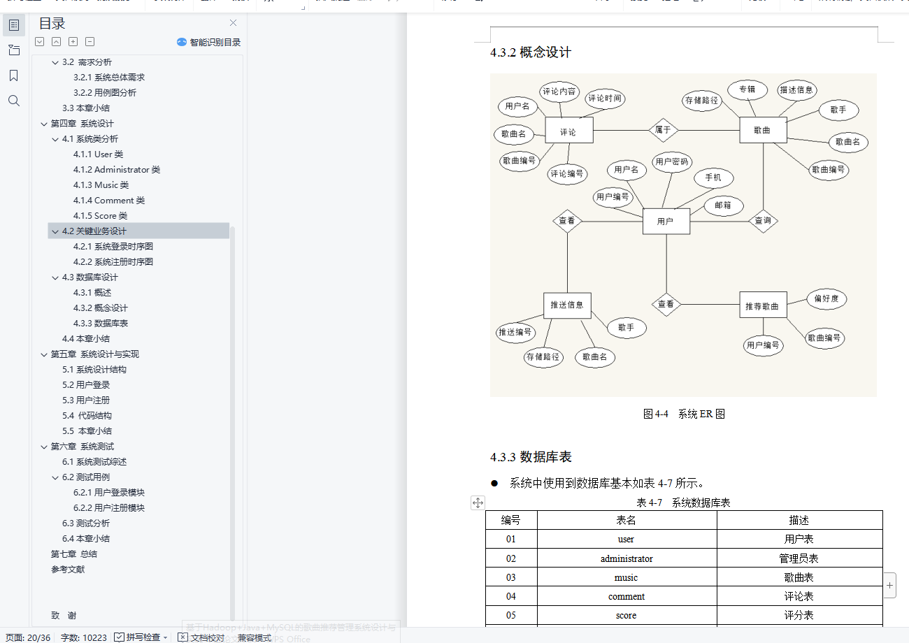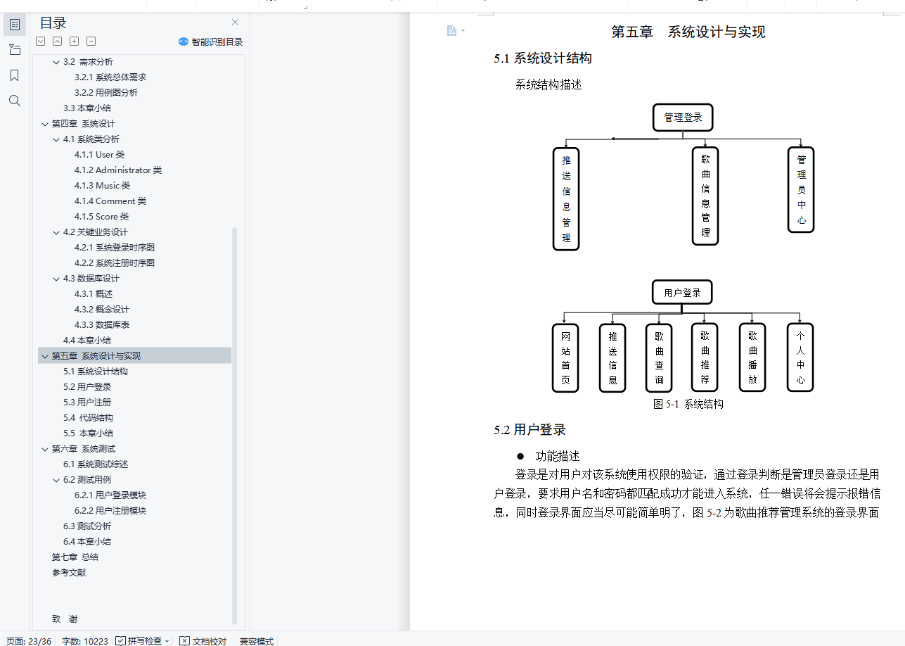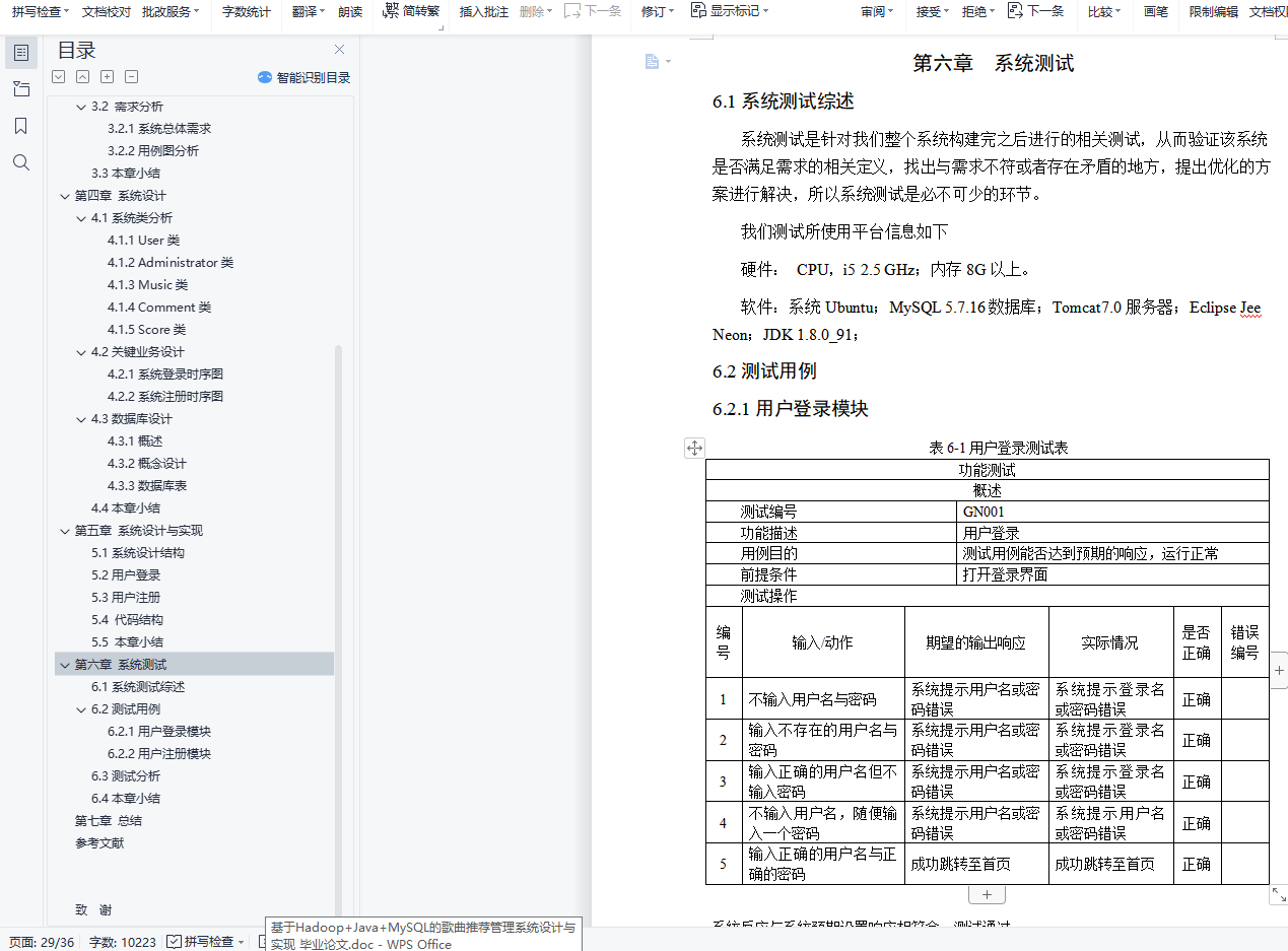 摘 要基于Hadoop的歌曲推荐管理系统是针对当前火热的大数据技术,在海量歌曲的管理基础上,让用户具有更好的使用体验,对有相同品味的用户,推荐可能喜欢的歌曲,在提升音乐平台的高可用性的同时,通过智能推荐提升用户对此音乐平台的好感度。本歌曲推荐管理系统就是深入了解用户行为的各种切实需求而开发的一种融合用户管理、歌曲管理、歌曲评分、歌曲推荐等功能于一体的推荐管理系统。该系统是基于BS结构,采用MVC设计思想,使用Java程序设计语言、MySQL数据库、Hadoop离线分析、Java开源工具Eclipse编写程序、Tomcat模拟服务器、Java的JRE运行环境、jsp页面等工具开发而来。本文分为七个章节,分别为绪论、相关技术与方法、系统分析、系统设计、系统设计、系统实现、系统测试和总结。逐步分析了该系统的开发过程。其中的重点的内容包括:选题背景与意义、对现行系统与用户需求的调查与分析、新系统数据流程分析、系统总体结构设计、数据库设计、用户界面设计和程序设计。关键词:Hadoop;歌曲推荐系统;MVC;B/S结构;MySQL数据库;Tomcat;JSP目 录第一章 绪论 11.1研究背景和意义 11.2研究目标 11.3论文结构 11.4本章小结 2第二章 相关技术与方法 32.1架构概述 32.2关键技术简介 32.3开发工具 42.4本章小结 5第三章 系统分析 63.1可行性分析 63.1.1技术可行性 63.1.2经济可行性 63.1.3 操作可行性 63.2 需求分析 63.2.1系统总体需求 63.2.2用例图分析 73.3本章小结 10第四章 系统设计 114.1系统类分析 114.1.1 User类 114.1.2 Administrator类 114.1.3 Music类 124.1.4 Comment类 134.1.5 Score类 134.2关键业务设计 144.2.1系统登录时序图 144.2.2系统注册时序图 154.3数据库设计 154.3.1概述 154.3.2概念设计 164.3.3数据库表 164.4本章小结 18第五章 系统设计与实现 195.1系统设计结构 195.2用户登录 195.3用户注册 215.4 代码结构 235.5 本章小结 24第六章 系统测试 256.1系统测试综述 256.2测试用例 256.2.1用户登录模块 256.2.2用户注册模块 266.3测试分析 266.4本章小结 29第七章 总结 30参考文献 31致 谢 32