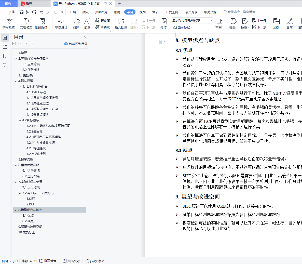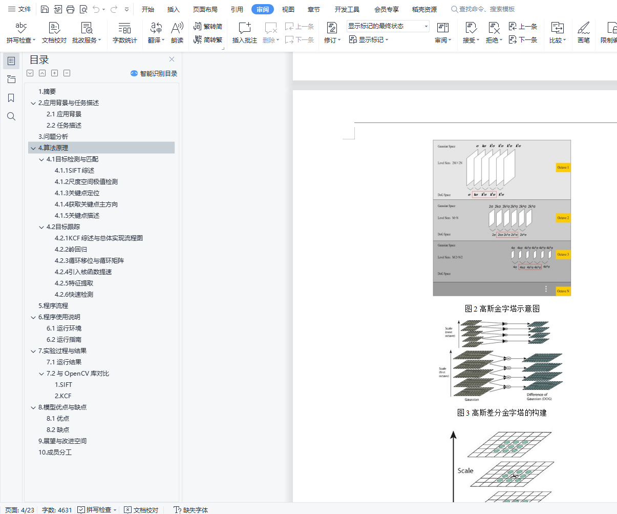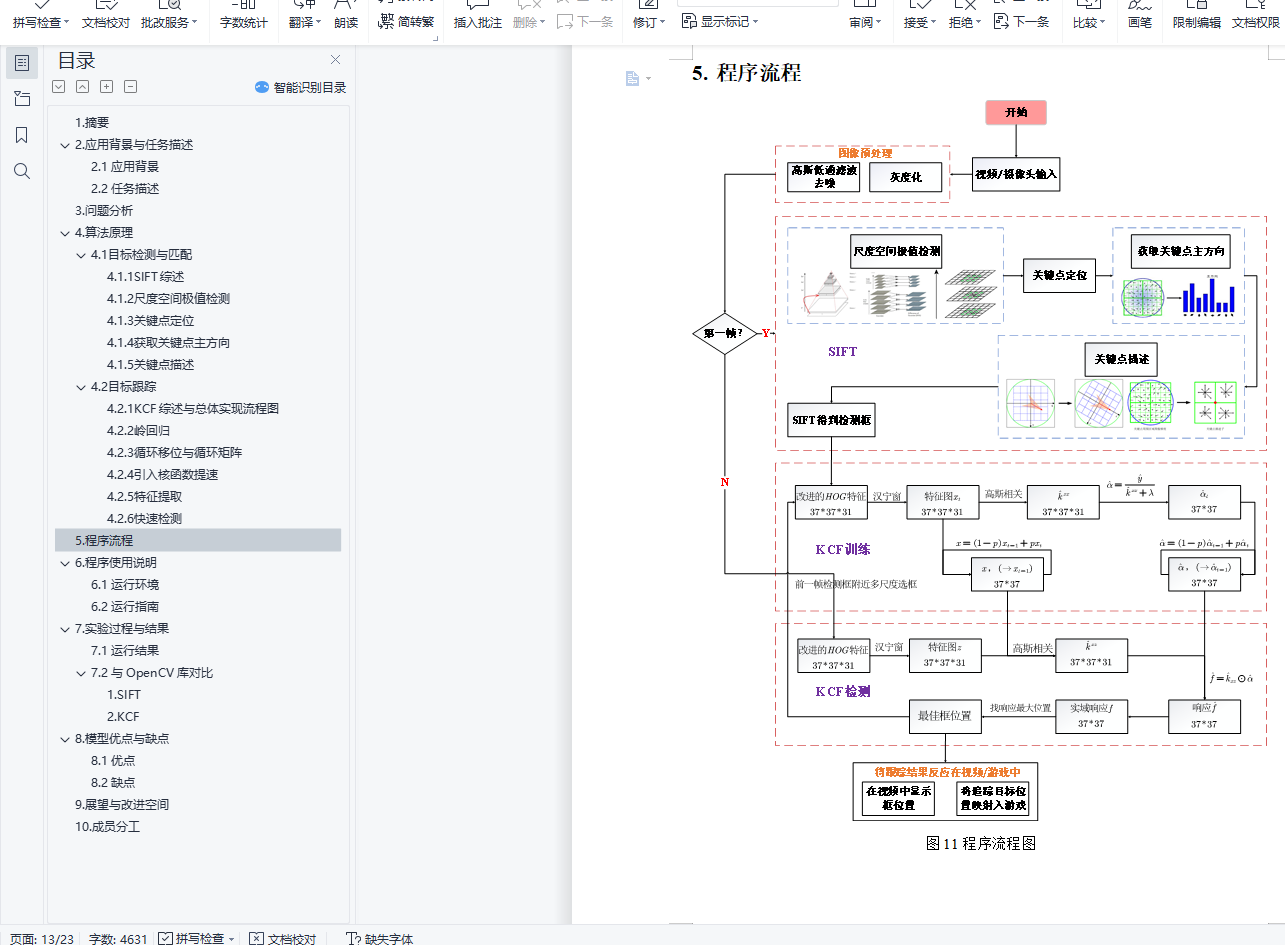 目录1. 摘要 12. 应用背景与任务描述 12.1 应用背景 12.2 任务描述 13. 问题分析 14. 算法原理 24.1 目标检测与匹配 24.1.1 SIFT综述 24.1.2 尺度空间极值检测 24.1.3 关键点定位 44.1.4 获取关键点主方向 44.1.5 关键点描述 54.2 目标跟踪 64.2.1 KCF综述与总体实现流程图 64.2.2 岭回归 64.2.3 循环移位与循环矩阵 74.2.4 引入核函数提速 84.2.5 特征提取 94.2.6 快速检测 95. 程序流程 116. 程序使用说明 126.1 运行环境 126.2 运行指南 127. 实验过程与结果 137.1 运行结果 137.2 与OpenCV库对比 151. SIFT 152. KCF 178. 模型优点与缺点 208.1 优点 208.2 缺点 209. 展望与改进空间 2010. 成员分工 211.摘要本次编程实验我们从日常生活出发,运用计算机视觉算法解决实际问题。我们利用SIFT与KCF实现了运动目标的识别匹配与跟踪。该算法有着很广的应用,如无人机跟拍、导弹追踪目标、追踪人手实现人机交互等。我们的程序模拟了无人机跟拍的过程,此外,我们还开发了一款游戏,无须使用键盘和鼠标,利用摄像头追踪手的位置实现人在游戏中的操作。2.应用背景与任务描述2.1 应用背景目标检测匹配与跟踪算法有着很广的应用,如无人机自动跟拍、导弹追踪目标、追踪人手实现人机交互等。2.2 任务描述给定目标(以一张图片的方式方程告诉程序),要求程序能够根据所给目标的图片实时跟踪该目标在一段视频中的位置。实现一个简单的飞机扫射游戏,计算机通过内置摄像头跟踪玩家的手,玩家通过移动手部,可以实现对游戏中的飞机的操控。