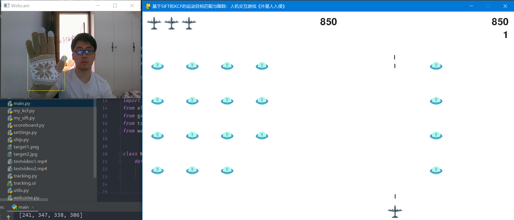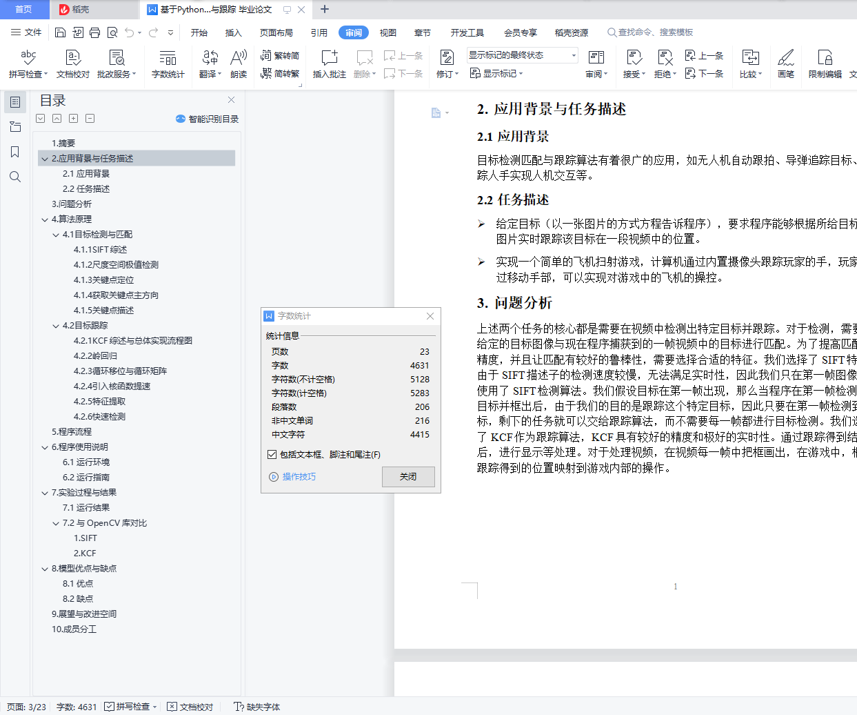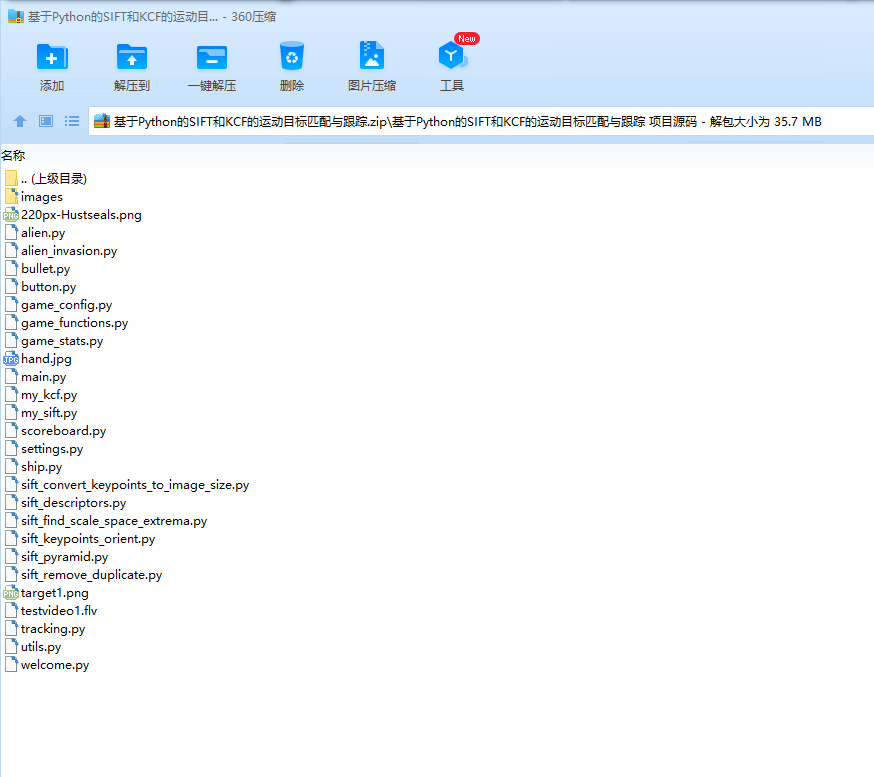 目录1. 摘要 12. 应用背景与任务描述 12.1 应用背景 12.2 任务描述 13. 问题分析 14. 算法原理 24.1 目标检测与匹配 24.1.1 SIFT综述 24.1.2 尺度空间极值检测 24.1.3 关键点定位 44.1.4 获取关键点主方向 44.1.5 关键点描述 54.2 目标跟踪 64.2.1 KCF综述与总体实现流程图 64.2.2 岭回归 64.2.3 循环移位与循环矩阵 74.2.4 引入核函数提速 84.2.5 特征提取 94.2.6 快速检测 95. 程序流程 116. 程序使用说明 126.1 运行环境 126.2 运行指南 127. 实验过程与结果 137.1 运行结果 137.2 与OpenCV库对比 151. SIFT 152. KCF 178. 模型优点与缺点 208.1 优点 208.2 缺点 209. 展望与改进空间 2010. 成员分工 211.摘要本次编程实验我们从日常生活出发,运用计算机视觉算法解决实际问题。我们利用SIFT与KCF实现了运动目标的识别匹配与跟踪。该算法有着很广的应用,如无人机跟拍、导弹追踪目标、追踪人手实现人机交互等。我们的程序模拟了无人机跟拍的过程,此外,我们还开发了一款游戏,无须使用键盘和鼠标,利用摄像头追踪手的位置实现人在游戏中的操作。2.应用背景与任务描述2.1 应用背景目标检测匹配与跟踪算法有着很广的应用,如无人机自动跟拍、导弹追踪目标、追踪人手实现人机交互等。2.2 任务描述给定目标(以一张图片的方式方程告诉程序),要求程序能够根据所给目标的图片实时跟踪该目标在一段视频中的位置。实现一个简单的飞机扫射游戏,计算机通过内置摄像头跟踪玩家的手,玩家通过移动手部,可以实现对游戏中的飞机的操控。
