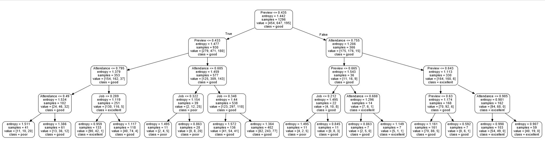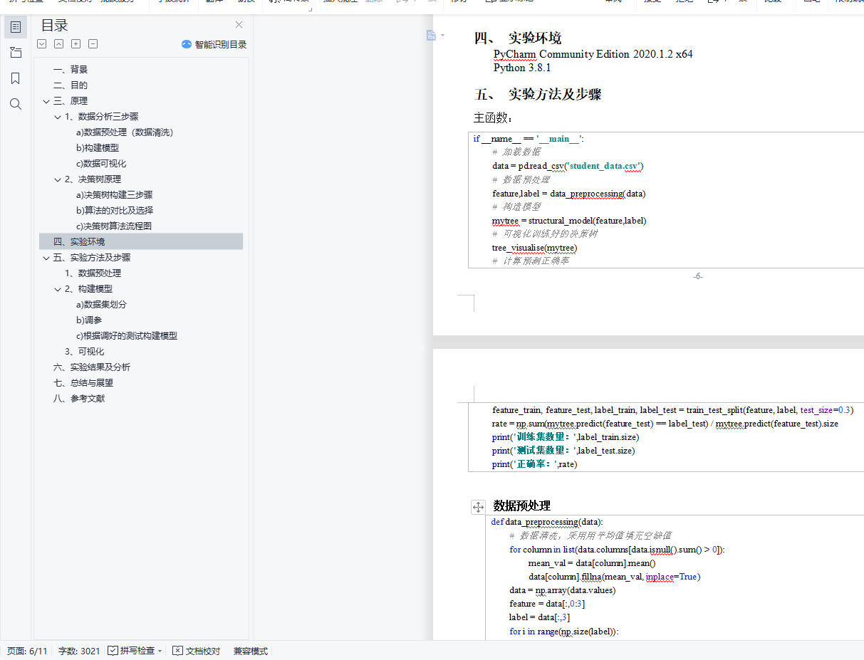 目 录一、 背景 1二、 目的 2三、 原理 21、 数据分析三步骤 2a) 数据预处理(数据清洗) 2b) 构建模型 3c) 数据可视化 32、 决策树原理 3a) 决策树构建三步骤 3b) 算法的对比及选择 4c) 决策树算法流程图 5四、 实验环境 5五、 实验方法及步骤 51、 数据预处理 62、 构建模型 6a) 数据集划分 6b) 调参 7c) 根据调好的测试构建模型 83、 可视化 9六、 实验结果及分析 10七、 总结与展望 10八、 参考文献 11一、背景近年来,受学习理论发展和技术进步的影响,学习环境已经开始从线下转移到线上。尤其像今年这种情形,一些不可抗拒的外界因素,使得学校不得部在线教学,这让学生和教学工作者切身体会了线上教学的便利和优点,同时也找到了克服其缺陷的办法。因此,即使这场灾难过去后,线上教学也将紧密的与线下教学的模式相结合在一起。学生在网上学习将产生大量的学习行为数据,这些数据无论是对于学生还是教育工作者来说,都是一个巨大的“宝藏”。通过机器学习算法进行数据分析,无疑是对这个“宝藏”最佳的开采方式。利用学生在网上的学习行为数据,感受学生的学习状态,预测学生的课程成绩。虽然学生是学习的主体,但是在学习过程中,难免会有过度自信或过分自卑的情况,学习行为数据没有任何感情的掺杂,可以给出一个理性、合理的评测。教师也可以根据预测情况,对学生个性化教学,因材施教,提交学生成绩。毫无疑问,对学习行为数据的分析是一个必然趋势趋势,是势在必行的。本设计基于决策树算法从多角度对某学校网上平台的学生行为数据进行分析,将根据学生的综合成绩将学生划分为三类:优秀(80分 – 100分)、良好(60分 – 79)、差(0分 – 59分)。这些数据包括到课率、预习率、习题正确率、综合成绩,数据量达千余条。通过已有数据建立决策树模型,供该平台未来的使用者进行预测,起到教学预警的作用。