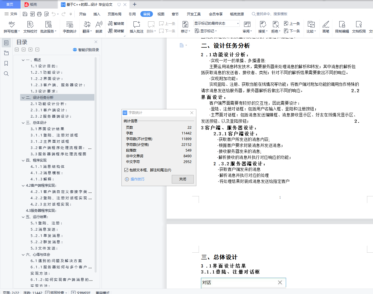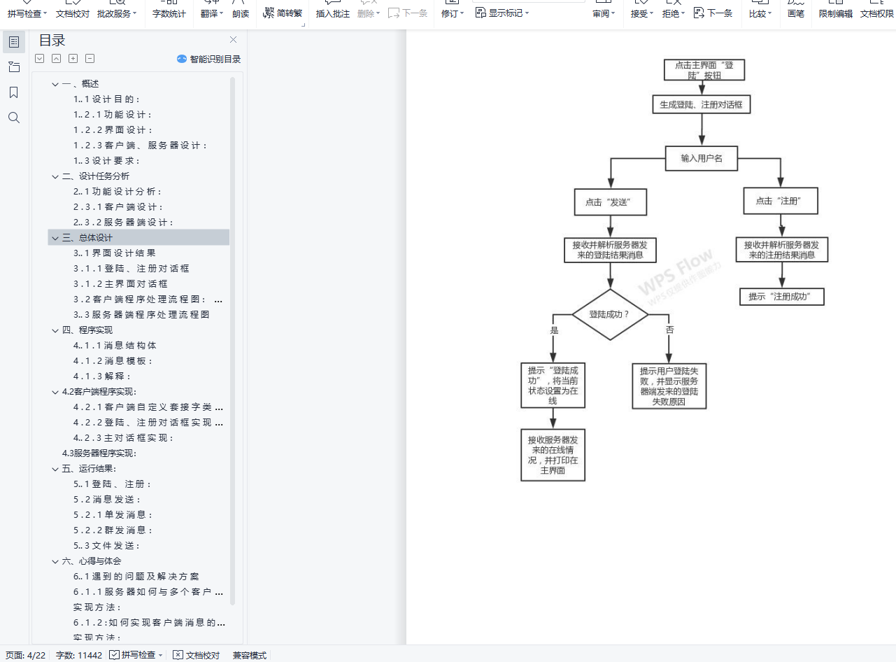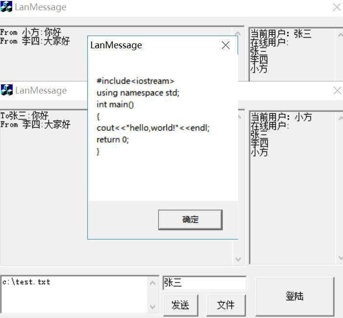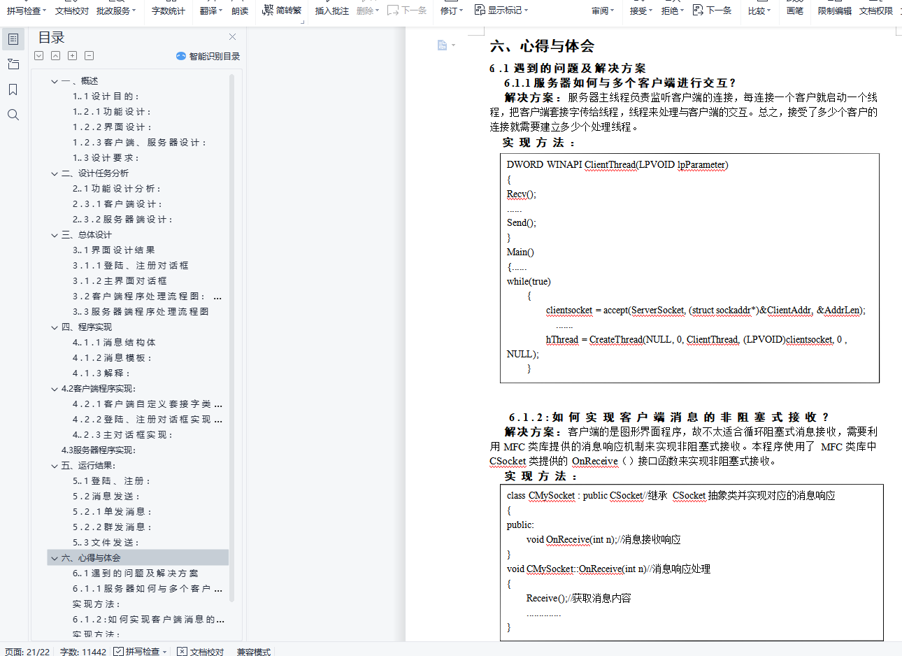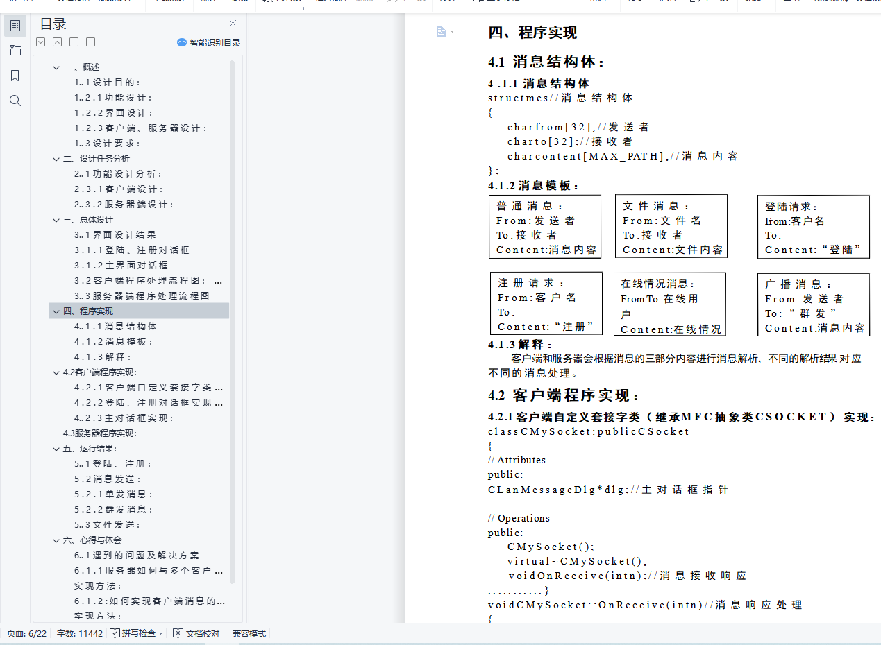 目录― 、 概 述 11 . 1 设 计 目 的 : 11 . 2 设 计 内 容 : 11 . 2 . 1 功 能 设 计 : 11 . 2 . 2 界 面 设 计 : 11 . 2 . 3 客 户 端 、 服 务 器 设 计 : 11 . 3 设 计 要 求 : 1二 、 设 计 任 务 分 析 12 . 1 功 能 设 计 分 析 : 12 . 2 界 面 设 计 : 12. 3 客 户 端 、 服 务 器 设 计 : 12 . 3 . 1 客 户 端 设 计 : 12 . 3 . 2 服 务 器 端 设 计 : 1三 、 总 体 设 计 23. 1 界 面 设 计 结 果 23 . 1 . 1 登 陆 、 注 册 对 话 框 23 . 1 . 2 主 界 面 对 话 框 23 . 2 客 户 端 程 序 处 理 流 程 图 : 33. 3 服 务 器 端 程 序 处 理 流 程 图 4四 、 程 序 实 现 54. 1 消 息 结 构 体 : 54 . 1 . 1 消 息 结 构 体 54 . 1 . 2 消 息 模 板 : 54 . 1 . 3 解 释 : 54 . 2 客 户 端 程 序 实 现 : 54 . 2 . 1 客 户 端 自 定 义 套 接 字 类 ( 继 承 M F C 抽 象 类 C S O C K E T ) 实 现 : 54 . 2 . 2 登 陆 、 注 册 对 话 框 实 现 : 64 . 2 . 3 主 对 话 框 实 现 : 74 . 3 服 务 器 程 序 实 现 : 10五 、 运 行 结 果 : 155 . 1 登 陆 、 注 册 : 155 . 2 消 息 发 送 : 175 . 2 . 1 单 发 消 息 : 175 . 2 . 2 群 发 消 息 : 185 . 3 文 件 发 送 : 19六 、 心 得 与 体 会 206 . 1 遇 到 的 问 题 及 解 决 方 案 206 . 1 . 1 服 务 器 如 何 与 多 个 客 户 端 进 行 交 互 ? 206 . 1 . 2 : 如 何 实 现 客 户 端 消 息 的 非 阻 塞 式 接 收 ? 206 . 2 心 得 与 体 会 : 21参 考 文 献 : 21― 、概述1.. 1 设 计 目 的 :设计一个基于 LAN 的即时通信软件,实现在局域网下可靠的、稳定的即时通信功能以及其从属的附加功能。 1 . 2 设 计 内 容 :1.. 2 . 1 功 能 设 计 :・实现一对一的单播通信,包括消息发送与接收以及文件的发送与接收;・实现一对多的多播通信,包括消息的发送与接收;・附加功能:实现登陆、注册、获取当前在线情况等功能;1 . 2 . 2 界 面 设 计 :・客户端的交互界面设计。1 . 2 . 3 客 户 端 、 服 务 器 设 计 :・客户端需要完成的功能;・服务器需要完成的功能;・客户端、服务器的交互设计;1.. 3 设 计 要 求 :结合《计算机网络》课程所学的知识以及查阅相应的资料完成相应的设计内容, 且需要保证设计的质量以及程序的可靠性和稳定性。二、设计任务分析2.. 1 功 能 设 计 分 析 :・实现一对一的单播、多播通信:主要运用消息转发技术,需要服务器来处理消息的解析和转发;其中消息的解析包括获取消息的发送者、接收者、类别;针对不同的解析结果需要做出不同的响应。・实现附加功能:实现登陆、注册、获取当前在线情况等功能;将客户端对附加功能的调用当作特殊的请求消息发送给服务器,服务器解析后做出不同的响应。 2 . 2 界 面 设 计 :客户端界面需要有较好的交互性,因此需要设计:・登陆、注册对话框:包括用户名输入框、登陆和注册按钮;・主界面对话框:包括消息发送编辑框、消息接收显示区、好友在线情况显示区、发送按钮、以及登陆按钮; 2 . 3 客 户 端 、 服 务 器 设 计 :2 . 3 . 1 客 户 端 设 计 :・获取客户所发送的消息内容;・根据客户要求封装消息并发送消息;・接收服务器发来的消息;・解析接收的消息并执行对应响应的功能;2.. 3 . 2 服 务 器 端 设 计 :・获取客户端发来的消息・解析消息并执行对应的处理・将处理结果封装成消息发送给指定客户
