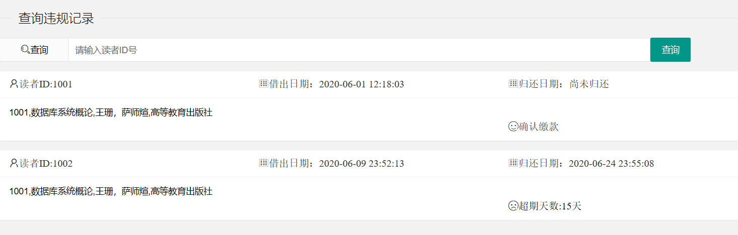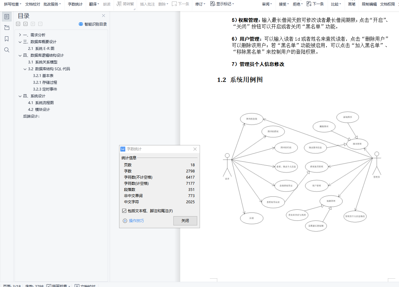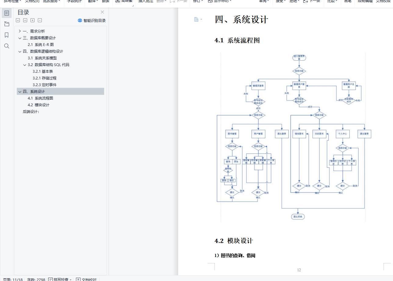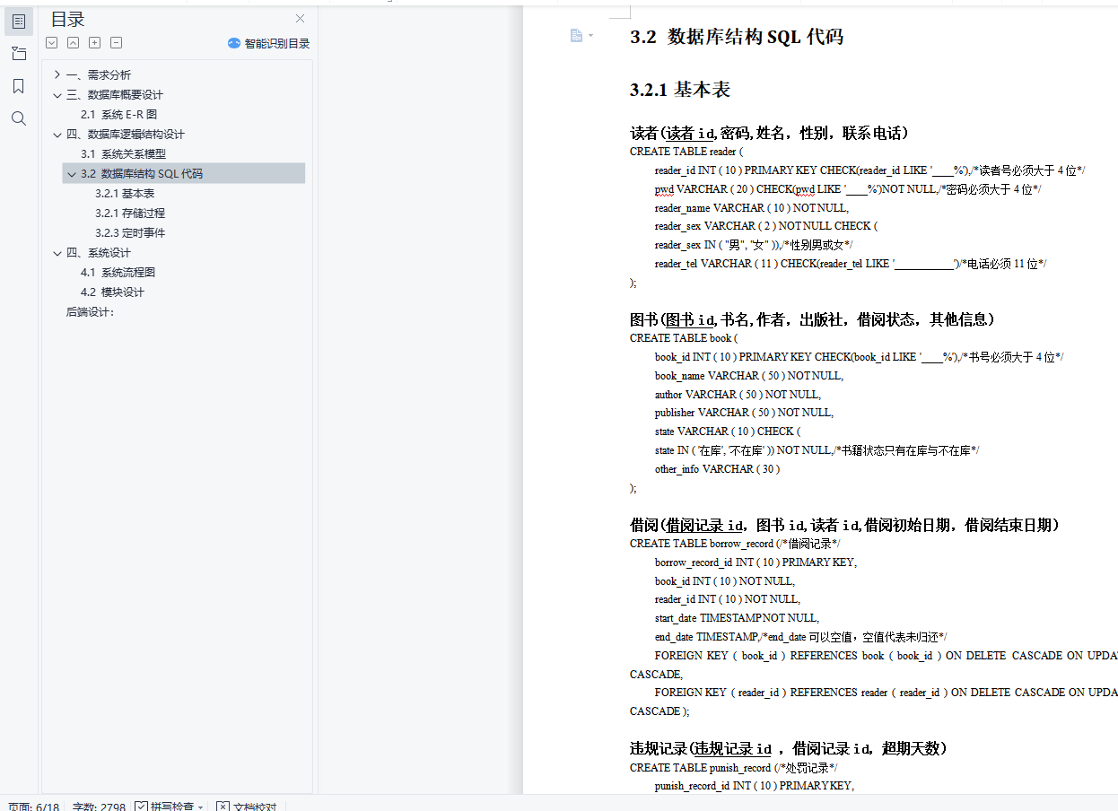 目录一、需求分析 21.1 功能描述 21.1.1“读者”功能 21.1.2“管理员”功能 31.2 系统用例图 4三、数据库概要设计 52.1 系统E-R图 5四、数据库逻辑结构设计 53.1 系统关系模型 53.2 数据库结构SQL代码 73.2.1基本表 73.2.1存储过程 83.2.3定时事件 11四、系统设计 124.1 系统流程图 124.2 模块设计 12后端设计: 1717一、需求分析1.1 功能描述1.1.1“读者”功能1)图书的查询:图书的查询可以通过搜索图书id、书名、作者名、出版社来实现,显示结果中需要包括书籍信息以及是否被借阅的情况;2)图书的借阅:借阅图书时,需要判断该读者现已借阅的图书数量,若超过3本,则暂时不能借书;若尚有未缴纳罚金,暂时不能借书;否则点击“确认借阅”,即完成借阅。3)图书的归还:归还图书时,若尚有罚金未缴纳,提示学生去管理中心线下缴纳罚金再进行线下还书;否则界面显示所有待还书籍的信息,点击“确认还书”或输入图书id再点击“确认”即完成还书。4)查看、修改个人信息:个人信息包括用户id、姓名、密码、姓名以及电话;修改个人信息:包括修改姓名、密码、性别、电话等,其中用户id不可修改。5)查询借阅历史:通过输入书籍的id、书名、作者或出版社来查询借阅记录;记录内容包括读者id、书籍信息和借阅的开始日期以及结束日期;若书籍尚未归还,“结束日期”后会显示“尚未归还”。6)查看处罚记录:处罚记录的内容包括违规的借阅记录的信息;如若相关书籍仍未进行线下归还且读者也未缴纳罚金,则提示尚未缴纳罚金;否则显示该条借阅记录的超期天数。7)注册1.1.2“管理员”功能1)添加图书:输入图书的Id、书名、作者、出版社、其他信息,系统将信息导入数据库;2)删除图书:如果书籍未被借出,则可通过鼠标点击“删除图书”来完成删除任务;否则不能进行删除。3)修改图书信息:通过点击“修改信息”,打开修改图书信息页面,修改相应信息后(书名、作者、出版社、其他信息),点击保存;4)借阅处罚管理:输入用户id,可以查看用户的借阅违规处罚情况,用户缴纳罚款后,可点击“缴纳罚款”,撤销对该生的处罚,恢复其正常借阅和归还权利;5)权限管理:输入最长借阅天数可修改读者最长借阅期限;点击“开启”、“关闭”按钮可以开启或者关闭“黑名单”功能。6)用户管理:可以输入读者id或者姓名来查找读者,点击“删除用户”可以删除该用户;若“黑名单”功能被启用,可以点击“加入黑名单”、“移除黑名单”来控制用户的登陆权限。7)管理员个人信息修改