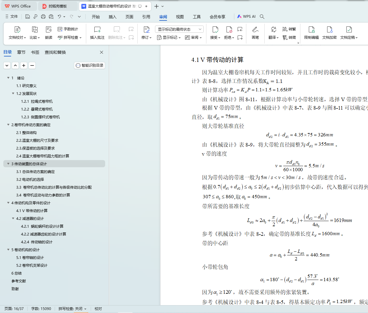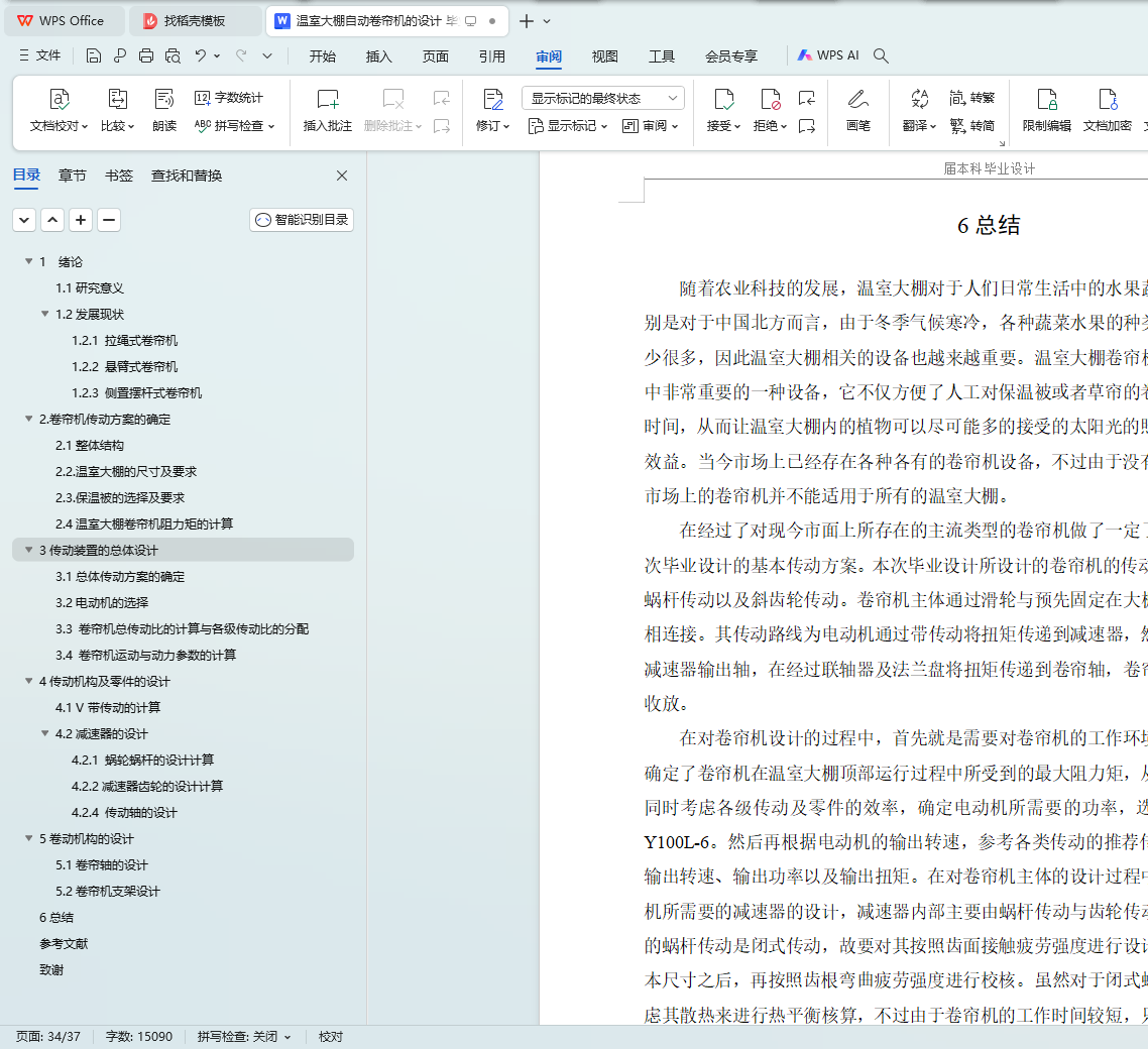 随着农业科技的发展,温室大棚对于人们日常生活中的水果蔬菜供应越来越重要,因此温室大棚的辅助设备的重要性日益提高。而温室大棚自动卷帘机可以帮助大棚种植者减轻劳动强度,方便收放保温被。在经过调查市面上现有的卷帘机设备后,设计一款结构稳定,安全可靠、且适用于大跨距后墙式温室大棚的卷帘机。卷帘机主体由电动机、导轨支架、减速器以及卷帘轴组成,通过倒顺开关控制电动机的正反转来控制保温被或者草帘的收放。在对卷帘机系统进行受力分析时,将卷帘机的卷帘轴与保温被看作一个整体,对其在温室大棚上的运动做受力分析,确定了卷帘机在运行过程中所受到的最大阻力矩,从而选定所需的电动机,再对各级传动路线的传动比进行分配。其中卷帘机的主要传动路线依次为V带传动、蜗杆传动以及斜齿轮传动。蜗杆传动与斜齿轮传动构成减速器的主体结构。在减速器的输出轴两侧,通过联轴器及法兰盘,将横跨大棚的卷帘轴连接起来,再将保温被固定在卷帘轴上,实现保温被随着卷帘轴的上下滚动而收放。温室大棚的中间安装导轨支架,卷帘机主体的支架通过滑轮与导轨相连接,从而保证运行的平稳性。