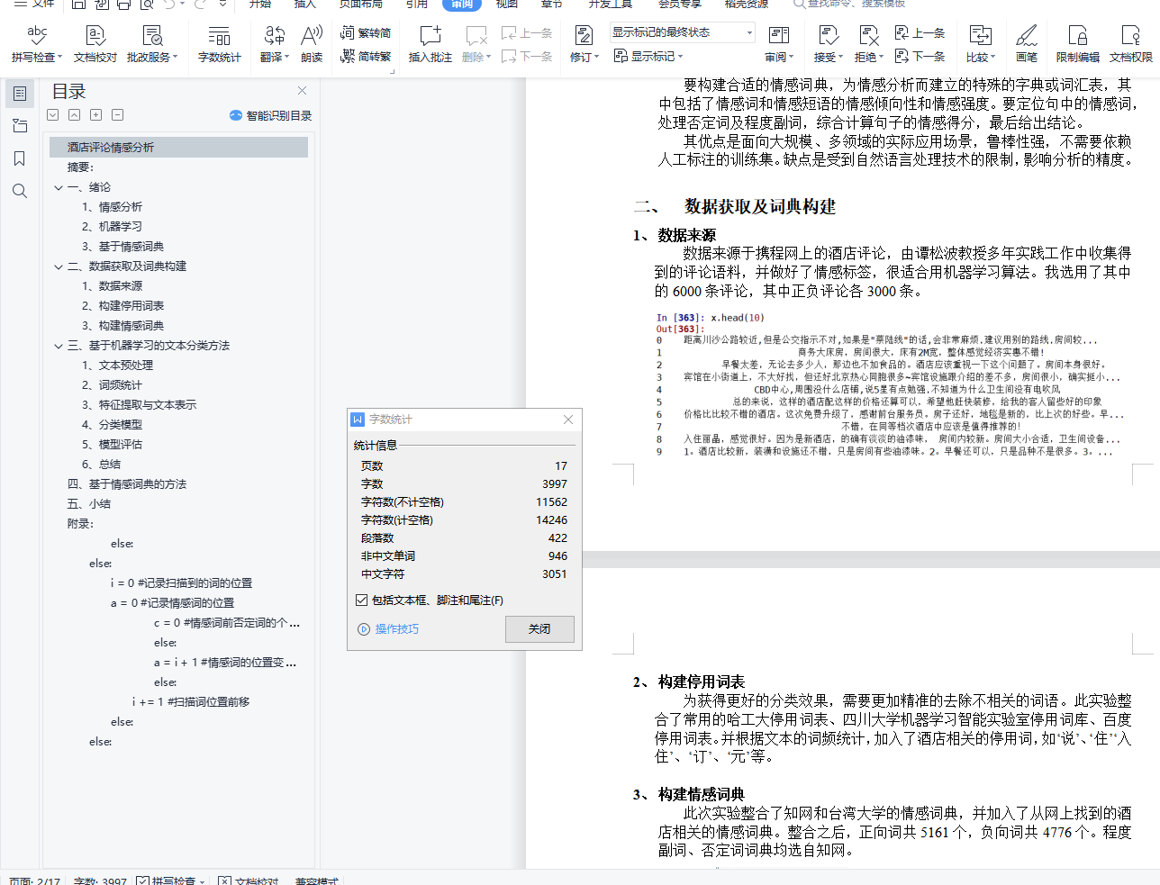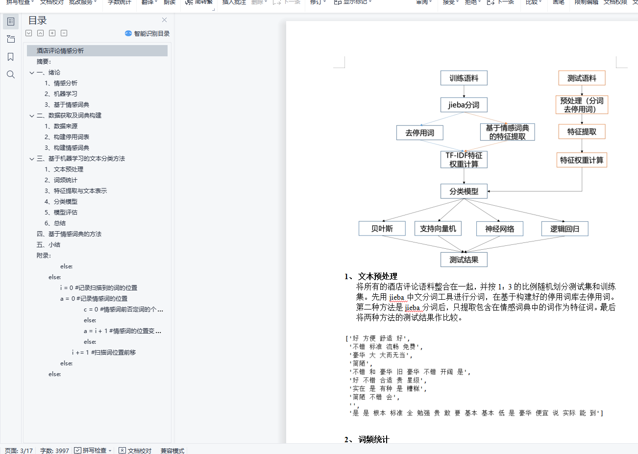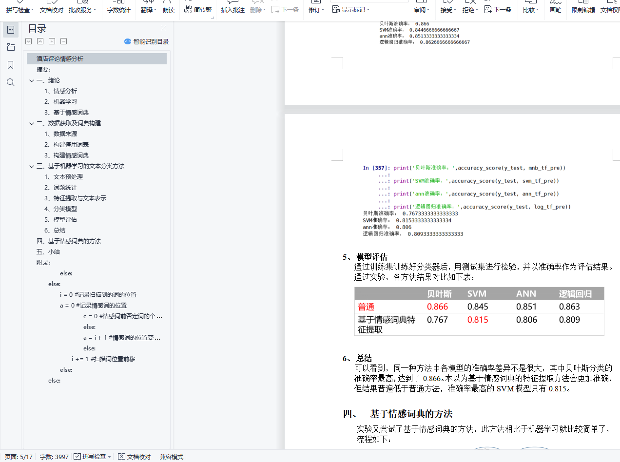 酒店评论情感分析摘要:本文采用酒店评论数据集进行情感分析,通过机器学习和基于情感词典两种方法进行分析比较。其中,机器学习方法采用了多种算法,有支持向量机、神经网络、朴素贝叶斯以及逻辑回归四种,并比较各分类器的准确率,得到准确率最高的模型。关键词:酒店评论 情感分析 机器学习 情感词典目录酒店评论情感分析 1摘要: 1一、 绪论 21、 情感分析 22、 机器学习 23、 基于情感词典 2二、 数据获取及词典构建 21、 数据来源 22、 构建停用词表 33、 构建情感词典 3三、 基于机器学习的文本分类方法 31、 文本预处理 42、 词频统计 43、 特征提取与文本表示 54、 分类模型 55、 模型评估 66、 总结 6四、 基于情感词典的方法 6五、 小结 7附录: 8else: 15else: 15i = 0 #记录扫描到的词的位置 15a = 0 #记录情感词的位置 15c = 0 #情感词前否定词的个数 15else: 16a = i + 1 #情感词的位置变化 16else: 17i += 1 #扫描词位置前移 17else: 17else: 17