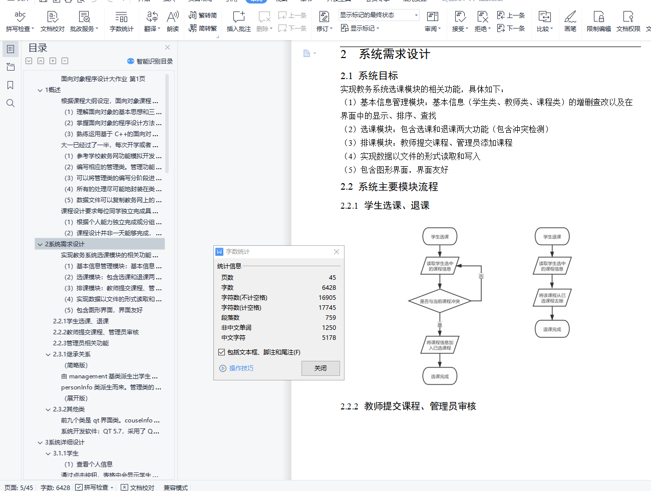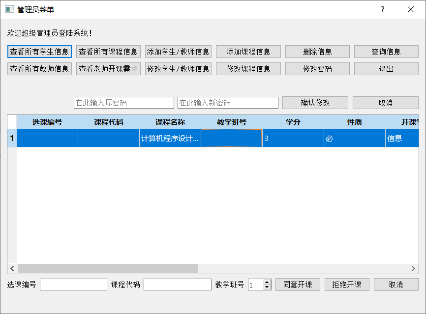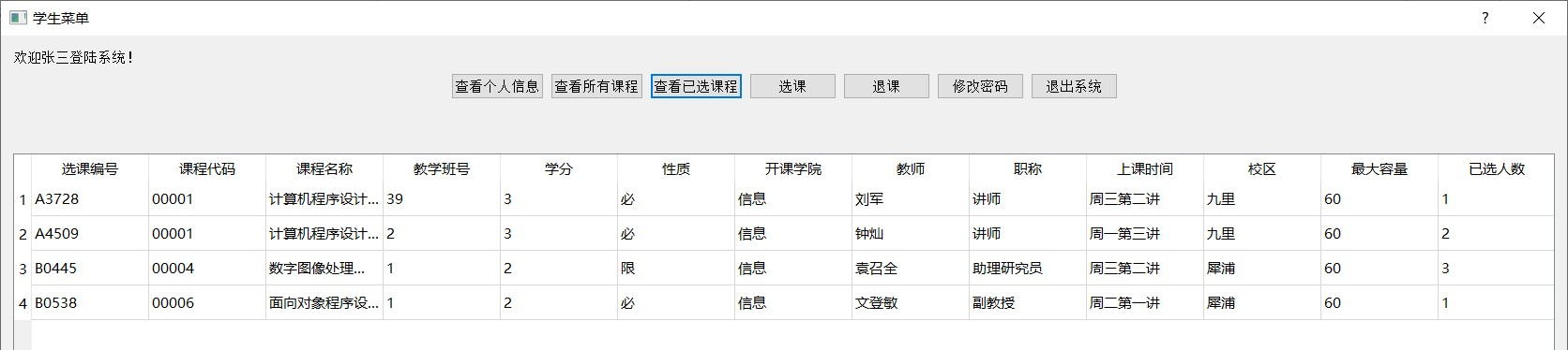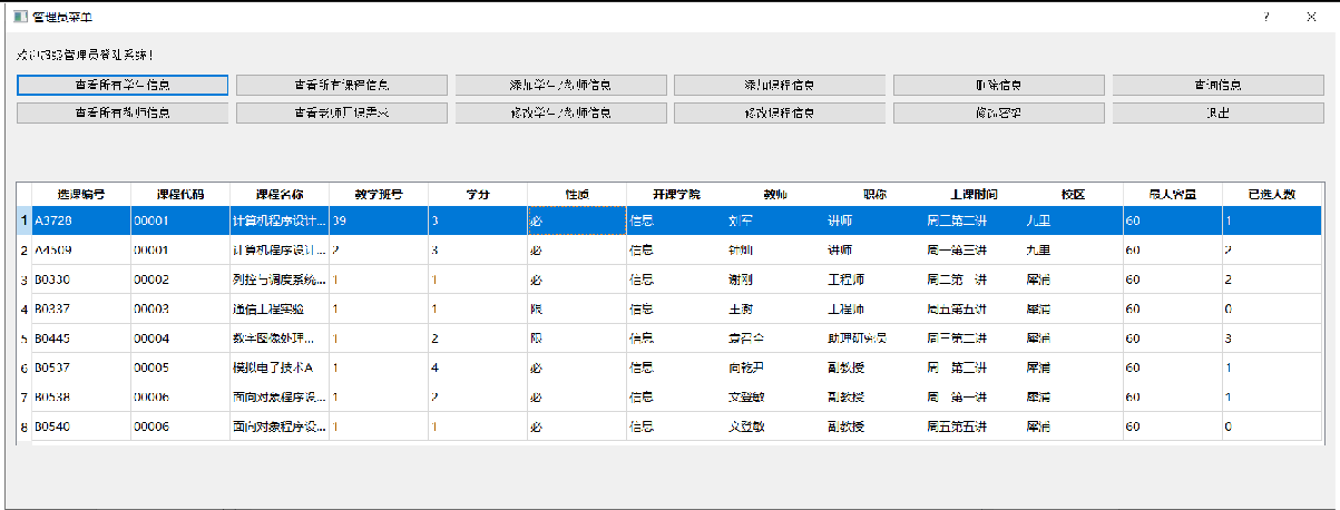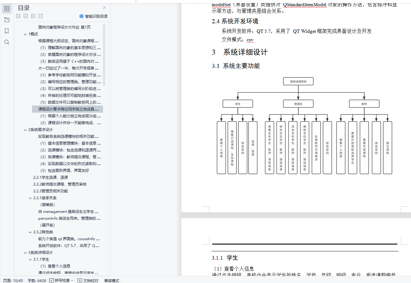 目 录1概述 11.1课程设计目的和意义 11.2课程设计内容 11.3课程设计要求 12系统需求设计 22.1系统目标 22.2系统主要模块流程 22.2.1学生选课、退课 22.2.2教师提交课程、管理员审核 22.2.3管理员相关功能 32.2.4修改密码 42.3系统类分析图 42.3.1继承关系 52.3.2其他类 72.4系统开发环境 73系统详细设计 73.1系统主要功能 73.1.1学生 83.1.2管理员 83.1.3教师 83.2系统设计中类图 93.3系统主要的数据结构及说明 103.3.1学生类定义及说明 103.3.2教师类定义及说明 113.3.3课程类定义及说明 133.3.4管理员类定义及说明 143.3.6 界面设置类定义及说明 173.4继承机制实现 183.5多态机制实现 183.6主要采用的算法 183.6.1排序算法 183.6.2查找算法 193.6.3冲突检测算法 233.7文件结构 243.7.1courseInfo.csv 文件 243.7.2adminInfo.csv 文件 243.7.3stuInfo.csv 文件 243.7.4teacherInfo.csv 文件 243.7.5waitToLoadCourse.csv 文件 254系统主要功能界面 254.1登陆界面 254.1.1主界面 254.2学生菜单 264.2.1主界面 264.2.2查看个人信息 264.2.3查看所有课程 264.2.4查看已选课程 274.2.5 选课 274.2.6 退课 284.2.7修改密码 284.2.8退出系统 294.3教师菜单 294.3.1主界面 294.3.2查看个人信息 304.3.3查看所授课程信息 304.3.4查看选择该课程的学生 304.3.5提交新的课程 314.3.6修改密码 324.3.7退出系统 324.4管理员菜单 324.4.1主界面 324.4.2查看全校学生信息 334.4.3查看全校课程信息 334.4.4查看全校教师信息 344.4.5查看老师开课需求 344.4.6添加学生信息 354.4.7添加课程信息 354.4.8添加教师信息 364.4.9修改学生信息 364.4.10修改课程信息 374.4.11修改教师信息 384.4.12删除信息 394.4.13查询信息 404.4.14修改密码 414.4.15退出系统 415学习总结 41附件――底层完整代码 42面向对象程序设计大作业 第1页1概述1.1课程设计目的和意义根据课程大纲设定,面向对象课程设计的目的是:(1)理解面向对象的基本思想和三大机制,掌握基于 C++语法的面向对象的基本概念和开发模式,熟练运用面向对象思维模式对信息和通信领域的软件系统问题进行建模(对应毕业要求指标点 1.2)。(2)掌握面向对象的程序设计方法和技术,具备以面向对象程序设计模式对开发需求进行分析、设计和调试的能力(对应毕业要求指标点 3.1)。(3)熟练运用基于 C++的面向对象开发环境,为后续其他面向对象编程环境做好铺垫,针对实际需求充分利用现有开发工具的优势和特点解决具体问题,具备对工具的选择和应用的能力(对应毕业要求指标点 5.1)。1.2课程设计内容大一已经过了一半,每次开学或者学期末时候,所有同学都要订下本学期或者下一学期该学的课程内容,因此根据自己了解的场景,完成本学期课程设计:教务选课系统,系统开发内容可以按照以下模式进行:(1)参考学校教务网功能模拟开发选课子系统,要完成基本信息类和业务类的封装(包括必要的构造函数析构函数和返回信息等成员)。编写相应的测试程序对类进行测试。(2)编写相应的管理类。管理功能包括对象的文件存储、对象的获取(构造)、基本统计和分析等。编写相应的测试程序对管理类进行测试。(3)可以将管理类的编写分阶段进行。从学生管理类、课程管理类,最后再编写综合管理类。(4)所有的处理尽可能地封装在类成员中。测试主函数和运行主函数尽量简单。少用或不用主函数以外的外部函数。(5)数据文件可以复制教务网上的数据文件或者建立对应的文本文件保存基本信息类的对象内容,减少甚至杜绝使用 cin 和 cout,改用文件流操作数据。以便为后续升级做准备。(调试时除外)1.3课程设计要求课程设计要求每位同学独立完成具有一定完整性和实用性的面向对象程序。完整体现面向对象三大机制(封装、继承、多态的)综合应用。//接口类,多态(1)根据个人能力独立完成或分组完成。(2)课程设计并非一天能够完成,需做好中间过程的保存和持续进行的工作。2系统需求设计2.1系统目标实现教务系统选课模块的相关功能,具体如下:(1)基本信息管理模块:基本信息(学生类、教师类、课程类)的增删查改以及在界面中的显示、排序、查找(2)选课模块:包含选课和退课两大功能(包含冲突检测)(3)排课模块:教师提交课程、管理员添加课程(4)实现数据以文件的形式读取和写入(5)包含图形界面,界面友好