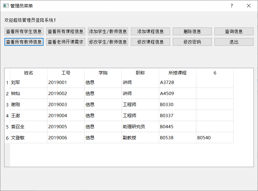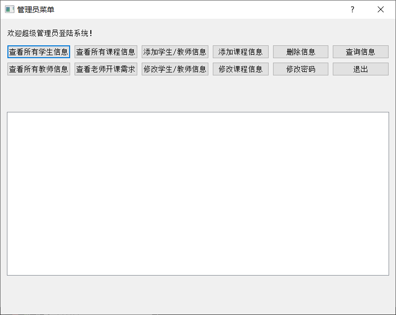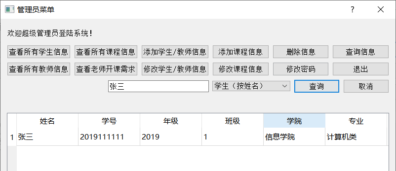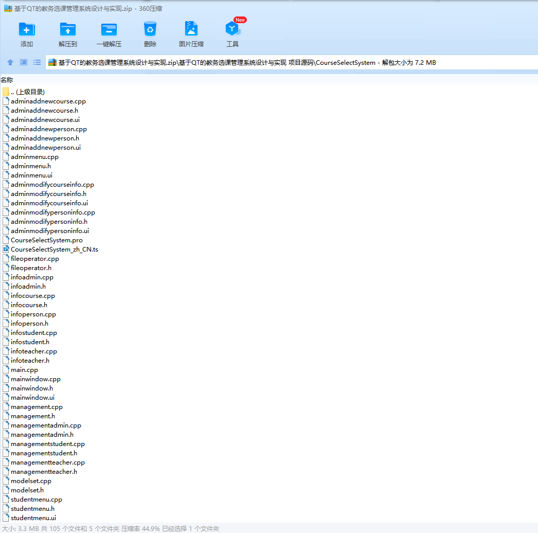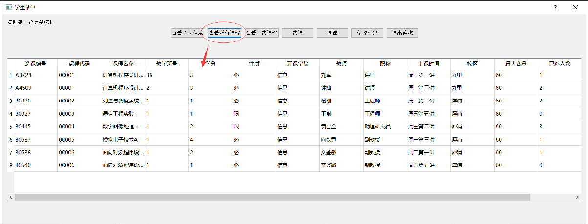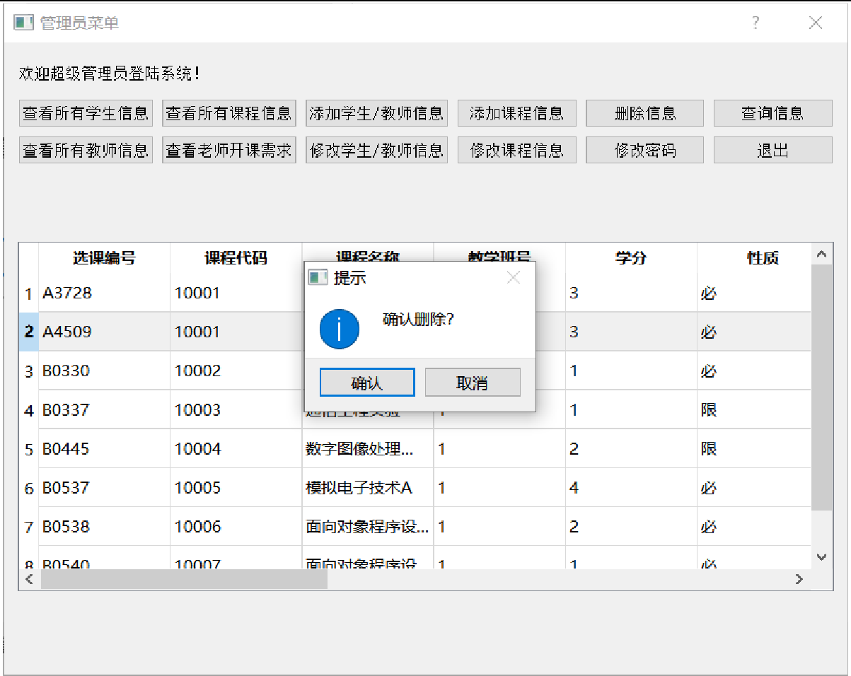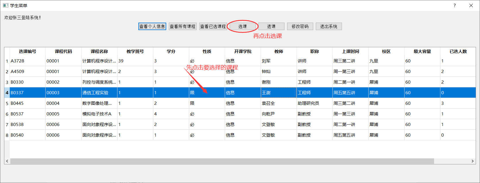 目 录1概述 11.1课程设计目的和意义 11.2课程设计内容 11.3课程设计要求 12系统需求设计 22.1系统目标 22.2系统主要模块流程 22.2.1学生选课、退课 22.2.2教师提交课程、管理员审核 22.2.3管理员相关功能 32.2.4修改密码 42.3系统类分析图 42.3.1继承关系 52.3.2其他类 72.4系统开发环境 73系统详细设计 73.1系统主要功能 73.1.1学生 83.1.2管理员 83.1.3教师 83.2系统设计中类图 93.3系统主要的数据结构及说明 103.3.1学生类定义及说明 103.3.2教师类定义及说明 113.3.3课程类定义及说明 133.3.4管理员类定义及说明 143.3.6 界面设置类定义及说明 173.4继承机制实现 183.5多态机制实现 183.6主要采用的算法 183.6.1排序算法 183.6.2查找算法 193.6.3冲突检测算法 233.7文件结构 243.7.1courseInfo.csv 文件 243.7.2adminInfo.csv 文件 243.7.3stuInfo.csv 文件 243.7.4teacherInfo.csv 文件 243.7.5waitToLoadCourse.csv 文件 254系统主要功能界面 254.1登陆界面 254.1.1主界面 254.2学生菜单 264.2.1主界面 264.2.2查看个人信息 264.2.3查看所有课程 264.2.4查看已选课程 274.2.5 选课 274.2.6 退课 284.2.7修改密码 284.2.8退出系统 294.3教师菜单 294.3.1主界面 294.3.2查看个人信息 304.3.3查看所授课程信息 304.3.4查看选择该课程的学生 304.3.5提交新的课程 314.3.6修改密码 324.3.7退出系统 324.4管理员菜单 324.4.1主界面 324.4.2查看全校学生信息 334.4.3查看全校课程信息 334.4.4查看全校教师信息 344.4.5查看老师开课需求 344.4.6添加学生信息 354.4.7添加课程信息 354.4.8添加教师信息 364.4.9修改学生信息 364.4.10修改课程信息 374.4.11修改教师信息 384.4.12删除信息 394.4.13查询信息 404.4.14修改密码 414.4.15退出系统 415学习总结 41附件――底层完整代码 42面向对象程序设计大作业 第1页1概述1.1课程设计目的和意义根据课程大纲设定,面向对象课程设计的目的是:(1)理解面向对象的基本思想和三大机制,掌握基于 C++语法的面向对象的基本概念和开发模式,熟练运用面向对象思维模式对信息和通信领域的软件系统问题进行建模(对应毕业要求指标点 1.2)。(2)掌握面向对象的程序设计方法和技术,具备以面向对象程序设计模式对开发需求进行分析、设计和调试的能力(对应毕业要求指标点 3.1)。(3)熟练运用基于 C++的面向对象开发环境,为后续其他面向对象编程环境做好铺垫,针对实际需求充分利用现有开发工具的优势和特点解决具体问题,具备对工具的选择和应用的能力(对应毕业要求指标点 5.1)。1.2课程设计内容大一已经过了一半,每次开学或者学期末时候,所有同学都要订下本学期或者下一学期该学的课程内容,因此根据自己了解的场景,完成本学期课程设计:教务选课系统,系统开发内容可以按照以下模式进行:(1)参考学校教务网功能模拟开发选课子系统,要完成基本信息类和业务类的封装(包括必要的构造函数析构函数和返回信息等成员)。编写相应的测试程序对类进行测试。(2)编写相应的管理类。管理功能包括对象的文件存储、对象的获取(构造)、基本统计和分析等。编写相应的测试程序对管理类进行测试。(3)可以将管理类的编写分阶段进行。从学生管理类、课程管理类,最后再编写综合管理类。(4)所有的处理尽可能地封装在类成员中。测试主函数和运行主函数尽量简单。少用或不用主函数以外的外部函数。(5)数据文件可以复制教务网上的数据文件或者建立对应的文本文件保存基本信息类的对象内容,减少甚至杜绝使用 cin 和 cout,改用文件流操作数据。以便为后续升级做准备。(调试时除外)1.3课程设计要求课程设计要求每位同学独立完成具有一定完整性和实用性的面向对象程序。完整体现面向对象三大机制(封装、继承、多态的)综合应用。//接口类,多态(1)根据个人能力独立完成或分组完成。(2)课程设计并非一天能够完成,需做好中间过程的保存和持续进行的工作。2系统需求设计2.1系统目标实现教务系统选课模块的相关功能,具体如下:(1)基本信息管理模块:基本信息(学生类、教师类、课程类)的增删查改以及在界面中的显示、排序、查找(2)选课模块:包含选课和退课两大功能(包含冲突检测)(3)排课模块:教师提交课程、管理员添加课程(4)实现数据以文件的形式读取和写入(5)包含图形界面,界面友好