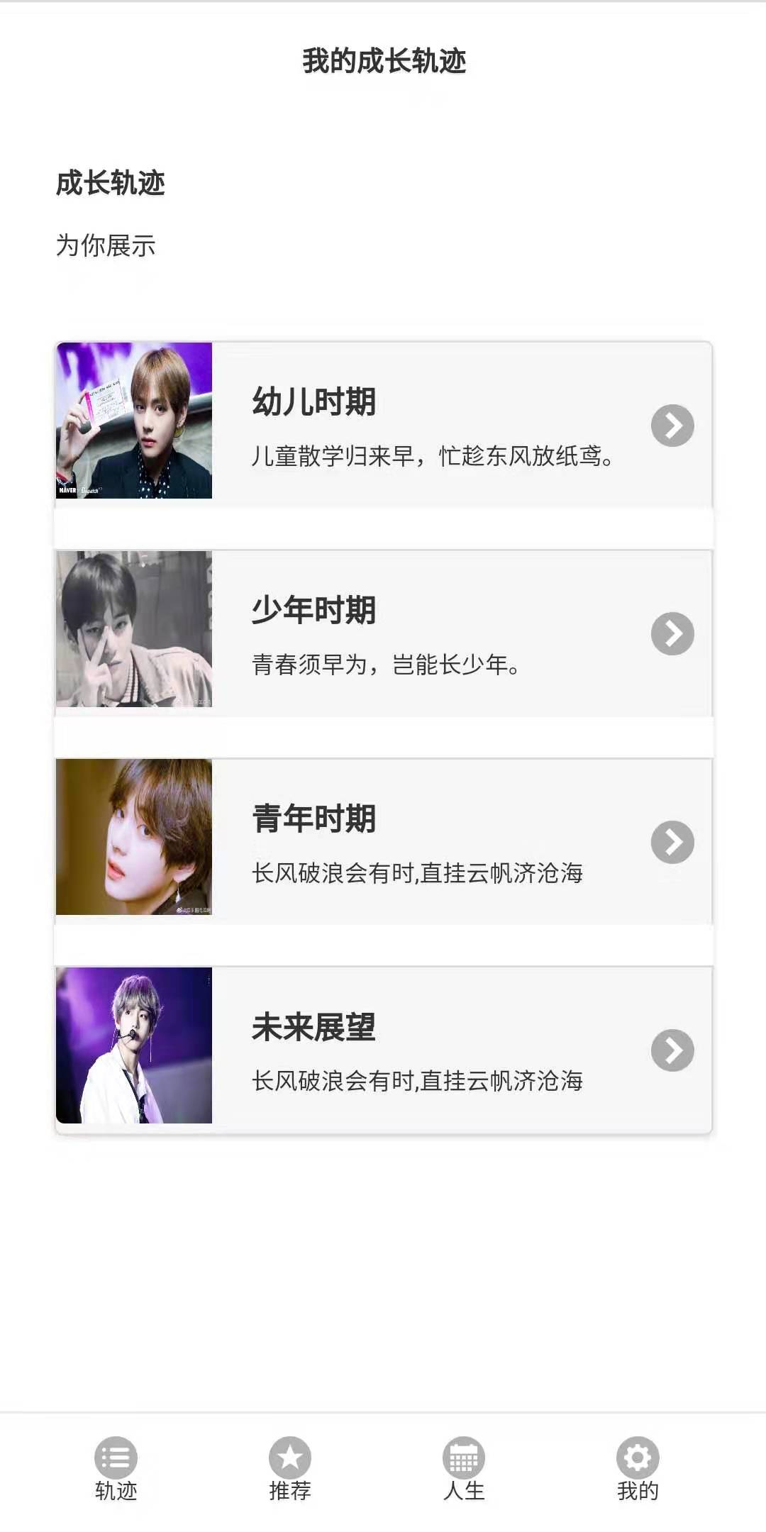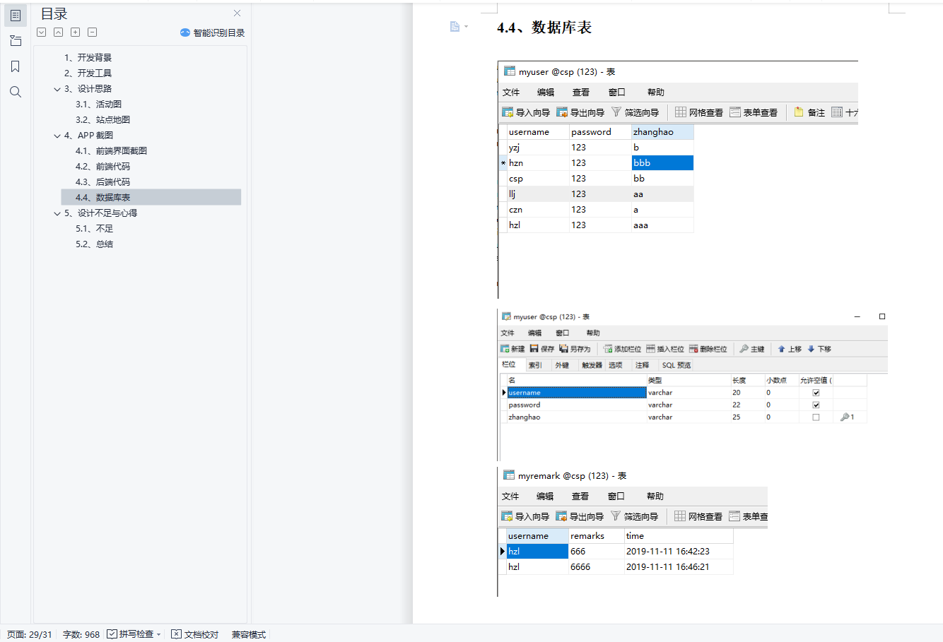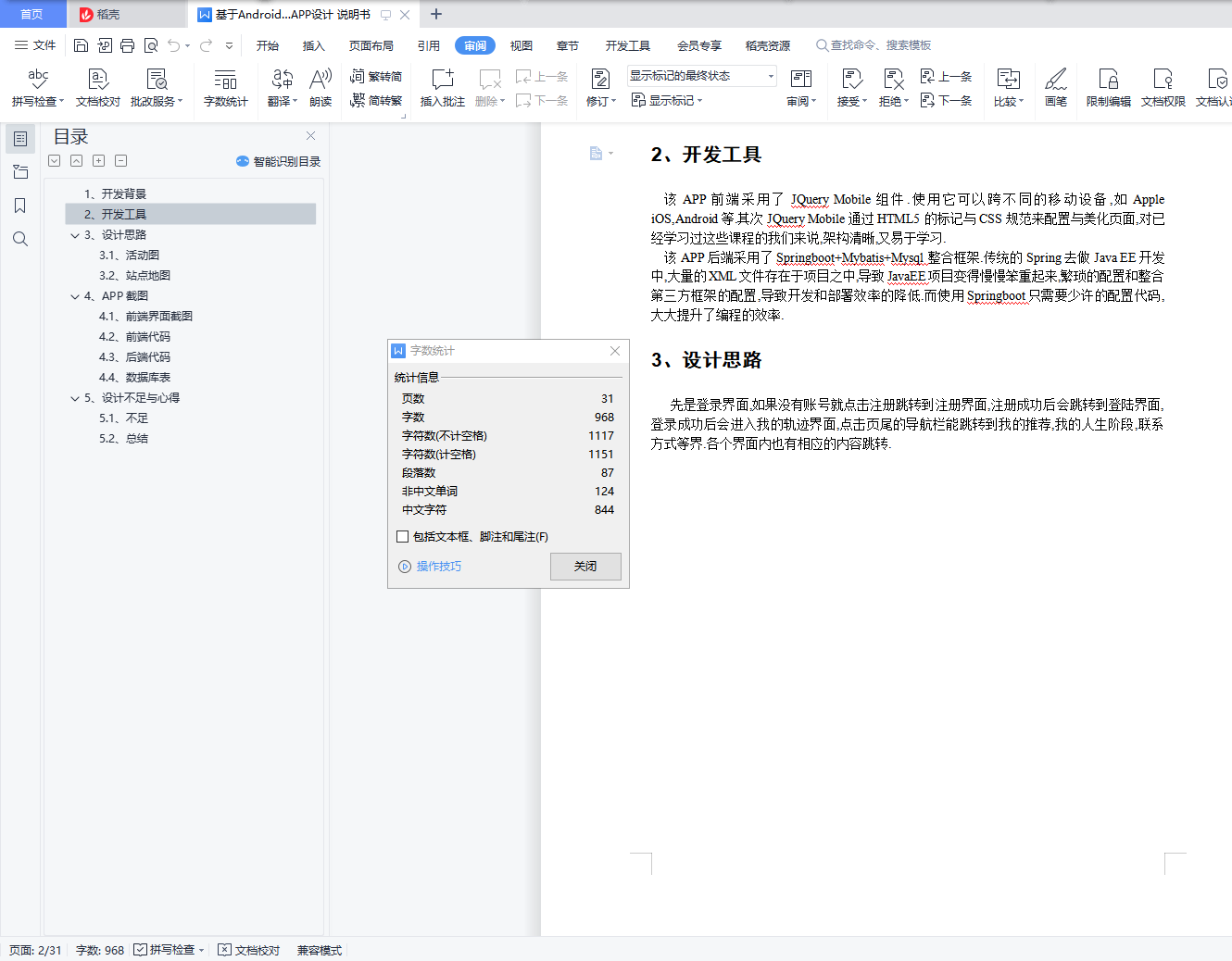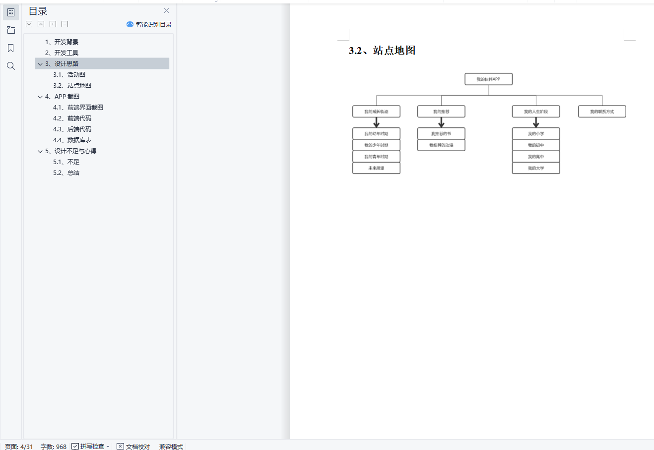 目录1、开发背景 32、开发工具 33、设计思路 33.1、活动图 43.2、站点地图 54、APP截图 64.1、前端界面截图 64.2、前端代码 214.3、后端代码 264.4、数据库表 305、设计不足与心得 325.1、不足 325.2、总结 321、开发背景设计这款APP是为了让使用者能更清楚清晰地全方面了解我这个人.从我的成长经历、人生阶段和我推荐的东西或物品等等.APP中还留有我个人的联系方式,想更深入我的可以联系我.2、开发工具该APP前端采用了JQuery Mobile组件.使用它可以跨不同的移动设备,如Apple iOS,Android等.其次JQuery Mobile通过HTML5的标记与CSS规范来配置与美化页面,对已经学习过这些课程的我们来说,架构清晰,又易于学习.该APP后端采用了Springboot+Mybatis+Mysql整合框架.传统的Spring去做Java EE开发中,大量的XML文件存在于项目之中,导致JavaEE项目变得慢慢笨重起来,繁琐的配置和整合第三方框架的配置,导致开发和部署效率的降低.而使用Springboot只需要少许的配置代码,大大提升了编程的效率.3、设计思路先是登录界面,如果没有账号就点击注册跳转到注册界面,注册成功后会跳转到登陆界面,登录成功后会进入我的轨迹界面,点击页尾的导航栏能跳转到我的推荐,我的人生阶段,联系方式等界.各个界面内也有相应的内容跳转.