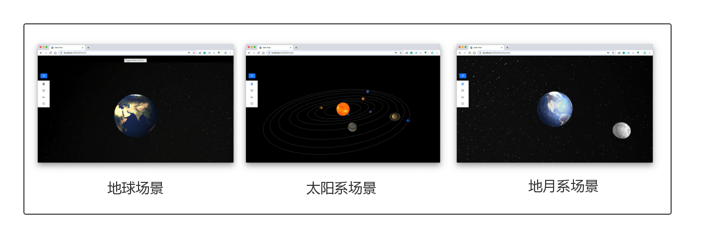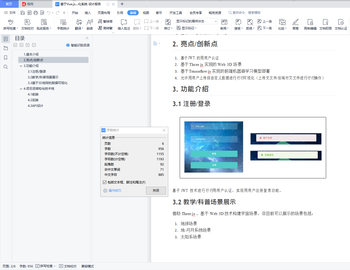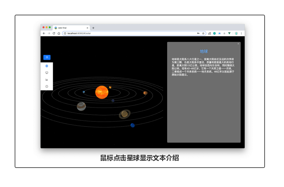 Explore Space 是⼀一款以宇宙空间为主题,应⽤用了了Web 3D、前端机器器学习等新颖 Web 技术,前后端功能完备的 Web 应⽤用。包括以下两⼤大核⼼心功能:适⽤用于教学/科普的模型展示场景基于3D地球的数据可视化2.亮点/创新点1.基于 JWT 的⽤用户认证2.基于 Three.js 实现的 Web 3D 场景3.基于 Tensorflow.js 实现的前端机器器学习模型部署4.允许⽤用户上传⾃自定义数据进⾏行行可视化(上传⽂文件/后端对⽂文件进⾏行行操作)